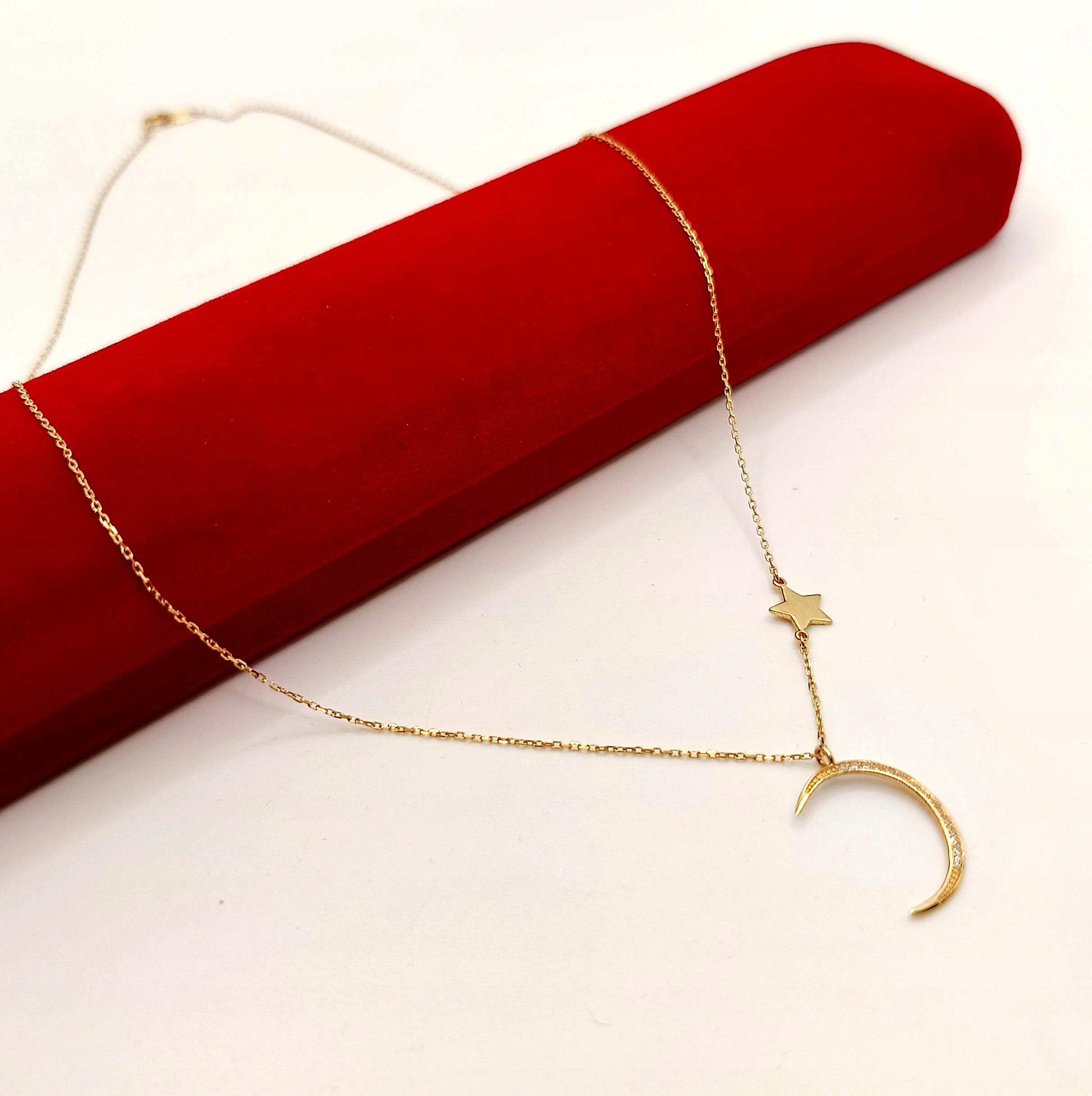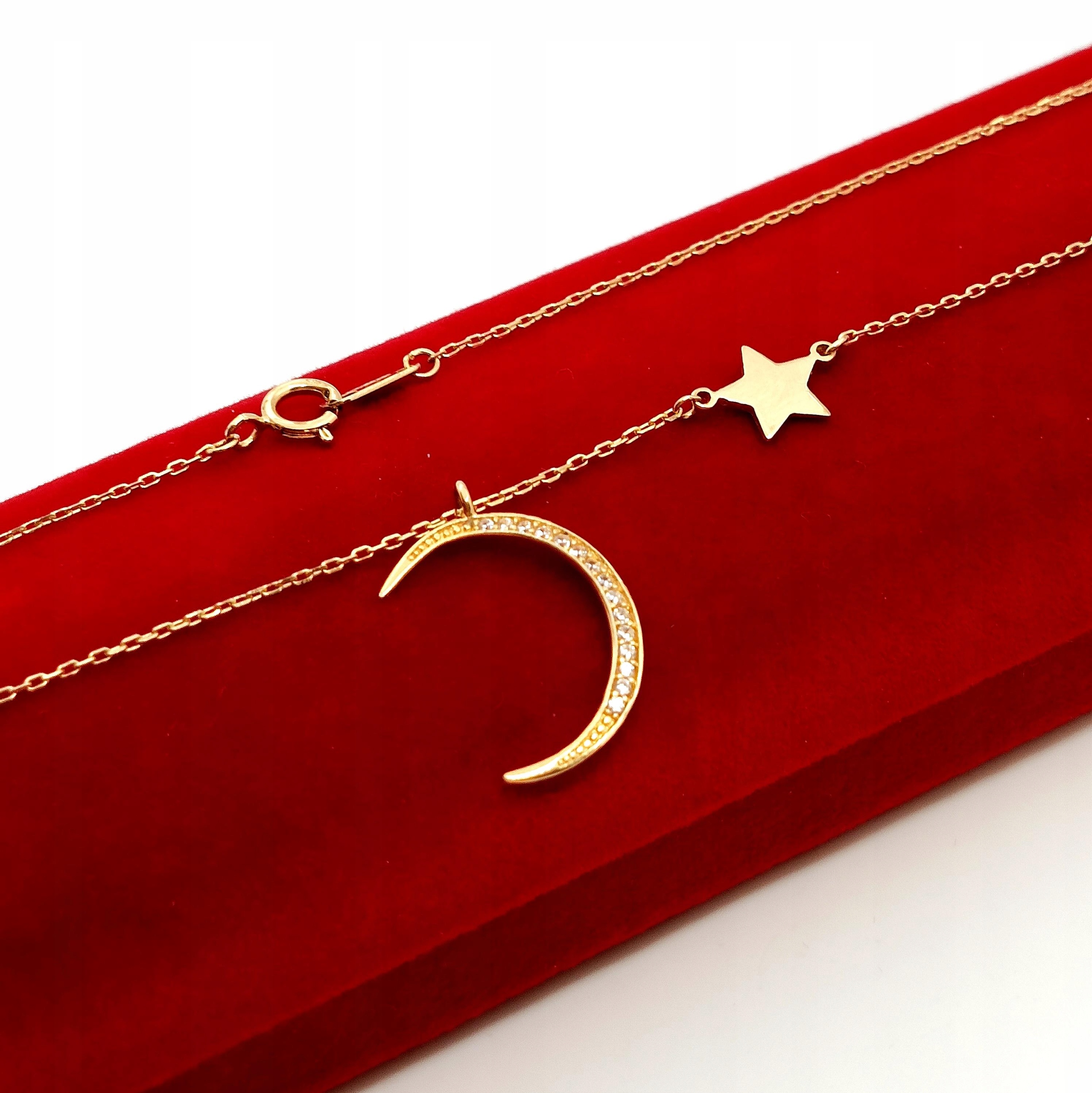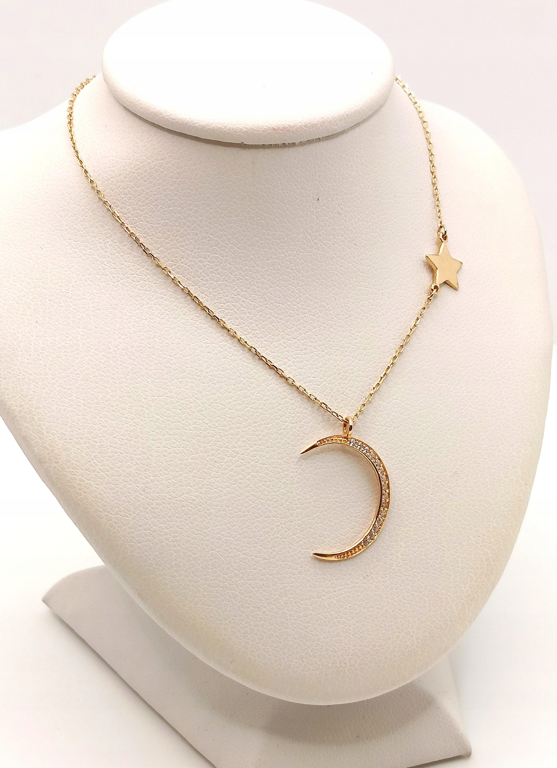 W ofercie na sprzedaż mamy dla Państwa złoty łańcuszek zdobiony księżycem z cyrkoniami oraz gładką gwiazdką.