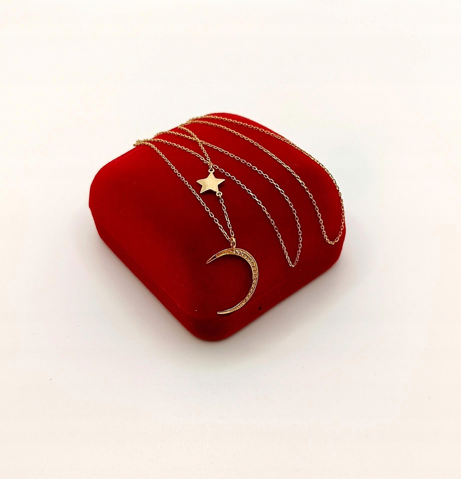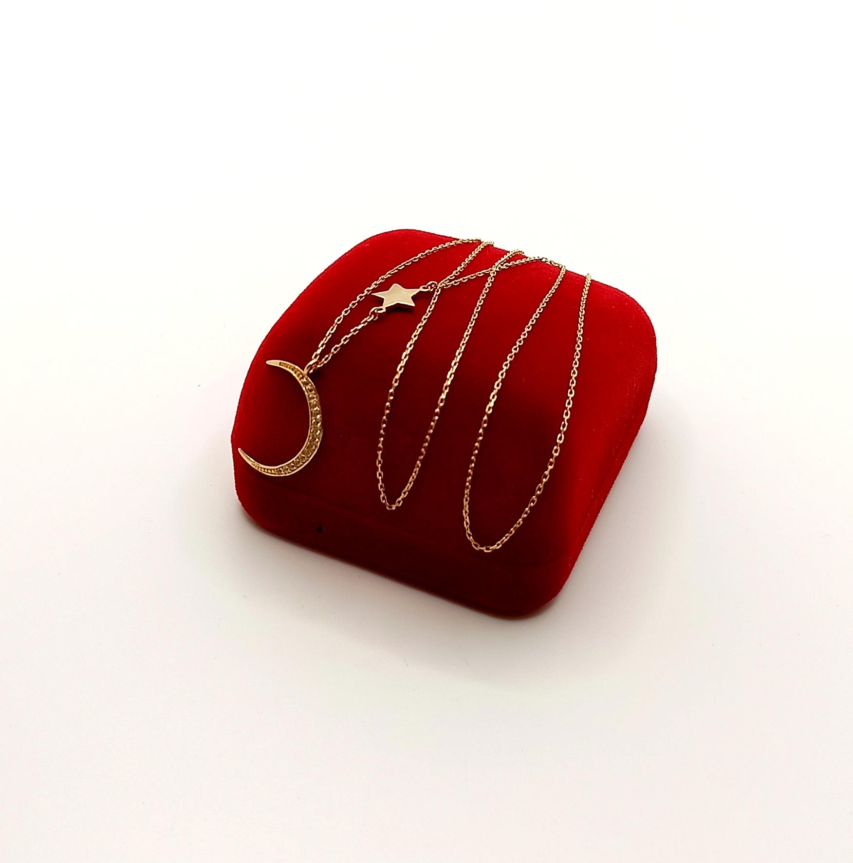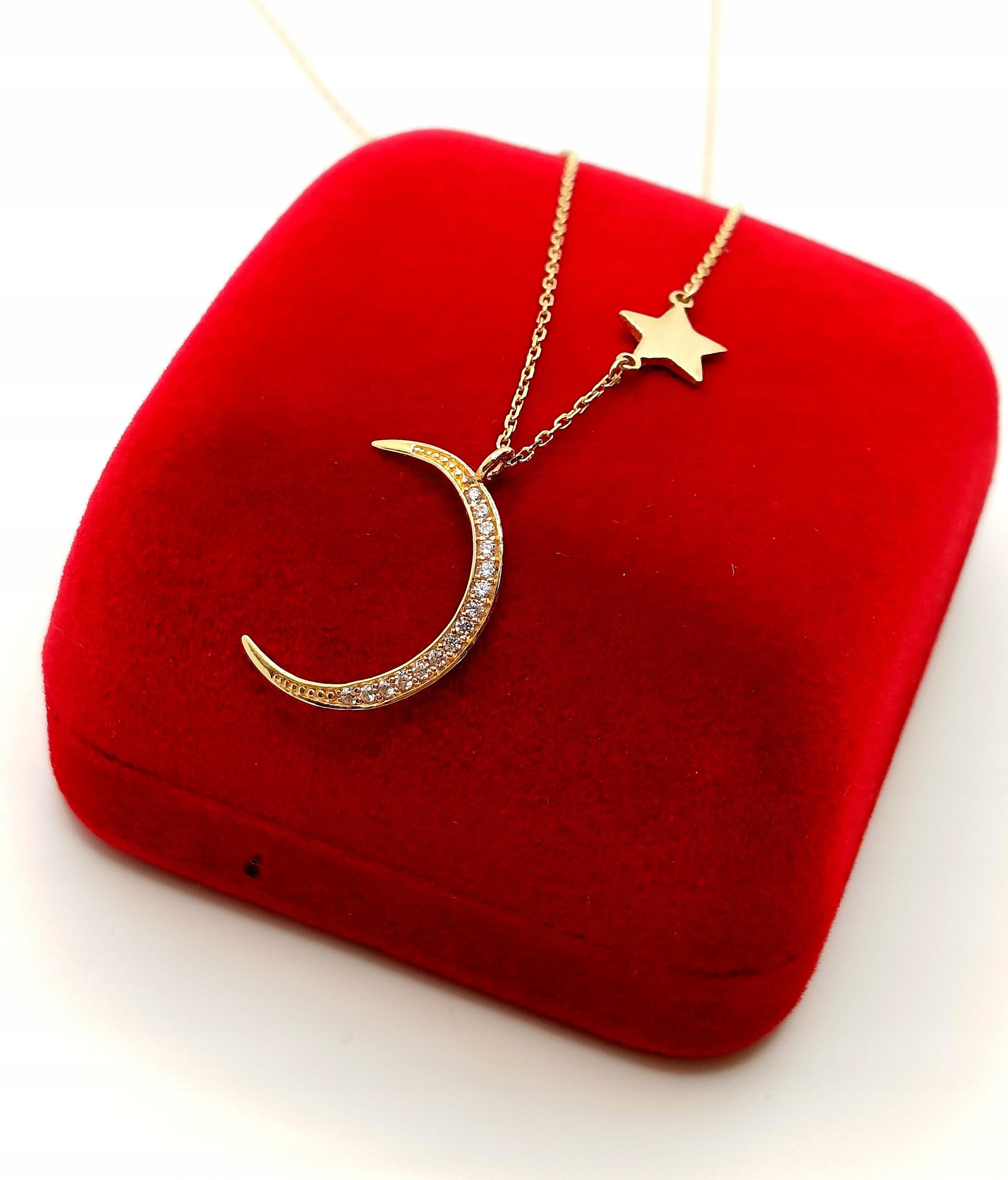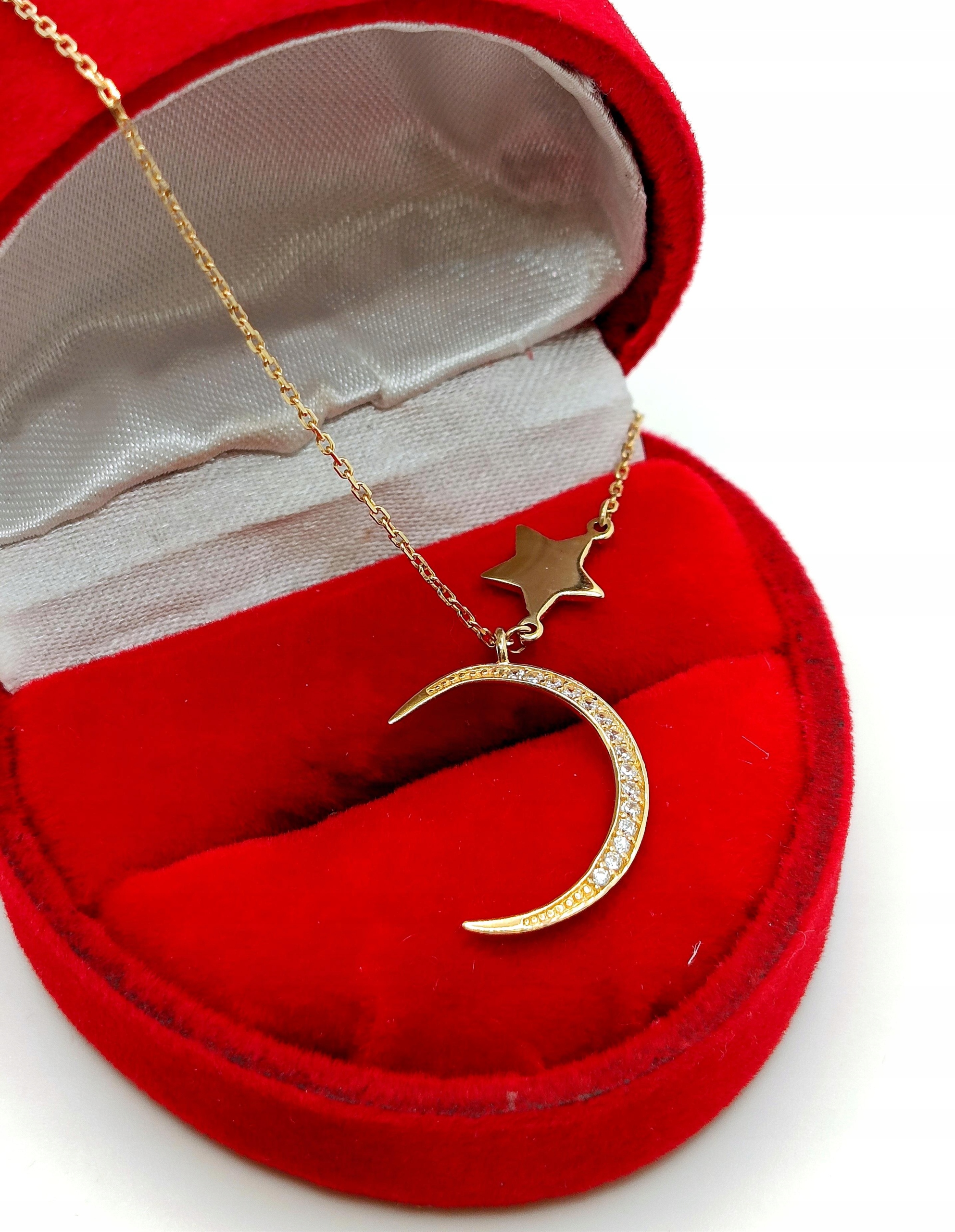 W ofercie na sprzedaż mamy dla Państwa złoty łańcuszek zdobiony księżycem z cyrkoniami oraz gładką gwiazdką.