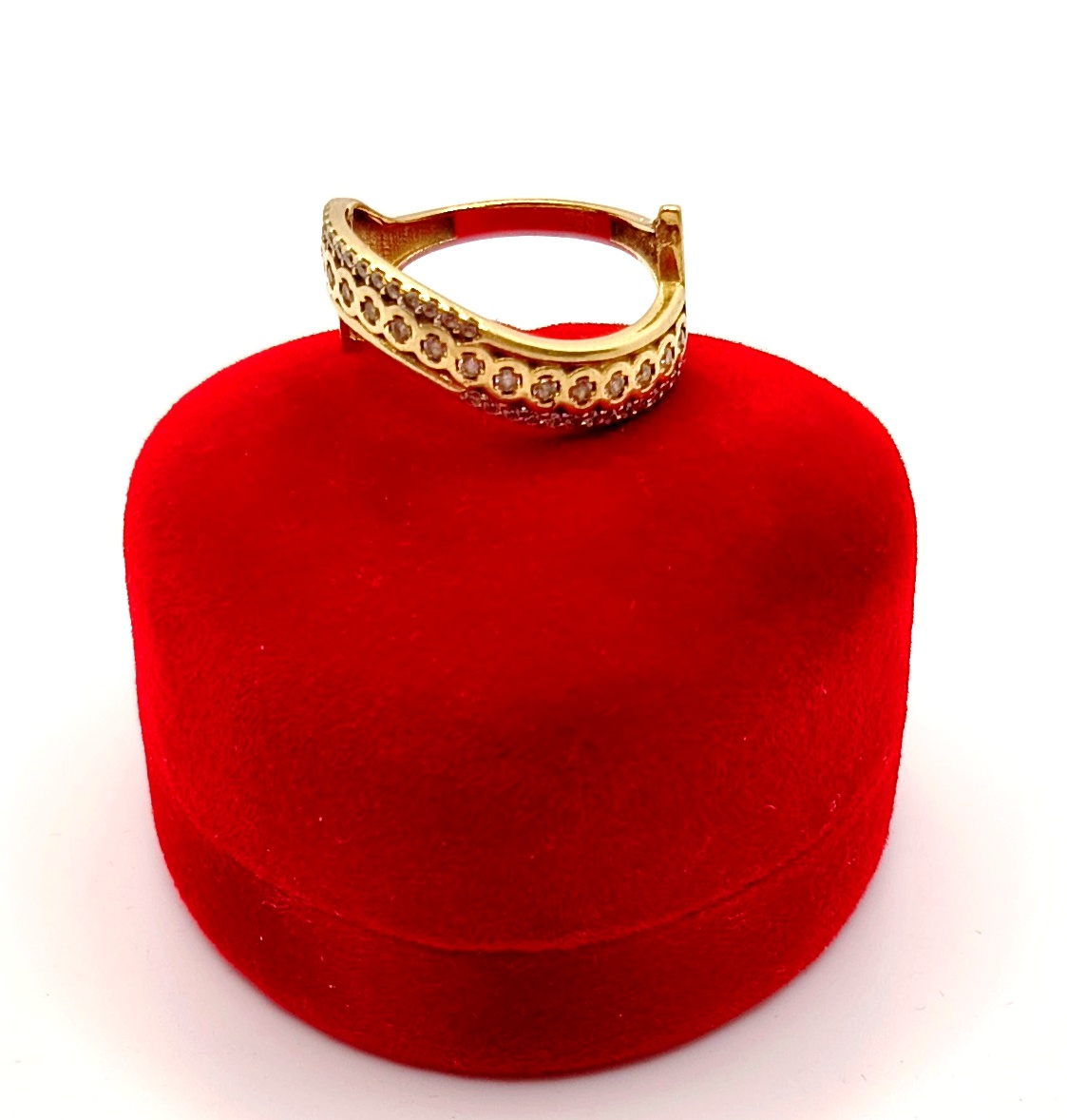 Oferujemy na sprzedaż złoty, asymetryczny pierścionek ozdobiony cyrkoniami.