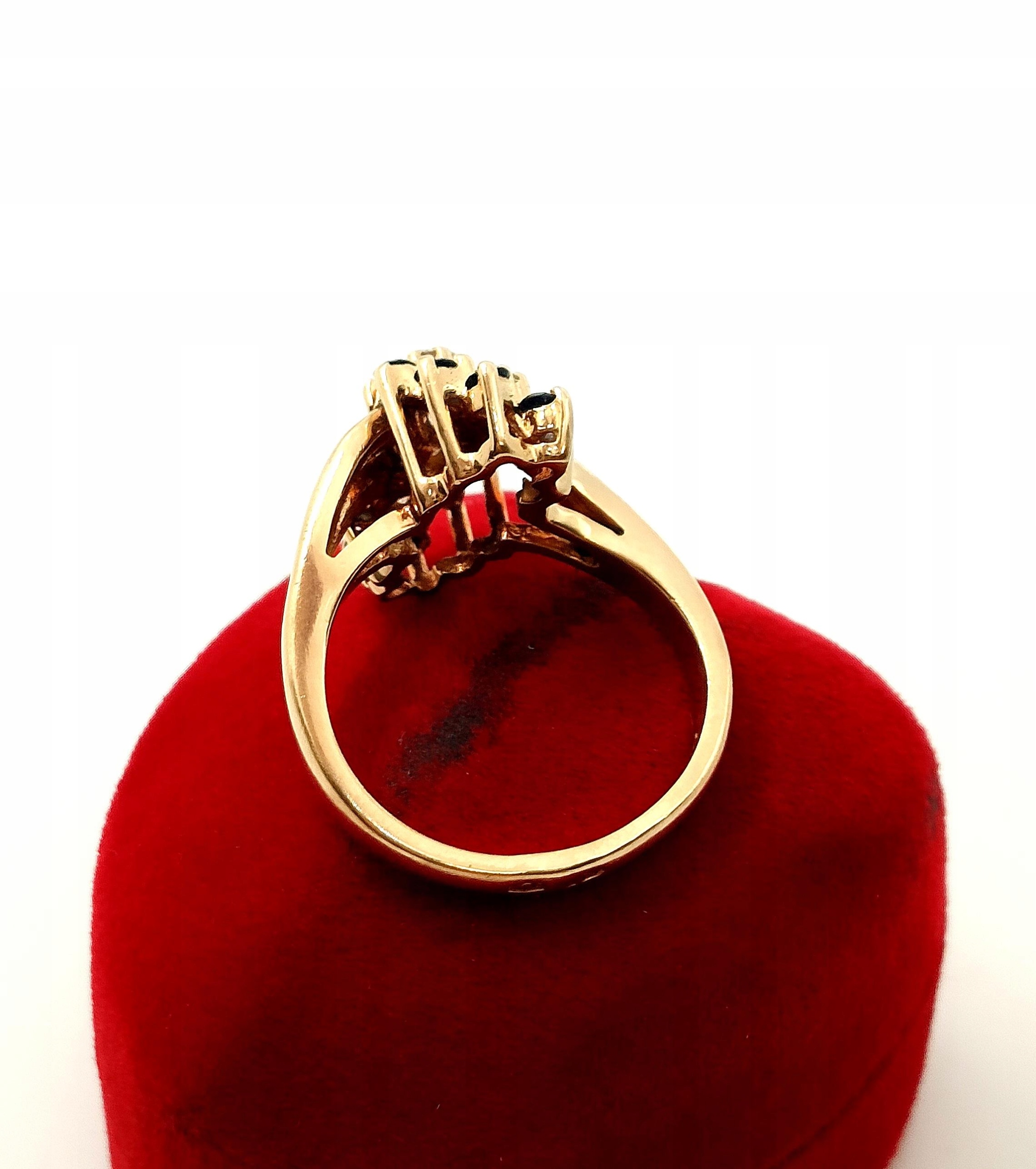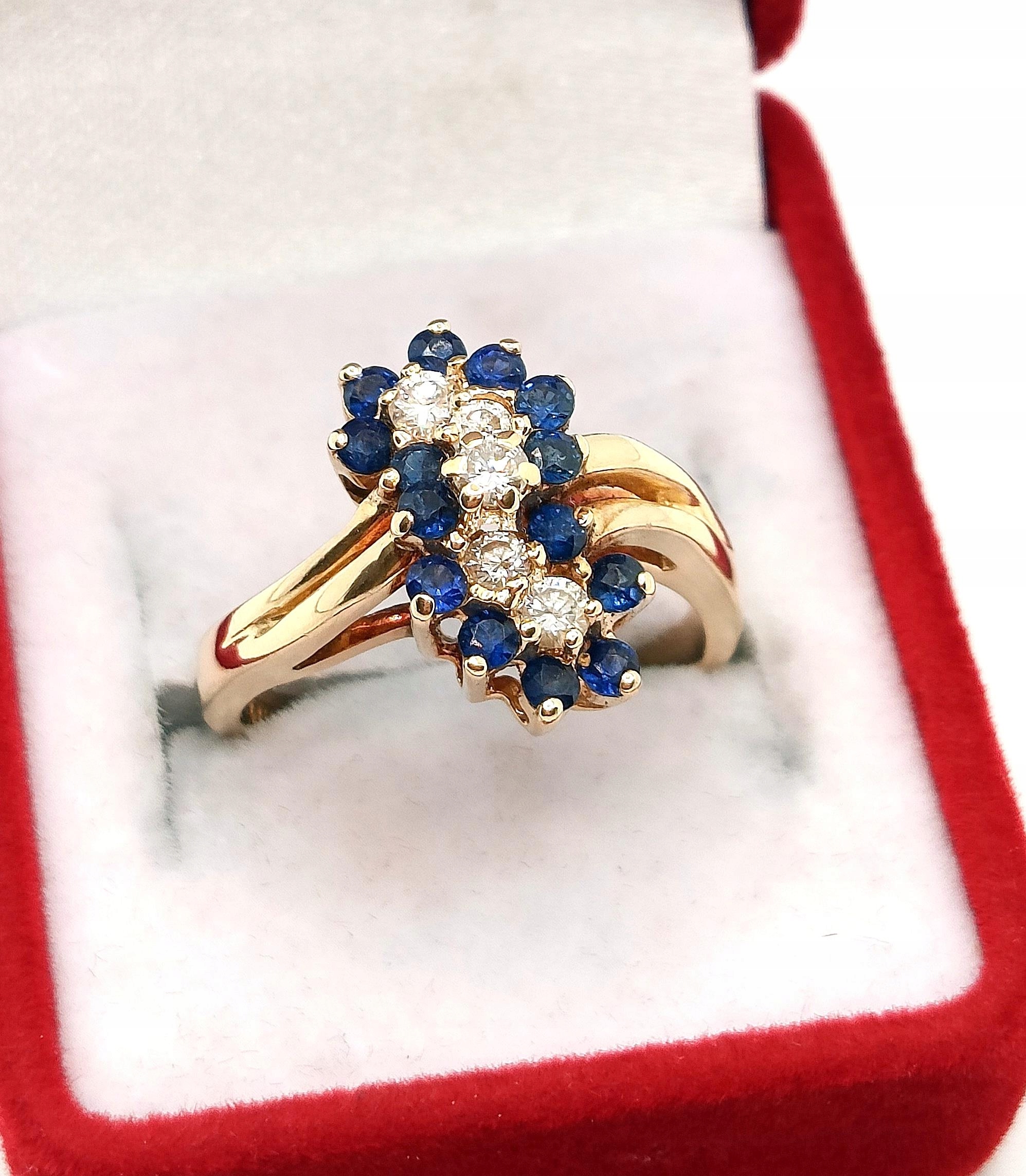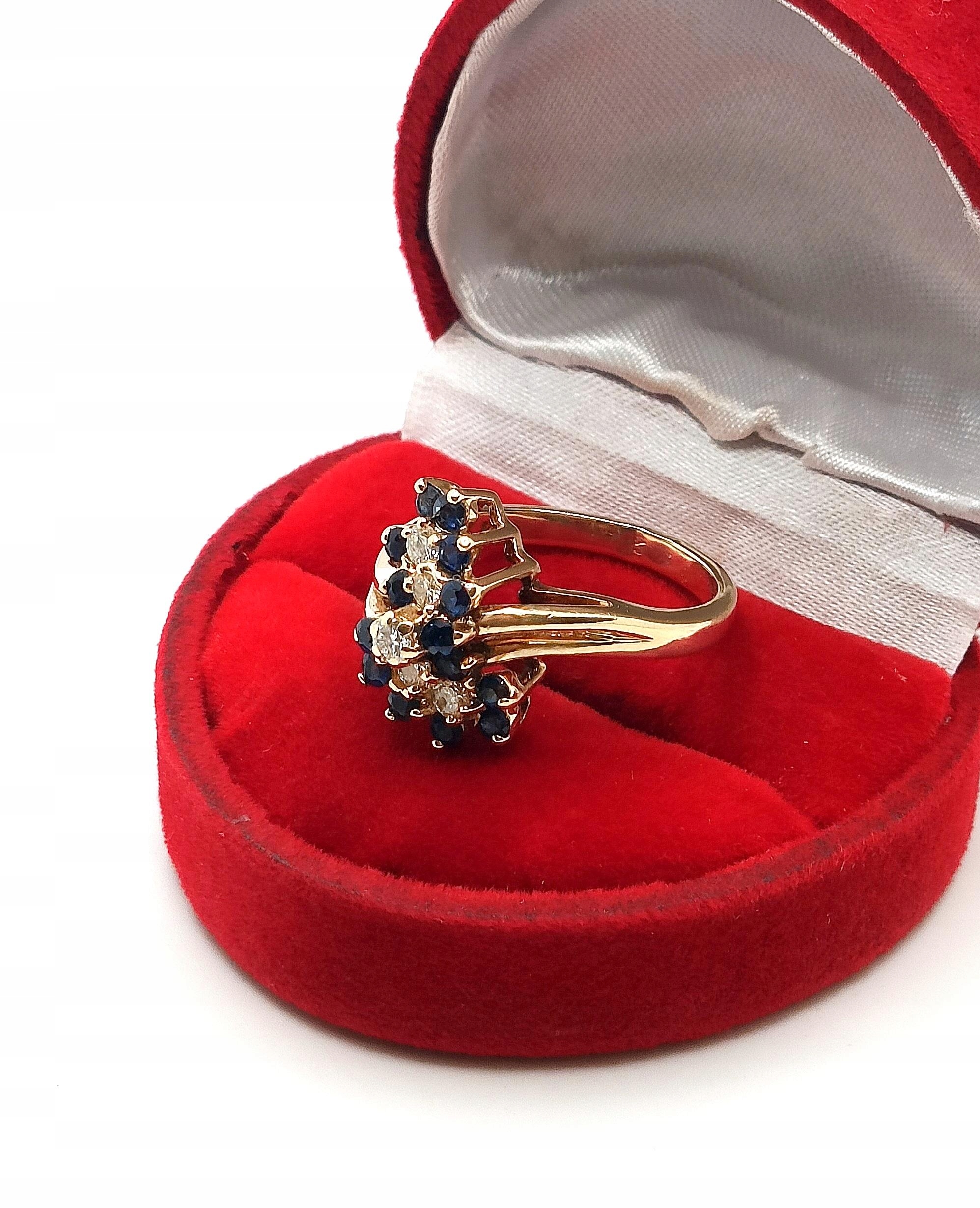 Oferujemy na sprzedaż piękny, złoty pierścionek ozdobiony brylantami i szafirami.