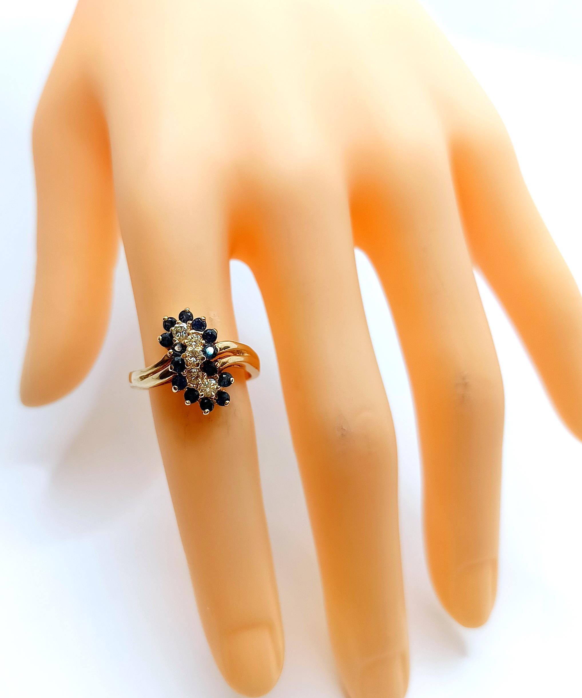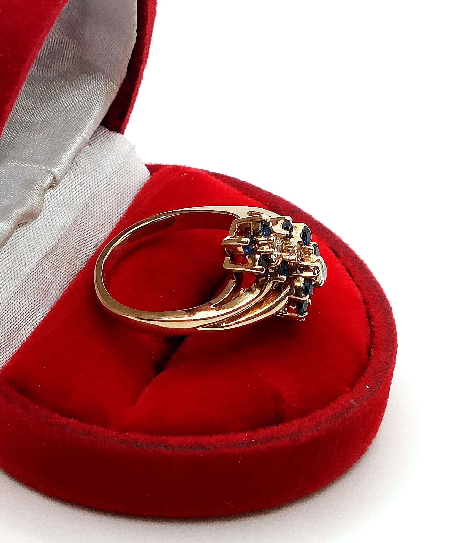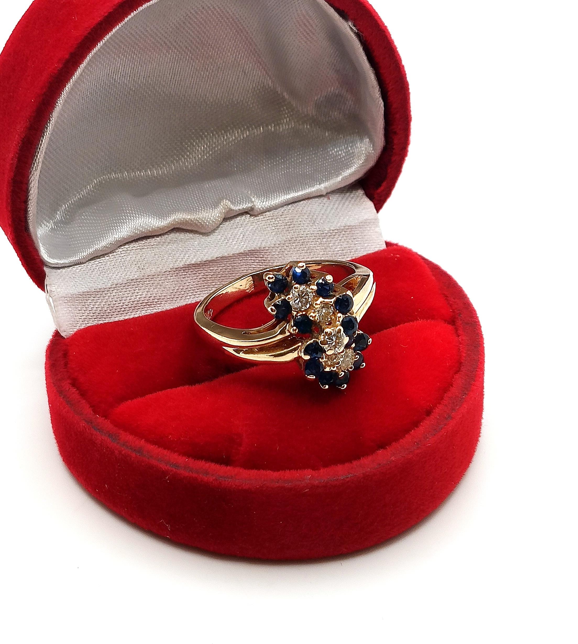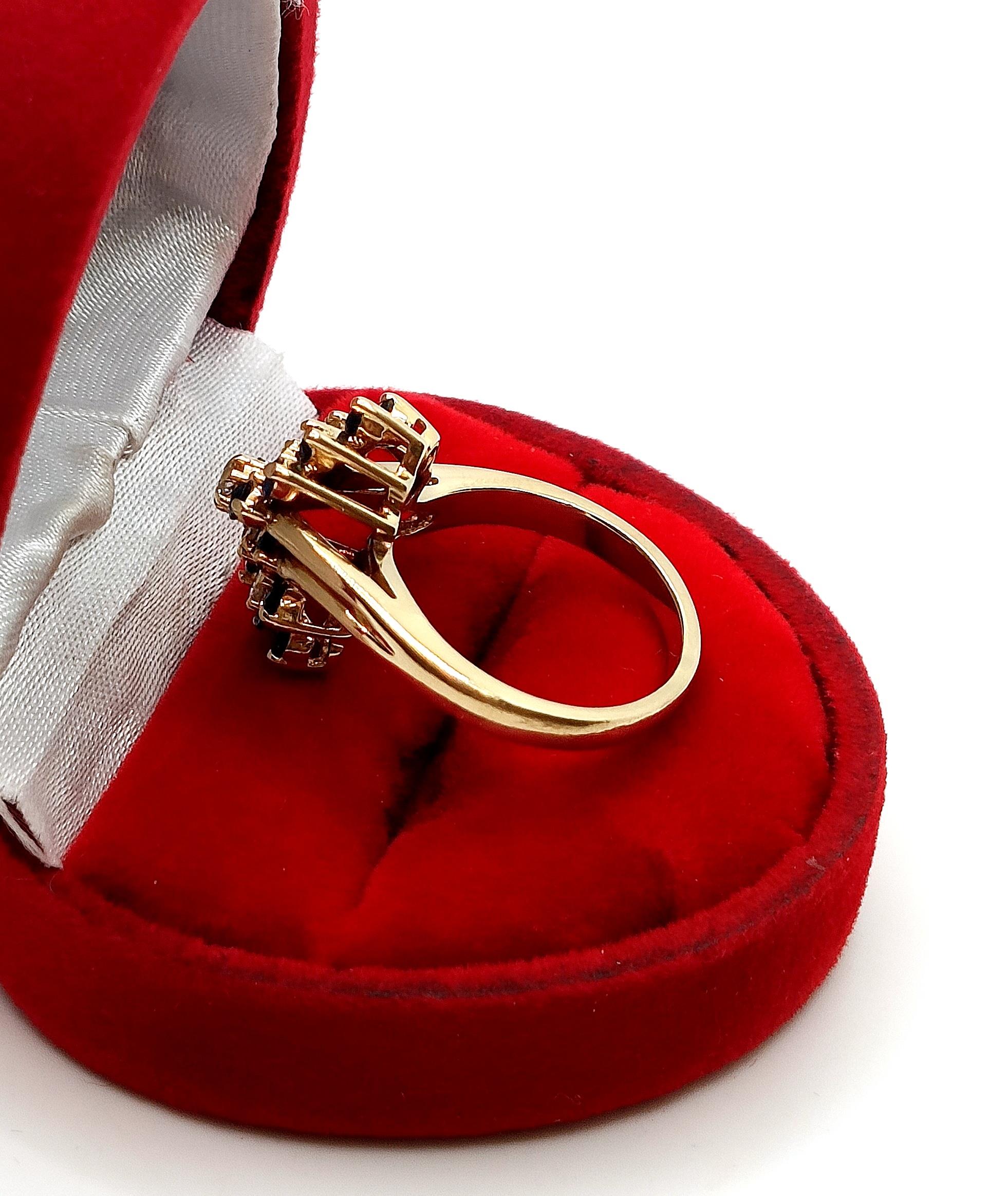 Oferujemy na sprzedaż piękny, złoty pierścionek ozdobiony brylantami i szafirami.