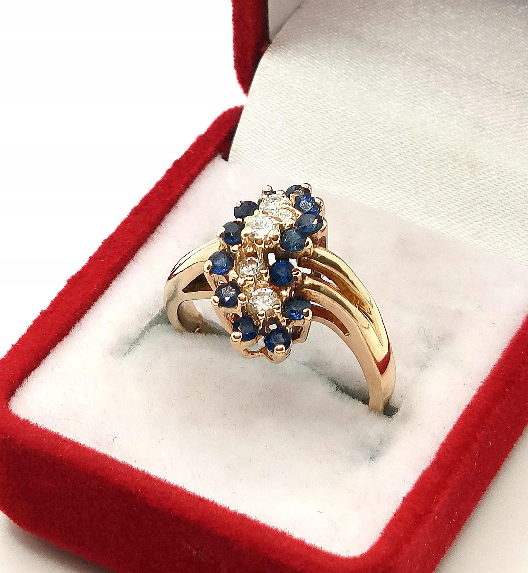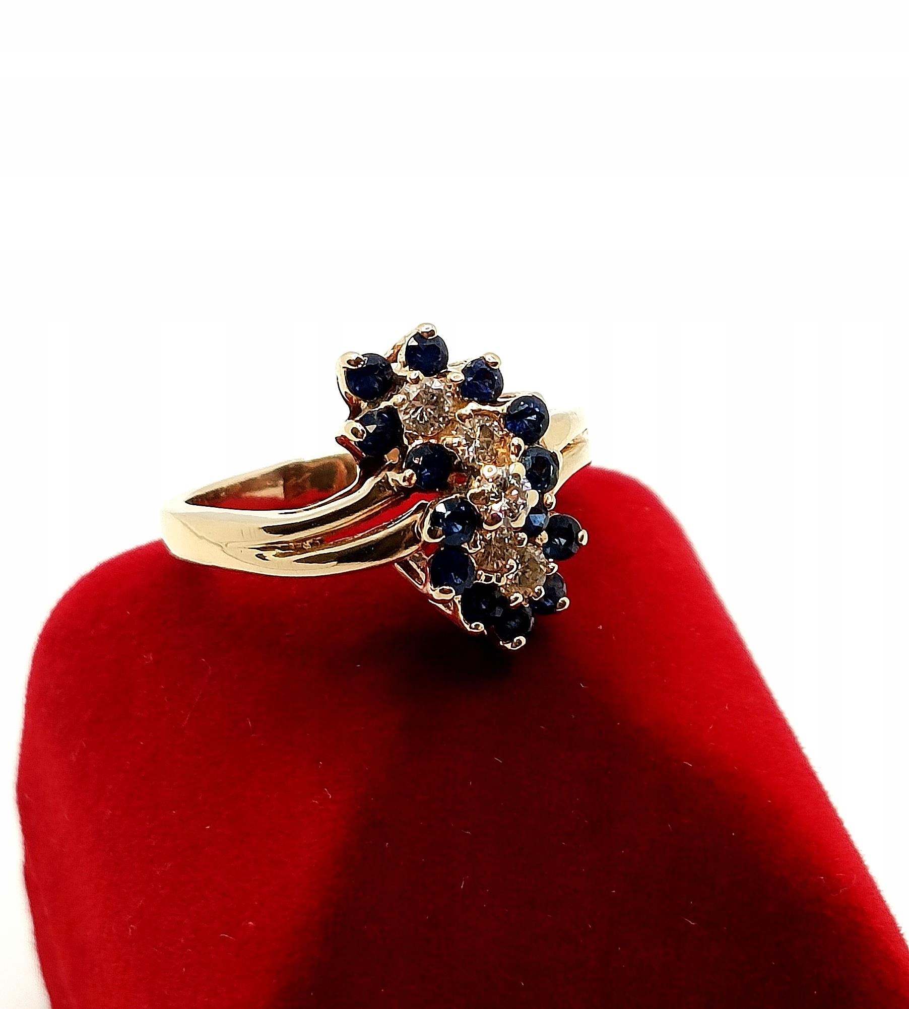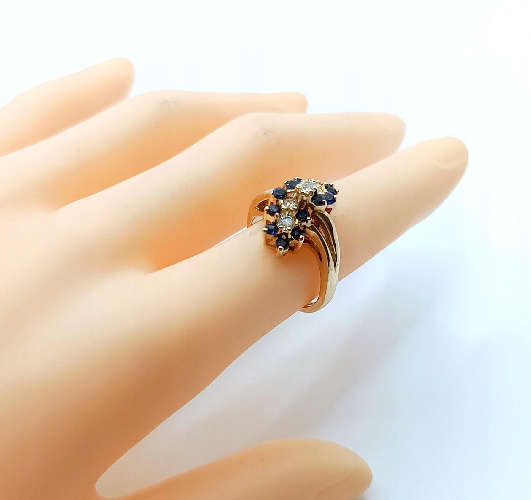 Złoty pierścionek brylanty, szafiry 0,75ct PR.585 W:4,89 gr R.12
