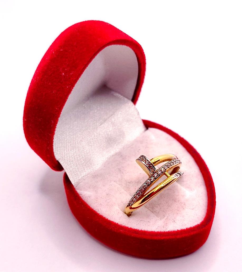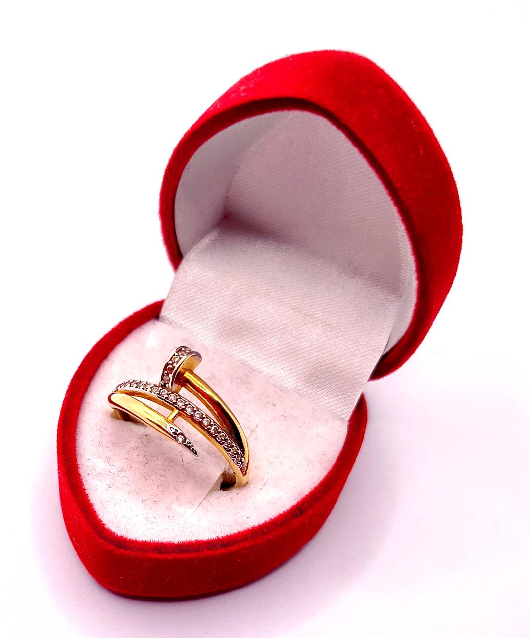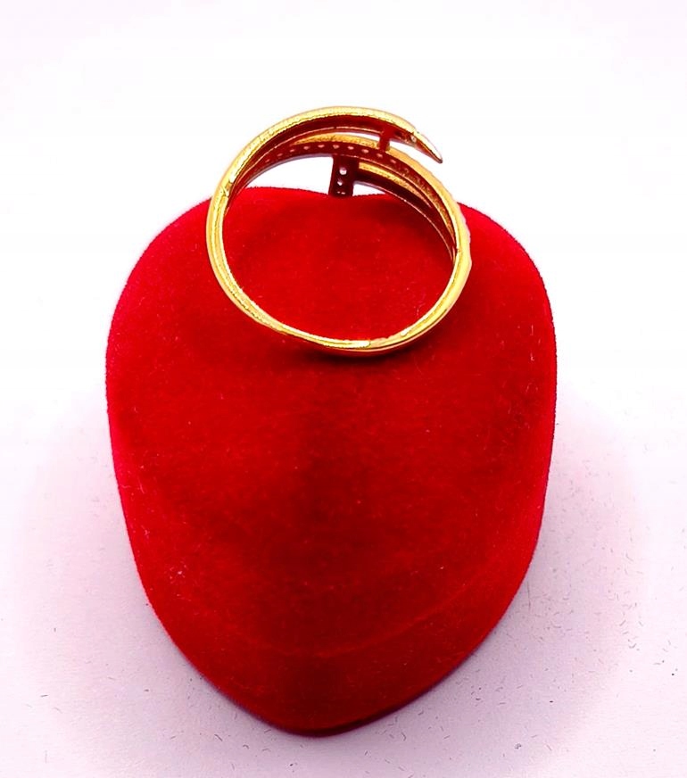 W ofercie sprzedaży posiadamy piękny, złoty pierścionek kształtem przypominający zakręconego gwoździa, ozdobionego diamentami.