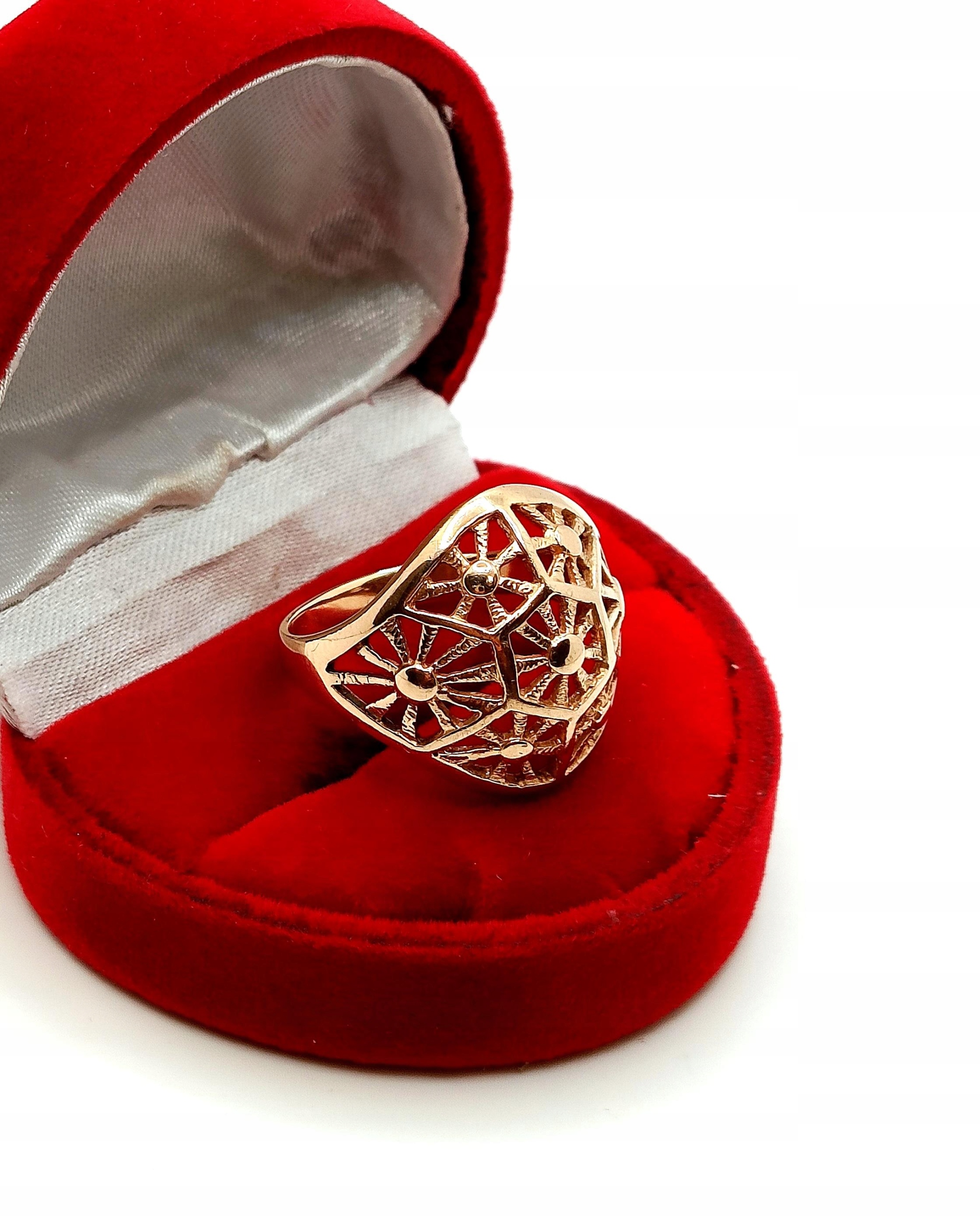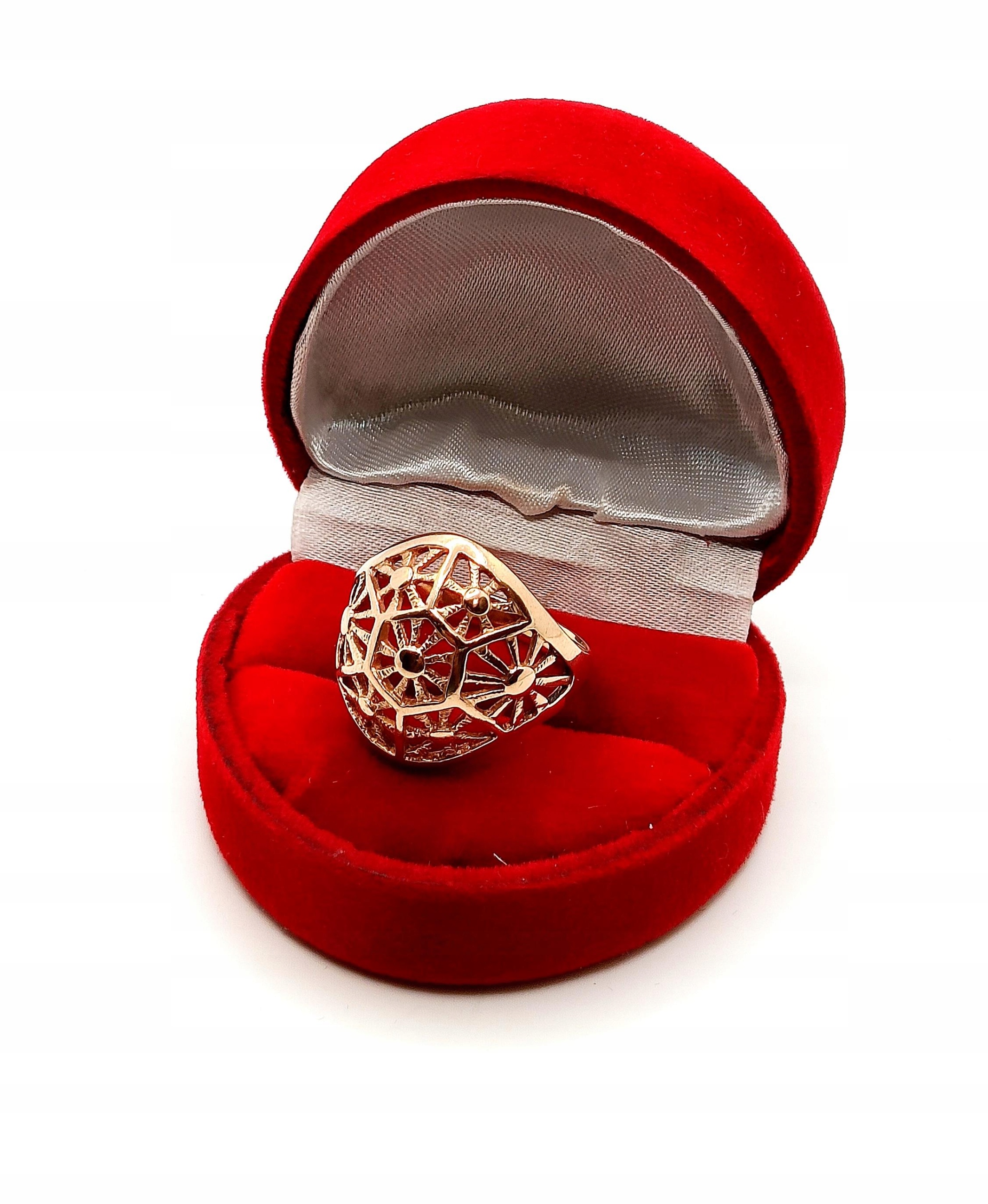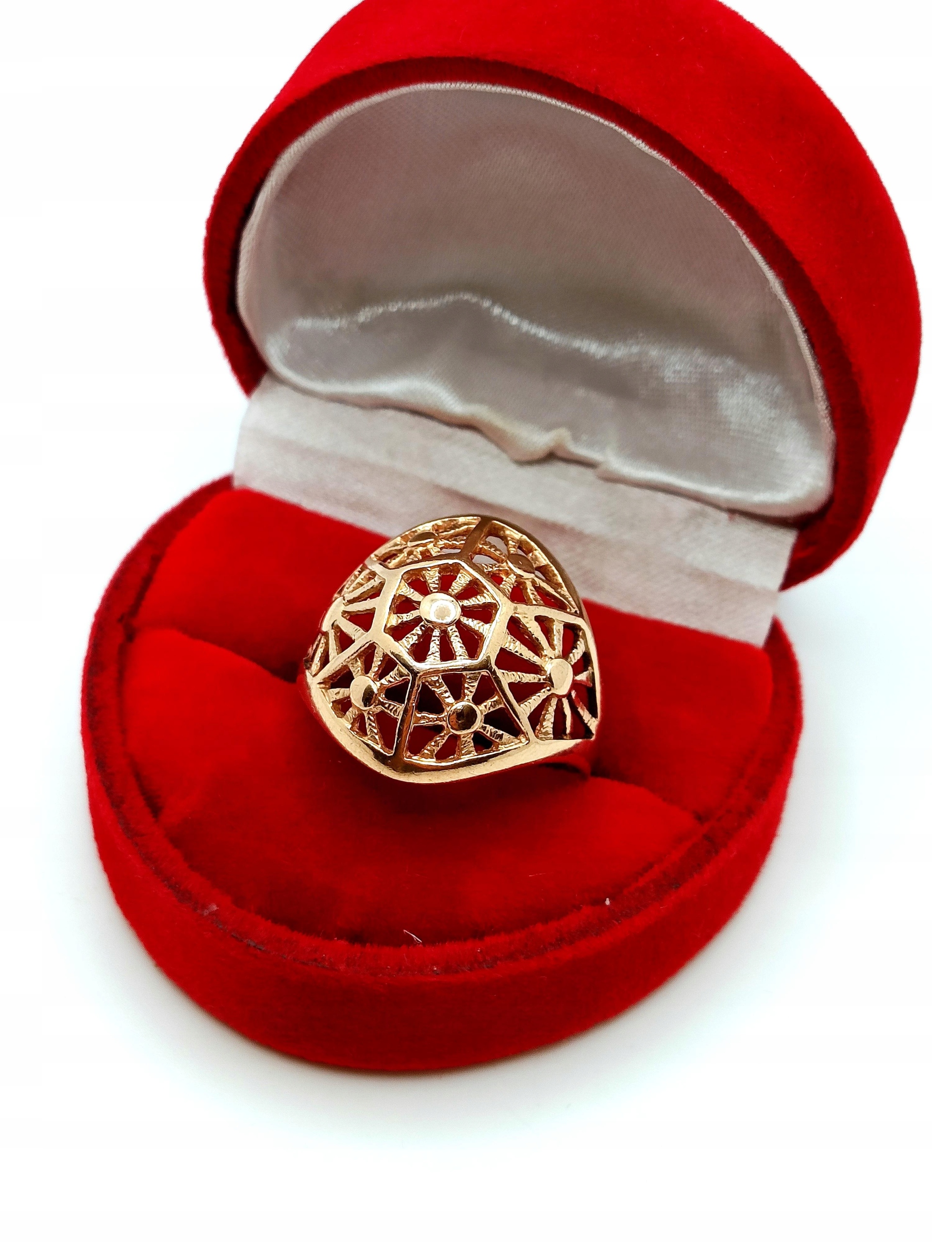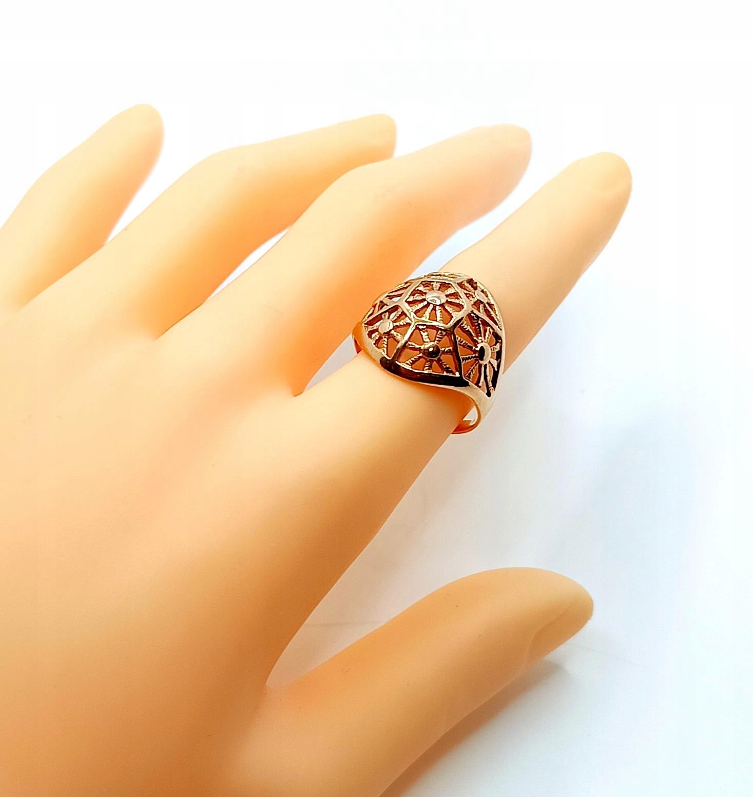 Oferujemy na sprzedaż złoty pierścionek z piękną ażurową kopułką o symetrycznych wzorach.