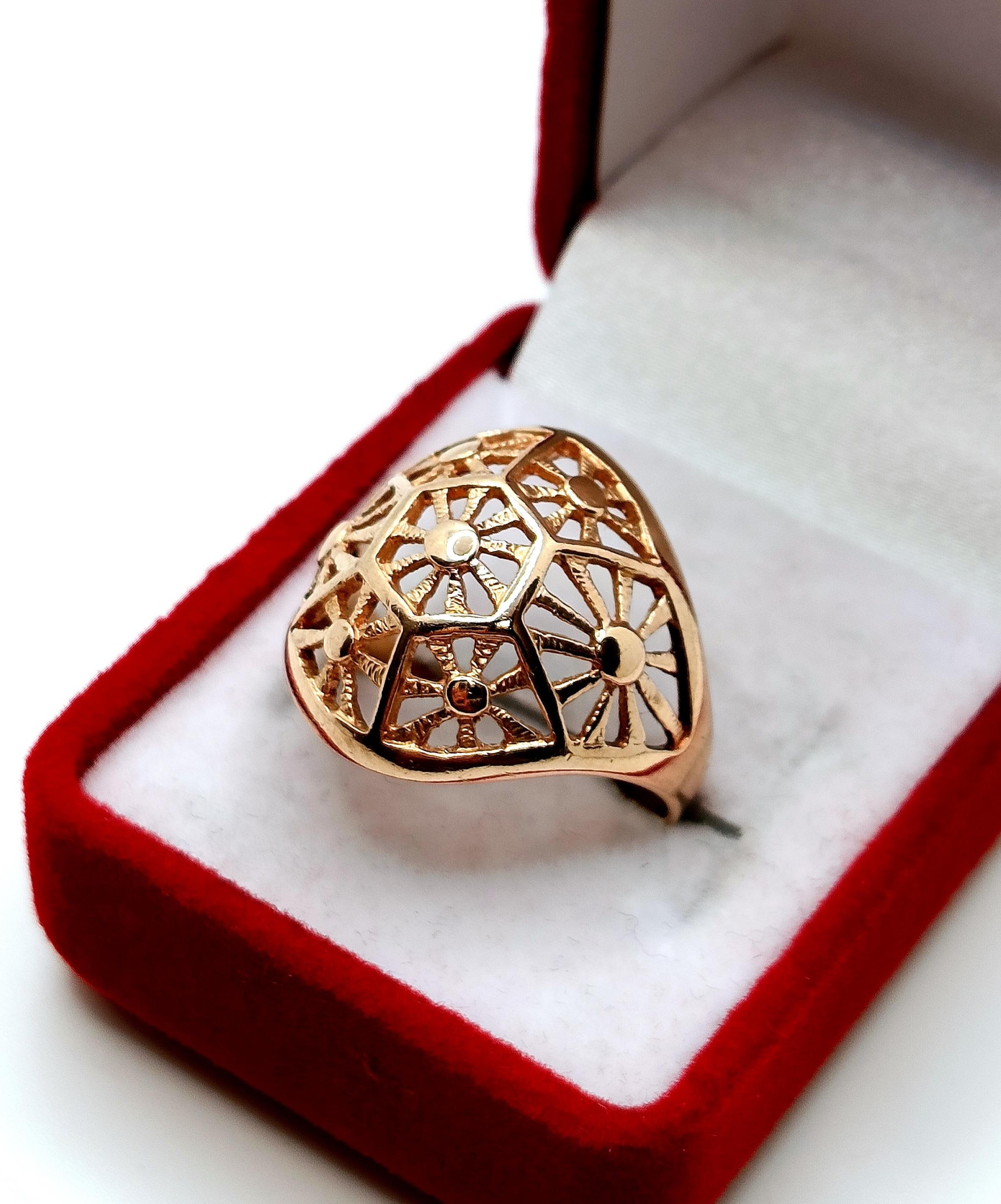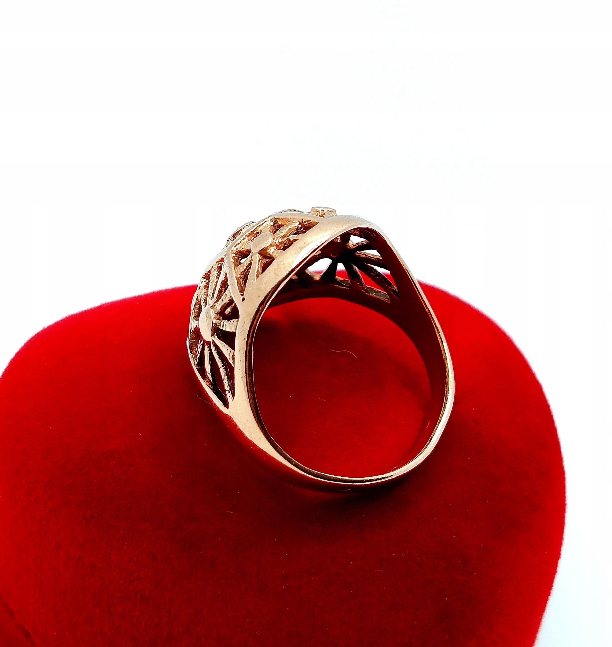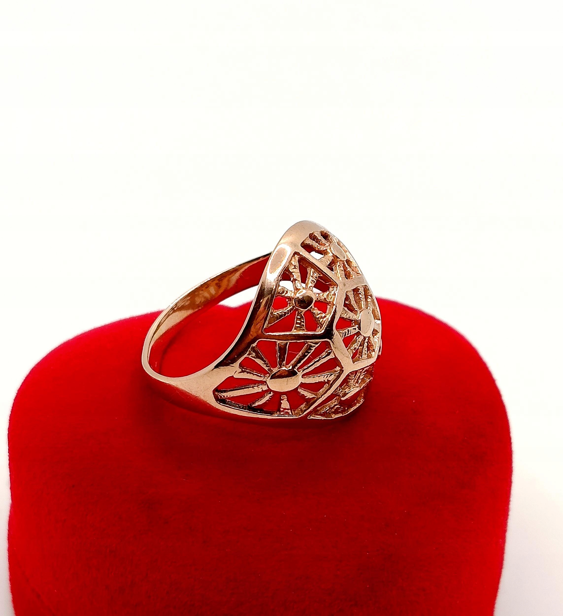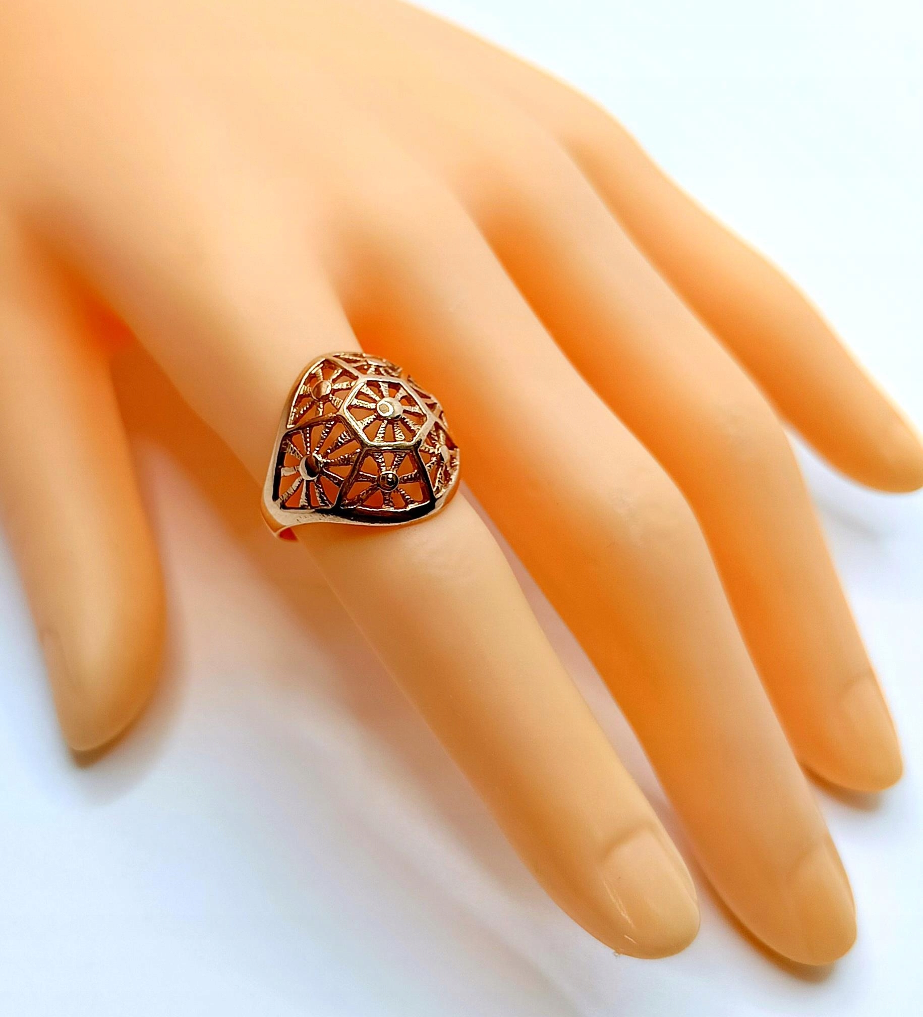 Oferujemy na sprzedaż złoty pierścionek z piękną ażurową kopułką o symetrycznych wzorach.