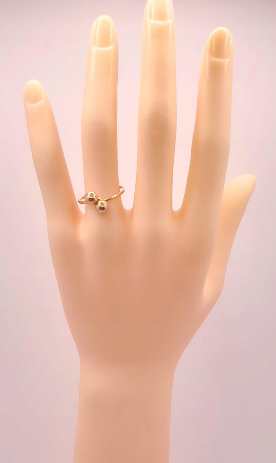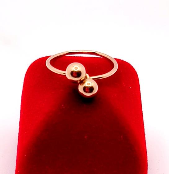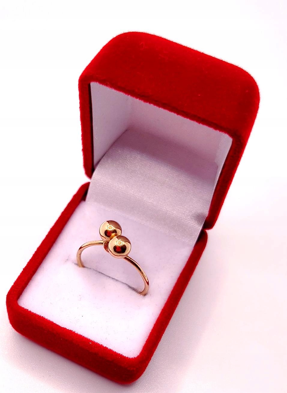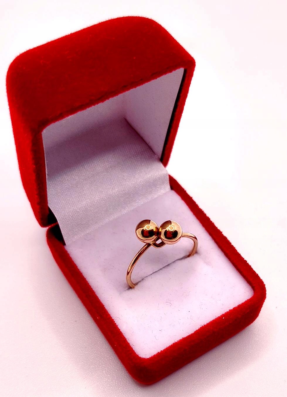 W ofercie sprzedaży posiadamy piękny, złoty pierścionek ozdobiony dwoma kulkami.