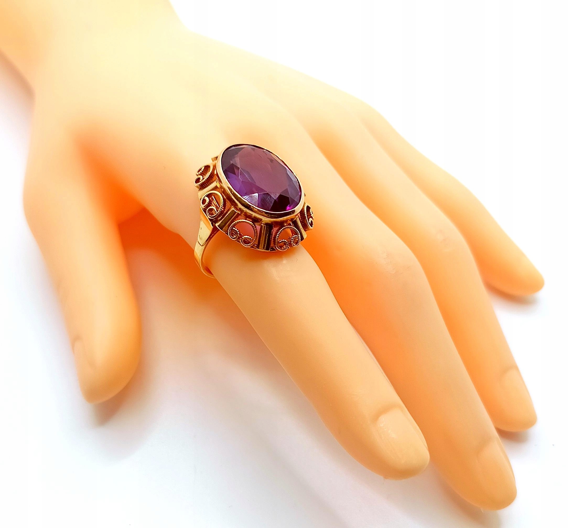 W ofercie na sprzedaż mamy dla państwa złoty pierścionek typu landryna, zdobiony okazałym Ametystem.