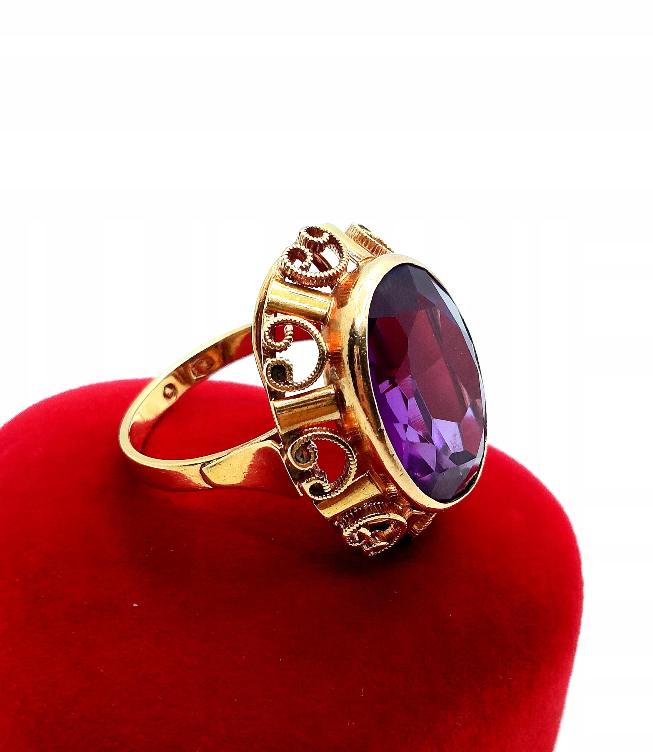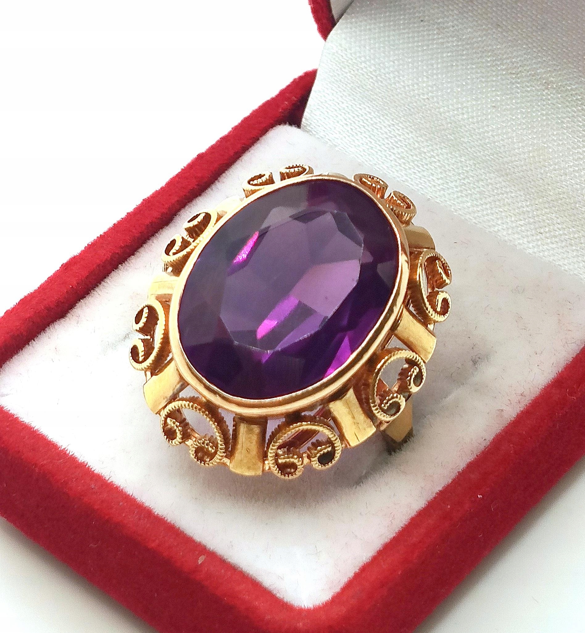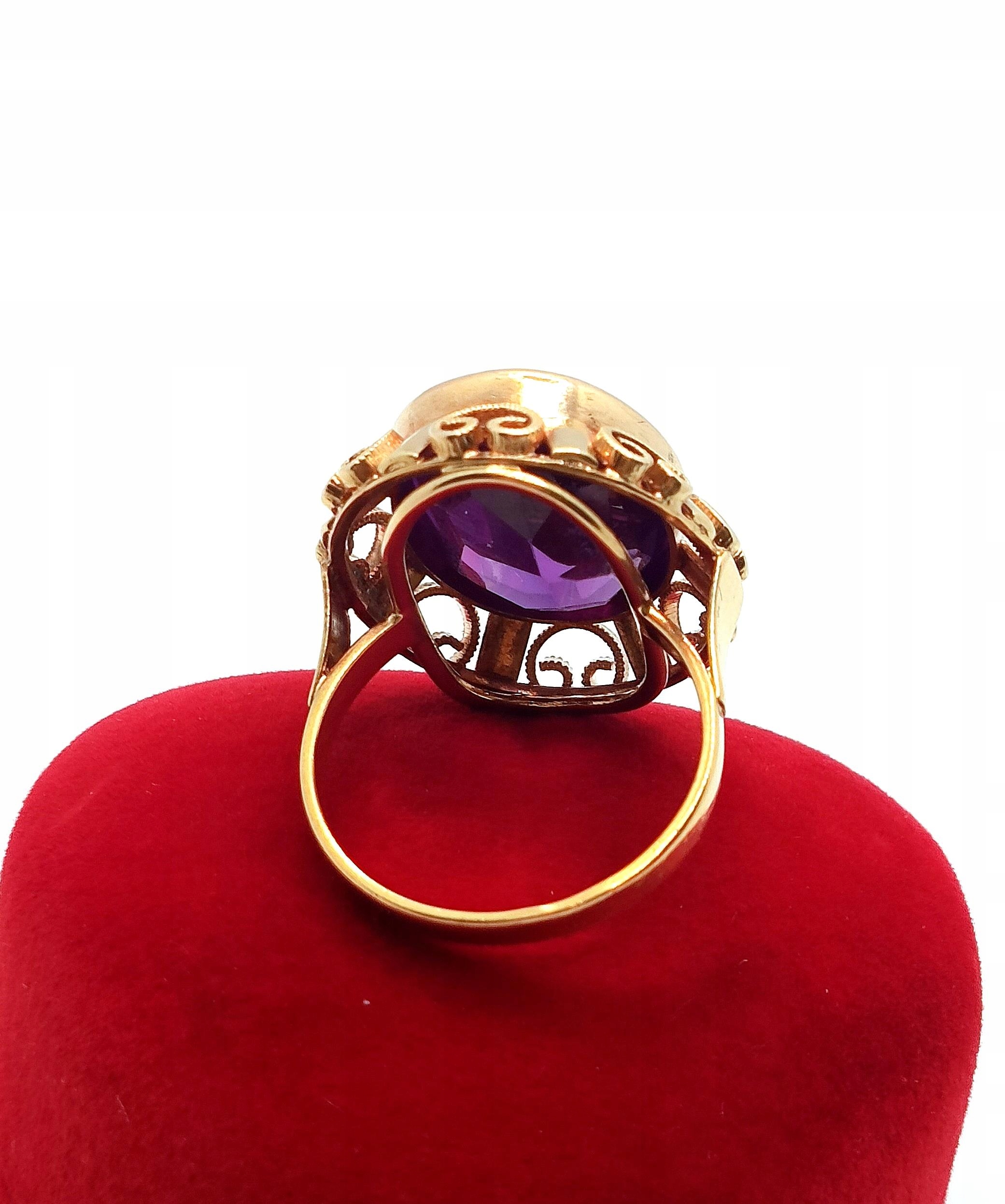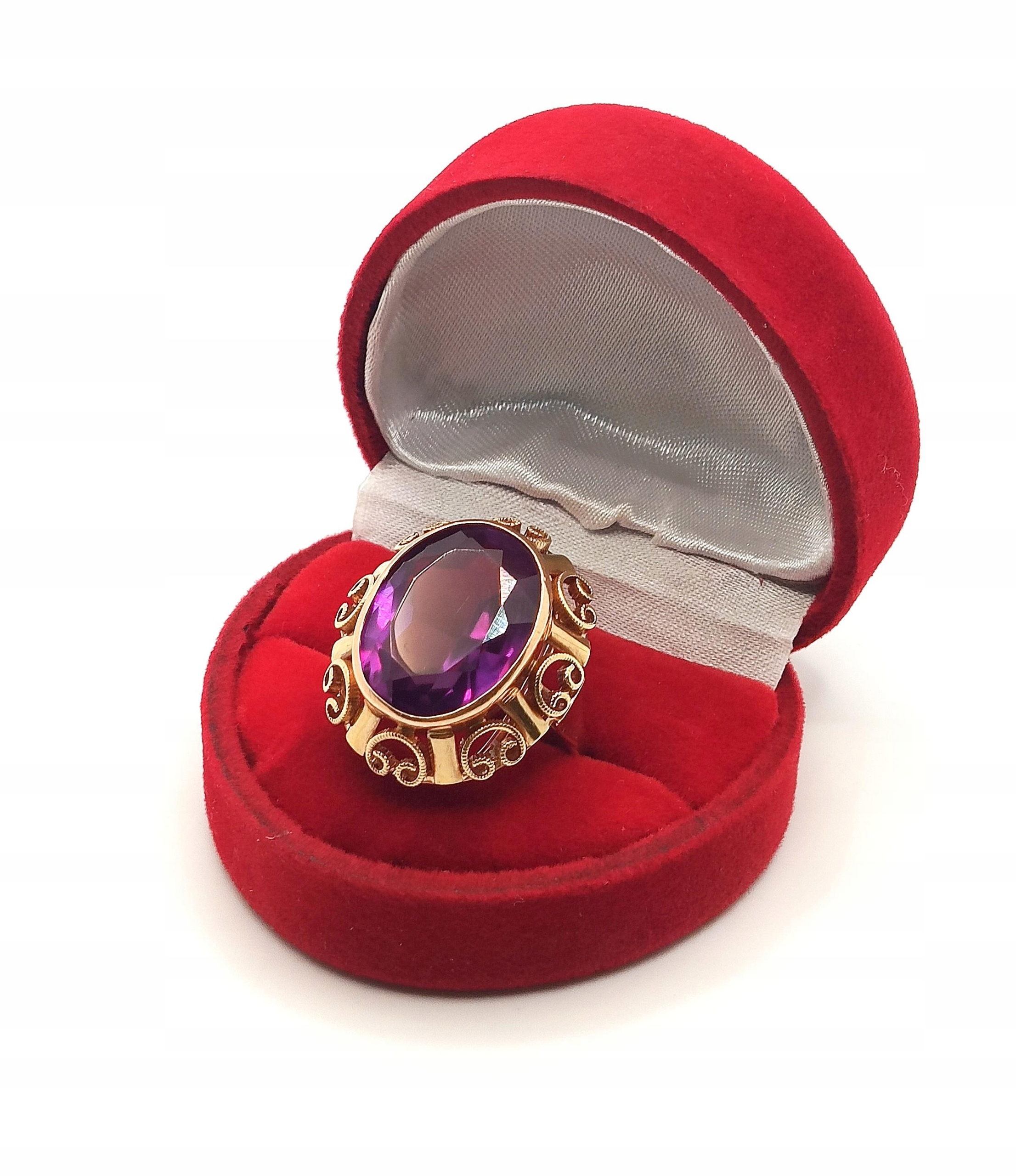 W ofercie na sprzedaż mamy dla państwa złoty pierścionek typu landryna, zdobiony okazałym Ametystem.