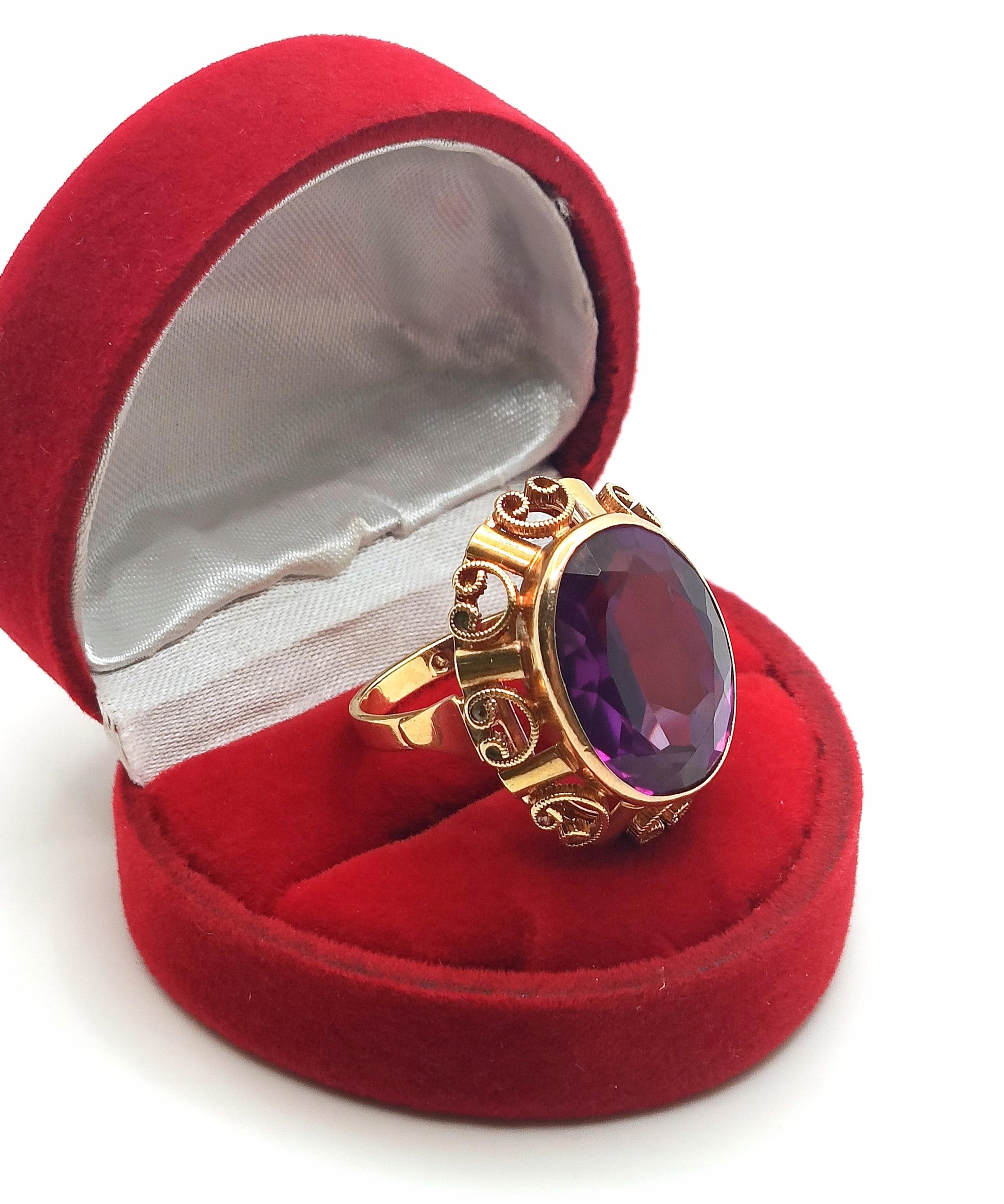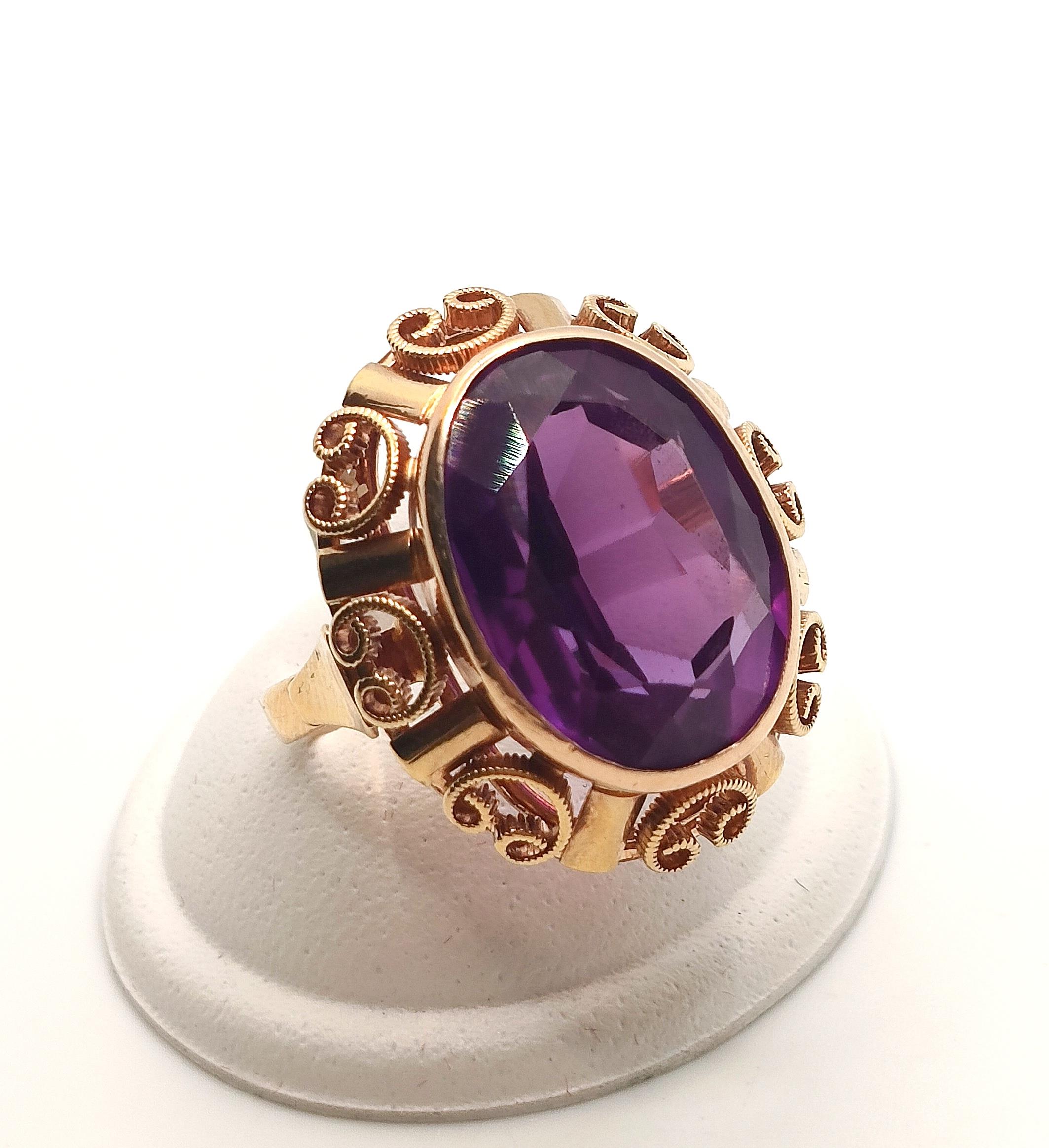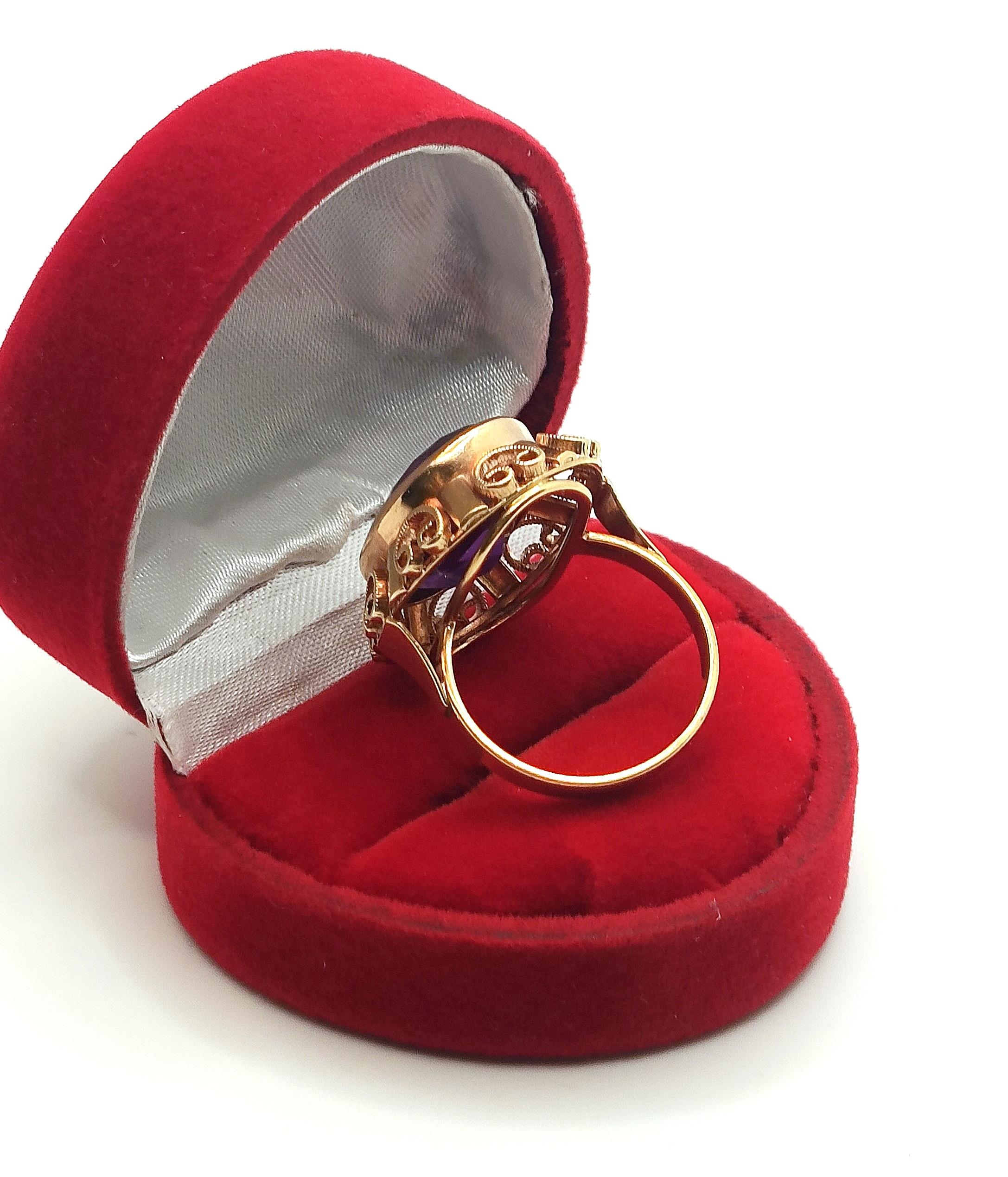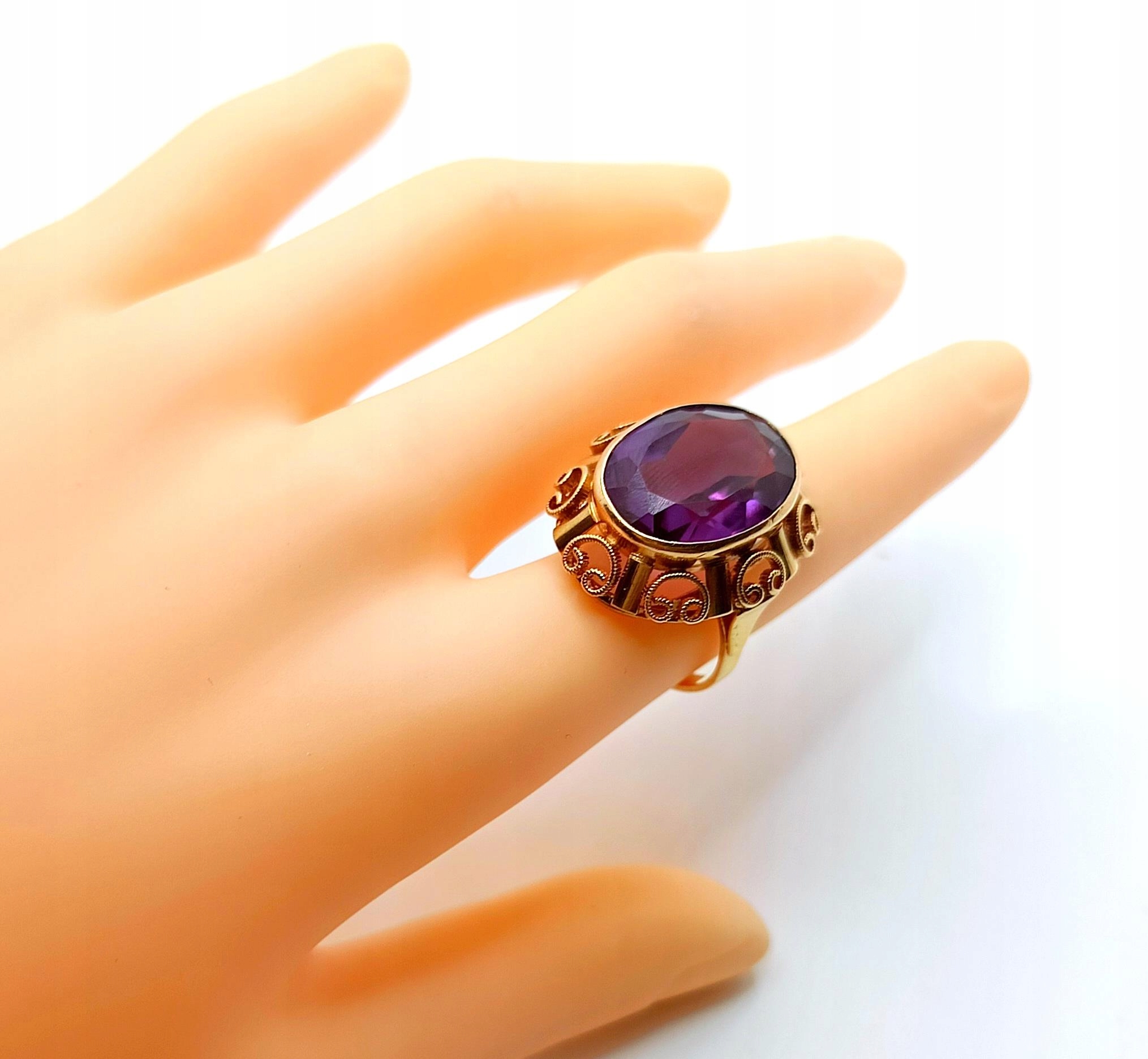 W ofercie na sprzedaż mamy dla państwa złoty pierścionek typu landryna, zdobiony okazałym Ametystem.
