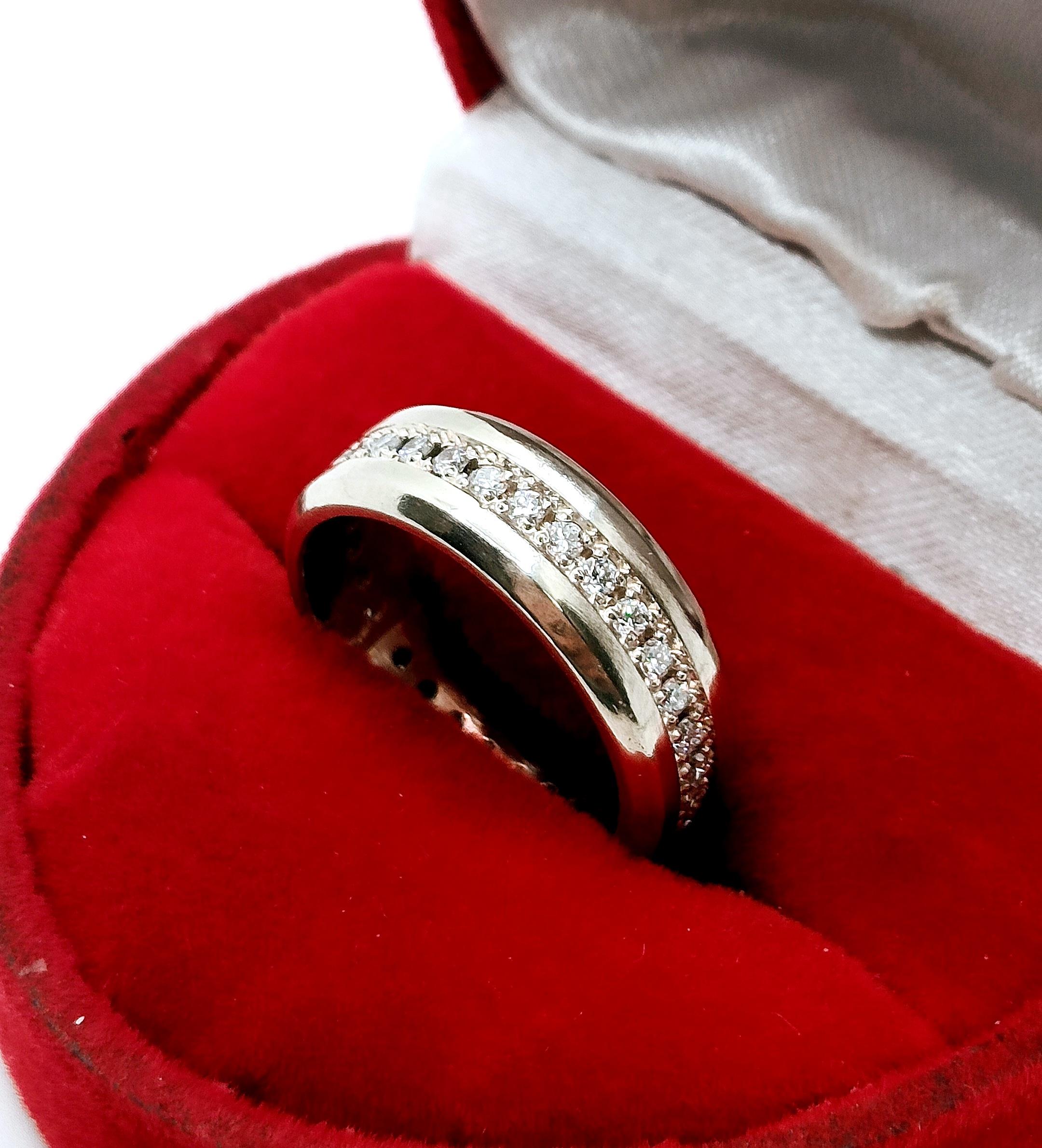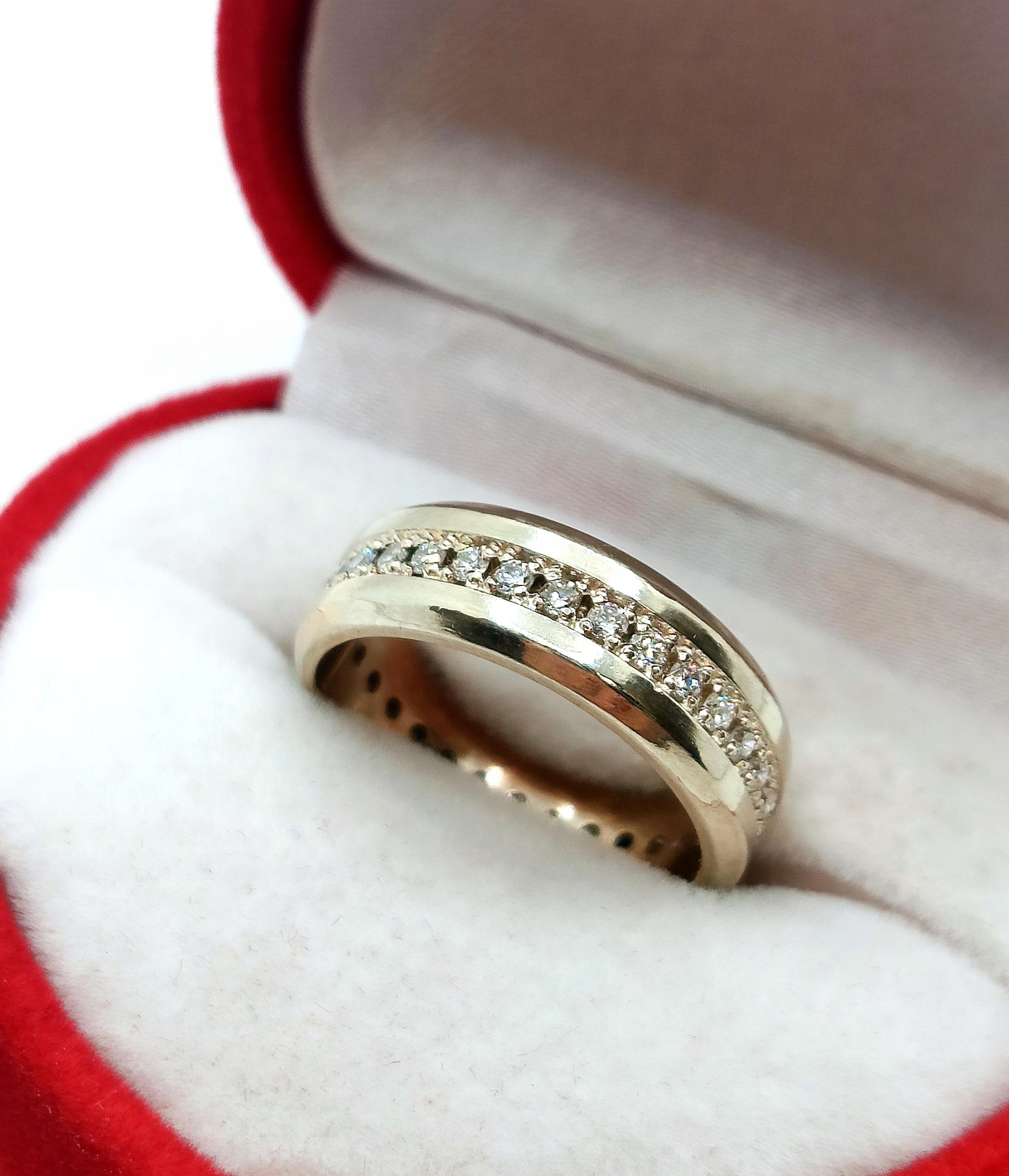 Oferujemy na sprzedaż piękny, złoty pierścionek w kształcie obrączki, ozdobiony brylantami.