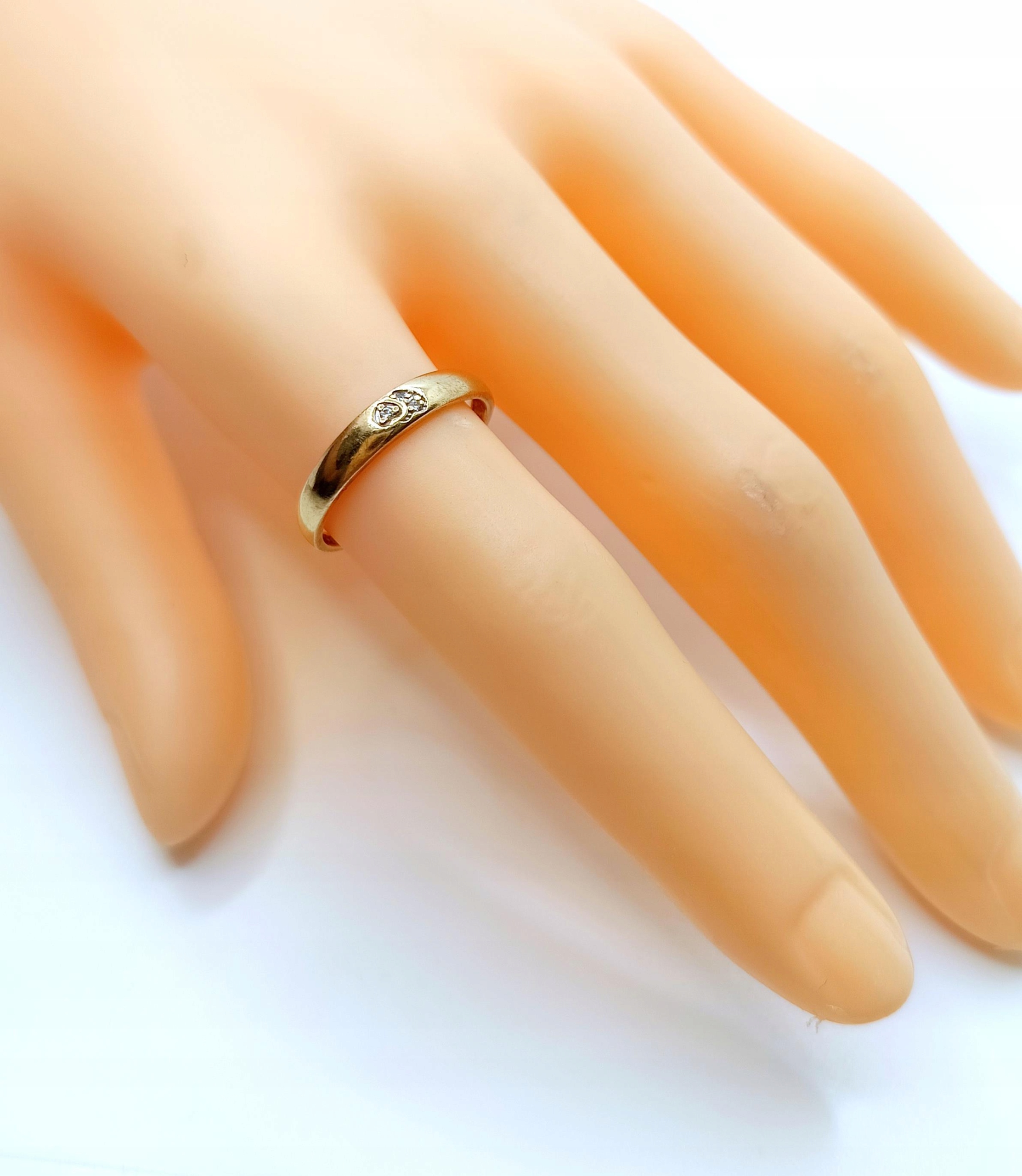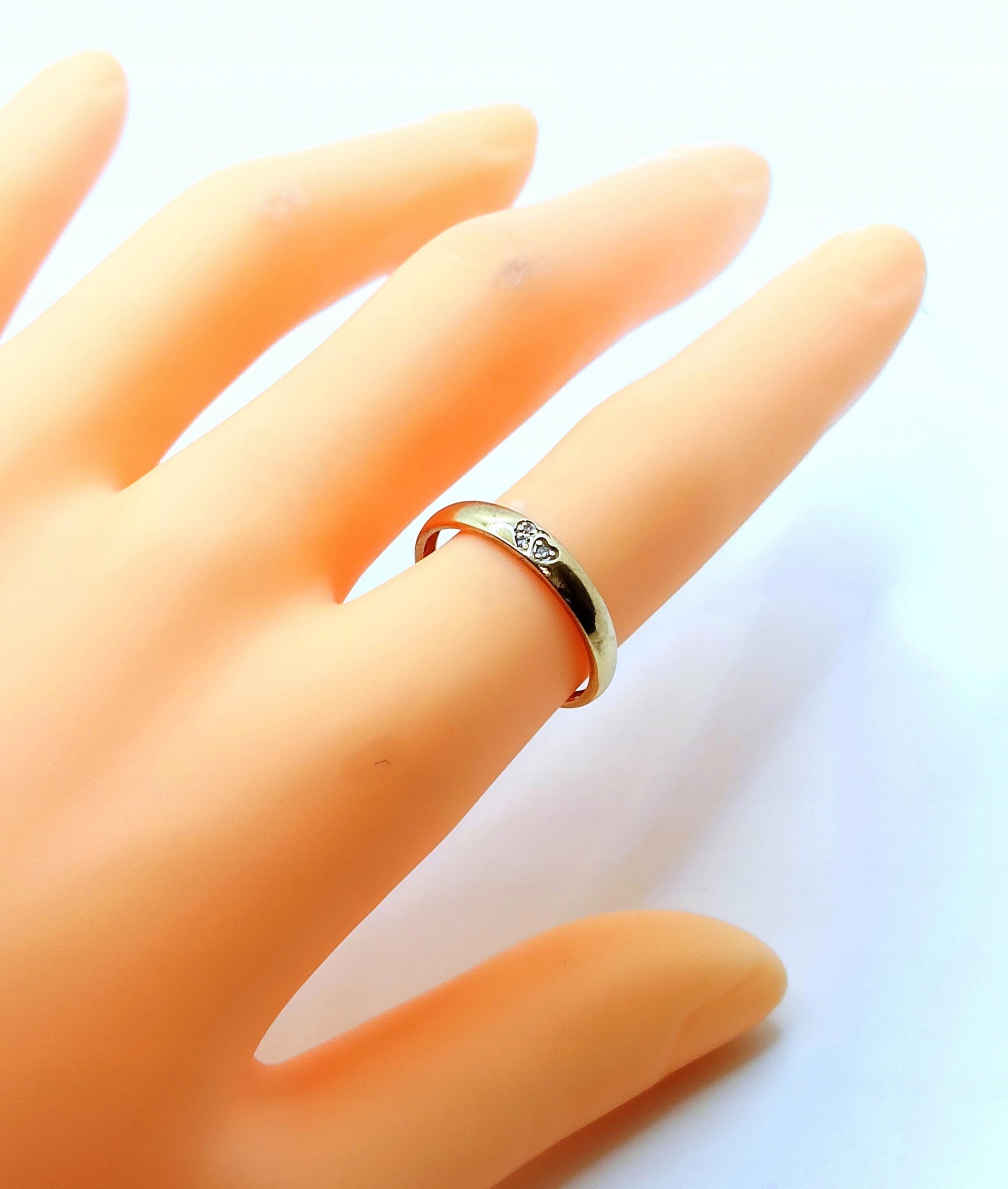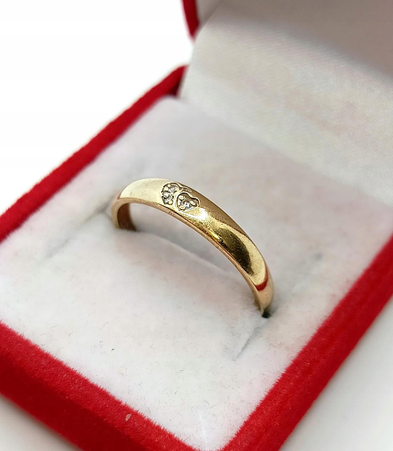 Oferujemy na sprzedaż złoty pierścionek w formie obrączki. Zdobiona maleńkimi serduszkami z cyrkoniami w środku.
