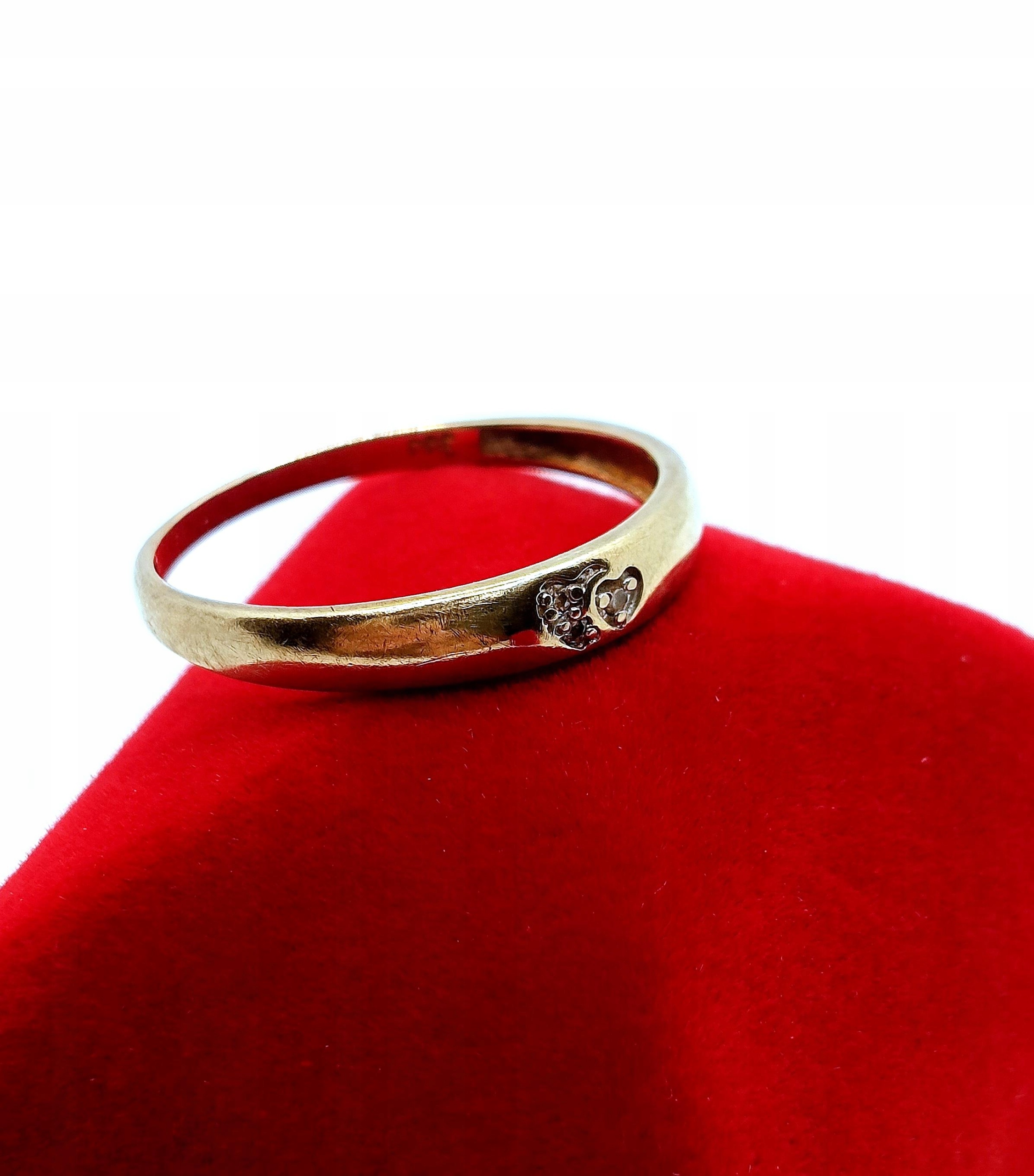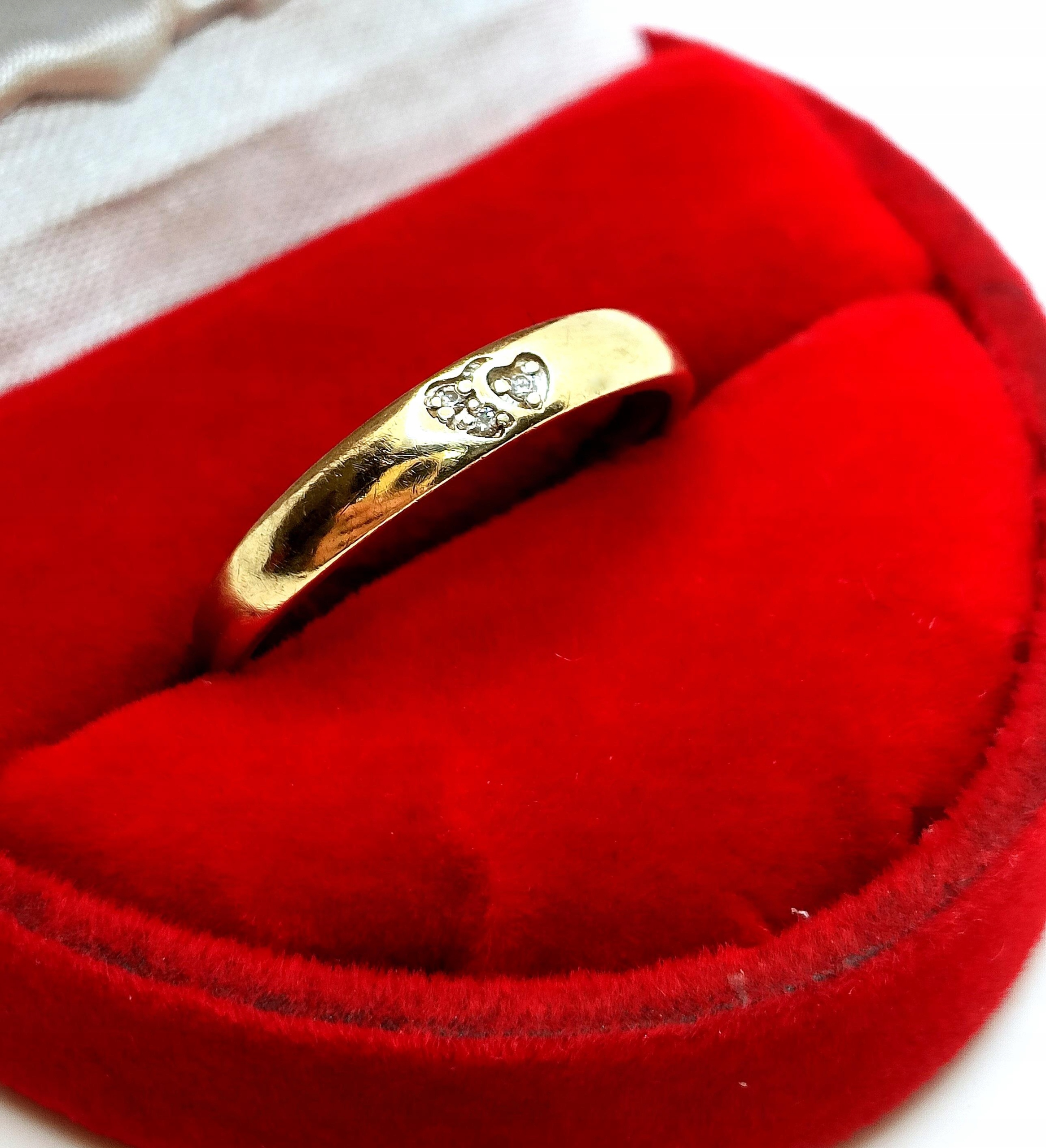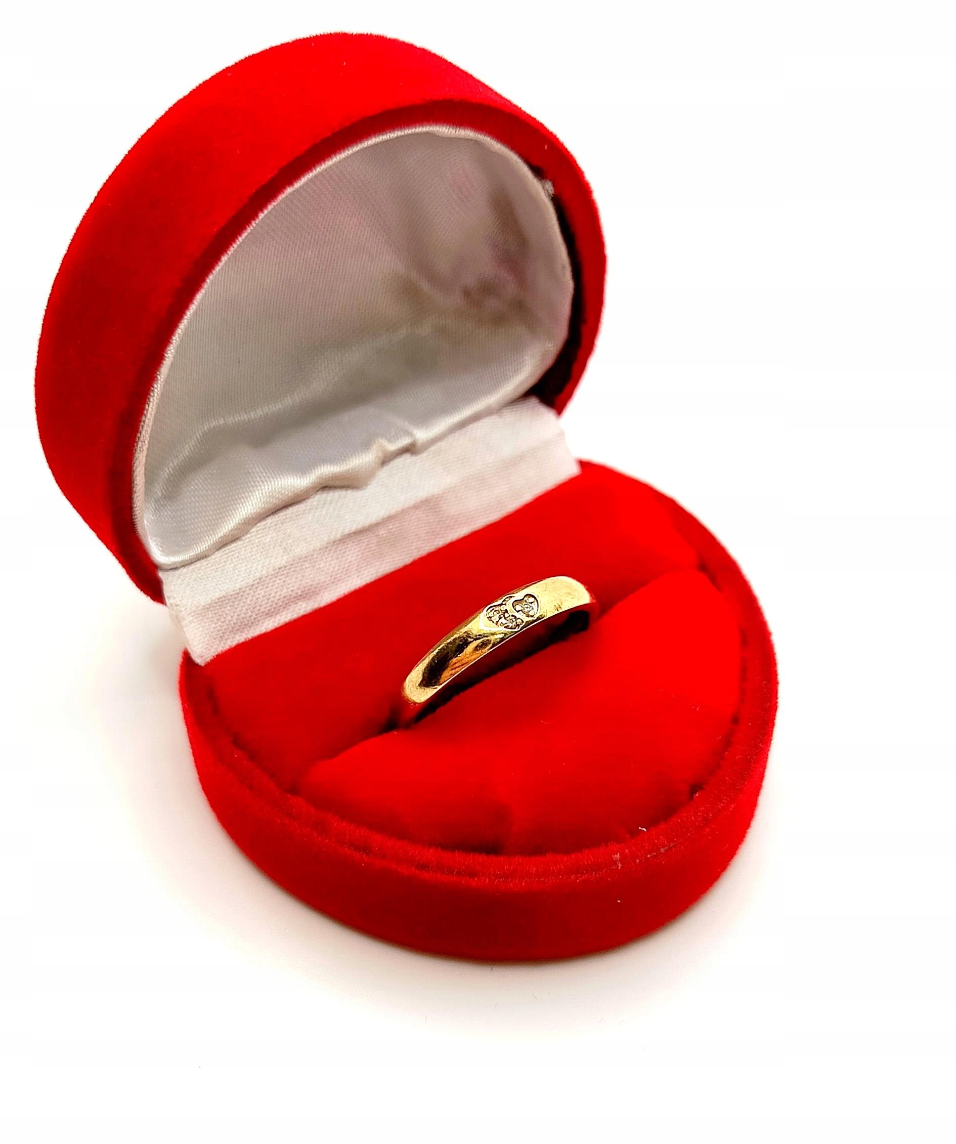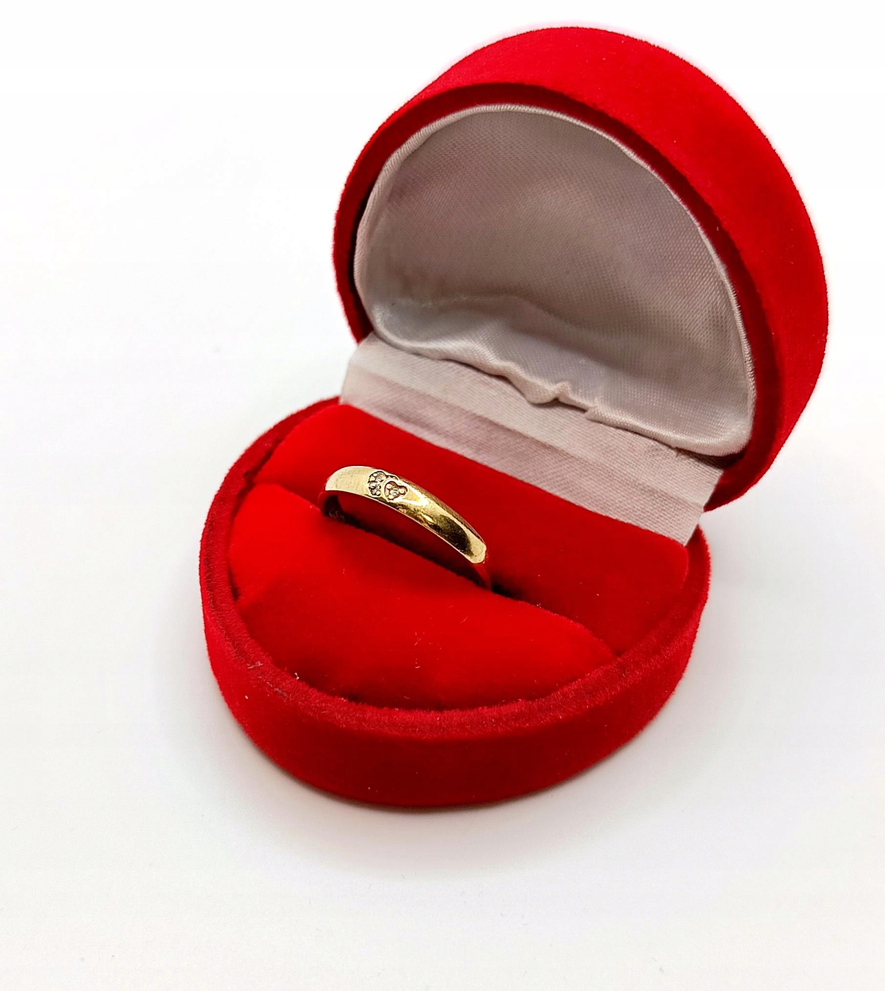 Oferujemy na sprzedaż złoty pierścionek w formie obrączki. Zdobiona maleńkimi serduszkami z cyrkoniami w środku.