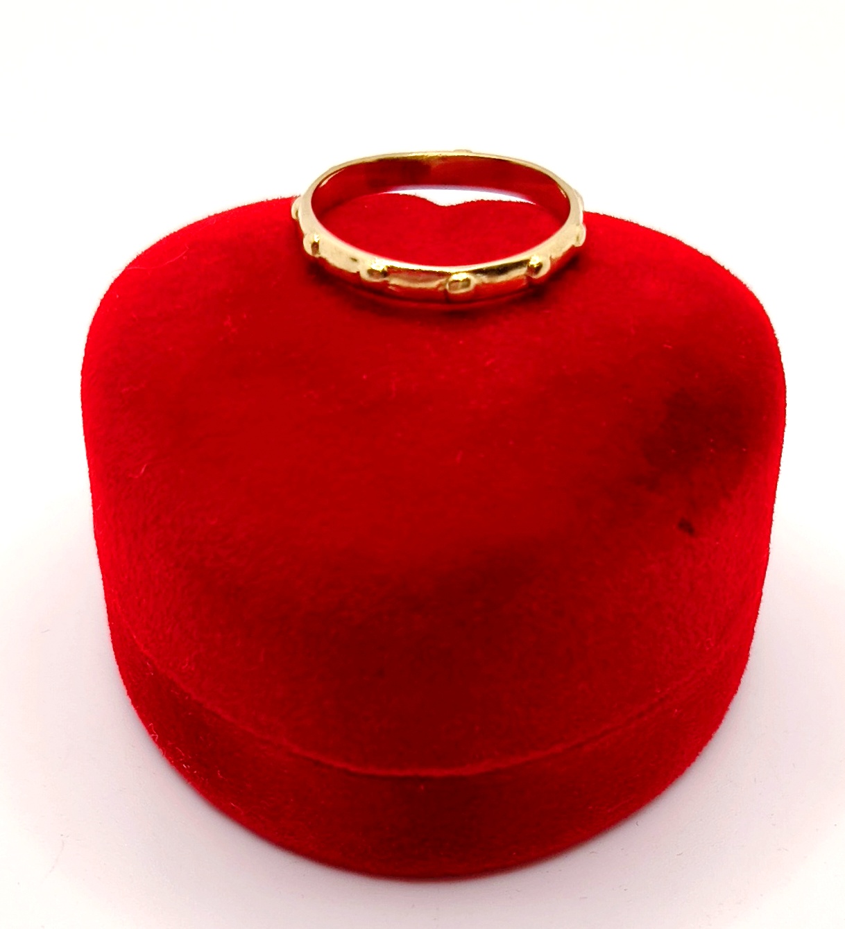 Wyrób używany, w stanie bardzo dobrym. Pierścionek ma lekką, naturalną krzywiznę spowodowaną umieszczaniem złotych koralików oraz krzyżyka.
