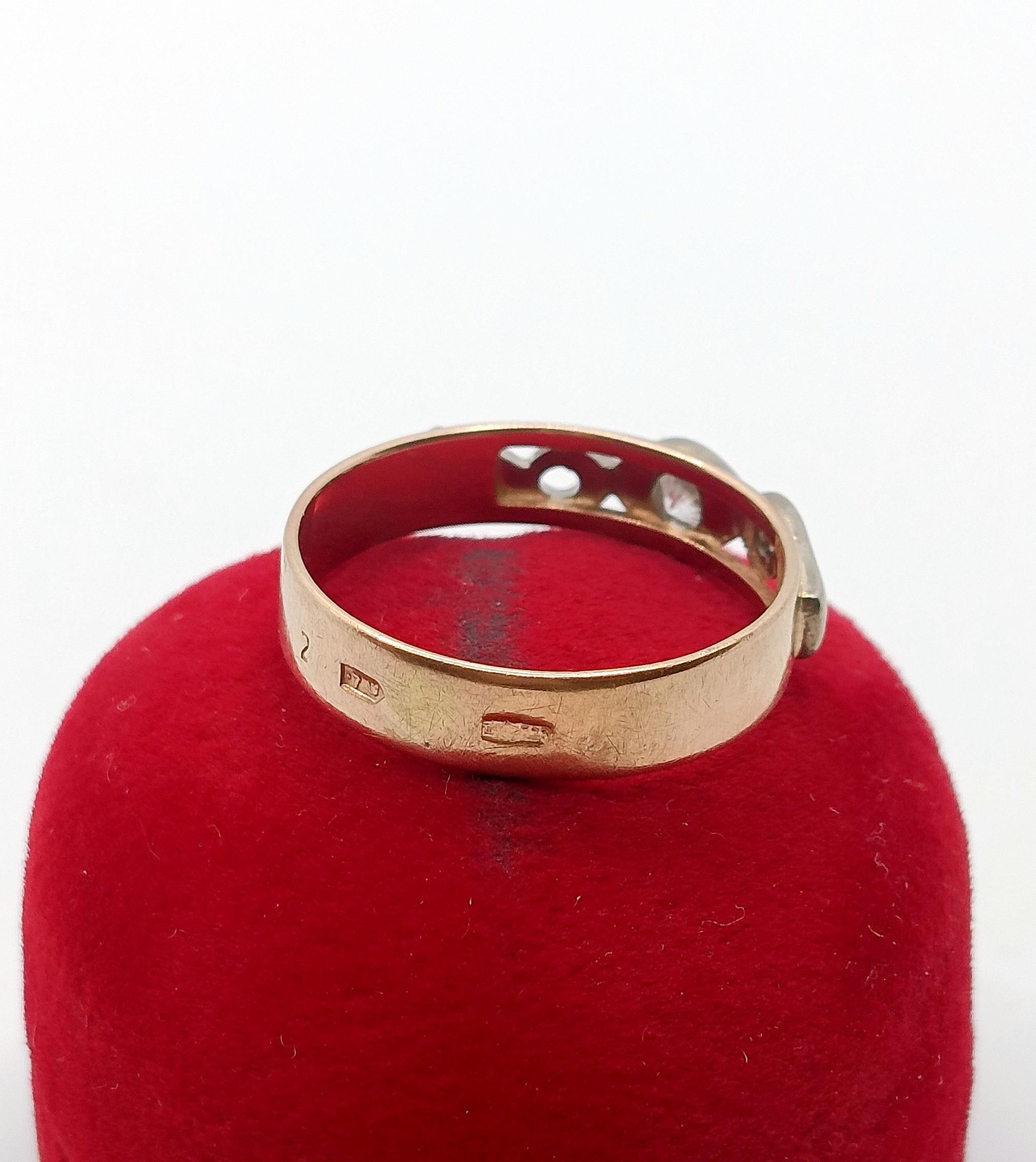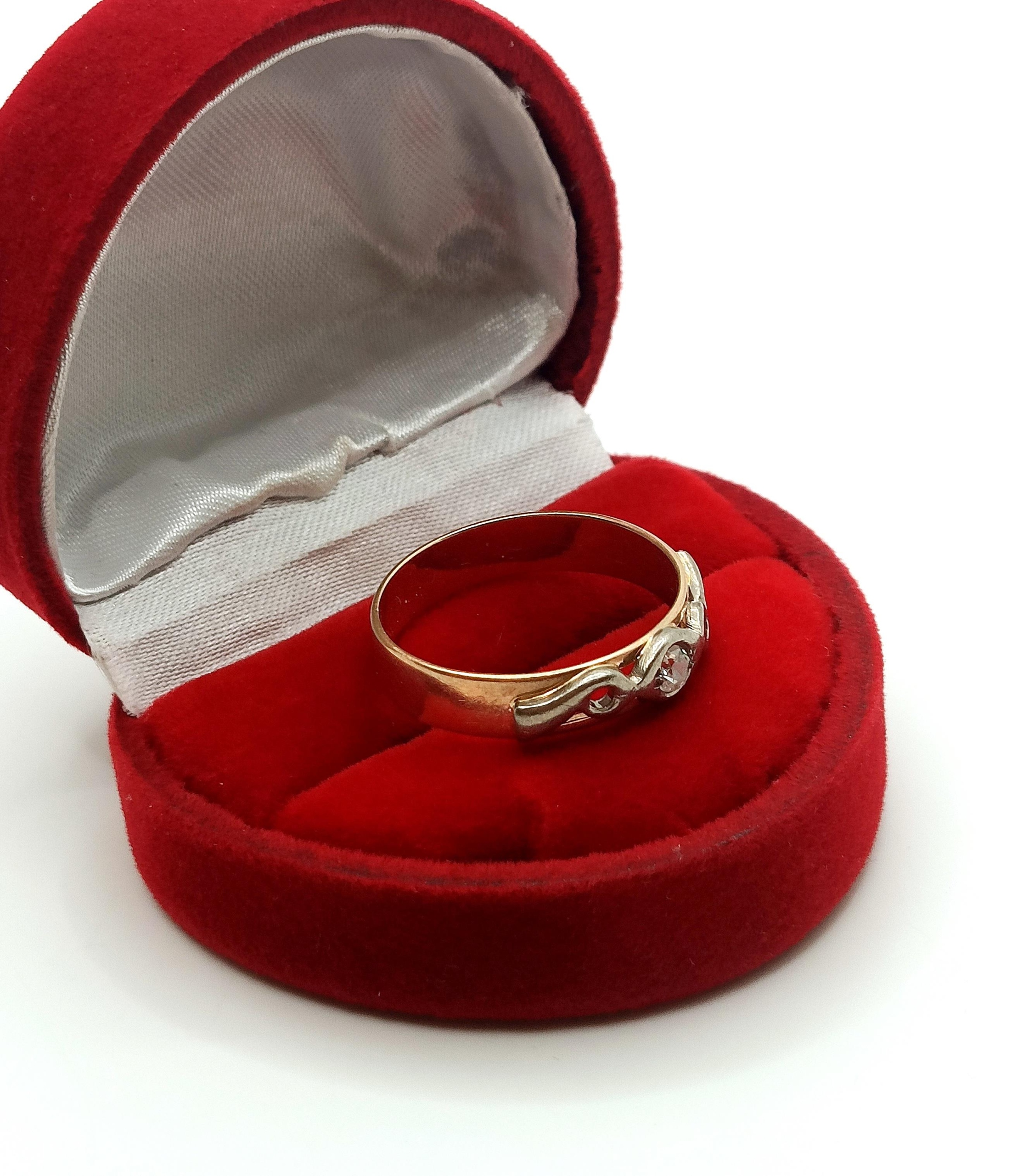 W ofercie na sprzedaż mamy dla Państwa złoty pierścionek, o kształcie obrączki ze zdobieniem z białego złota oraz cyrkonii.