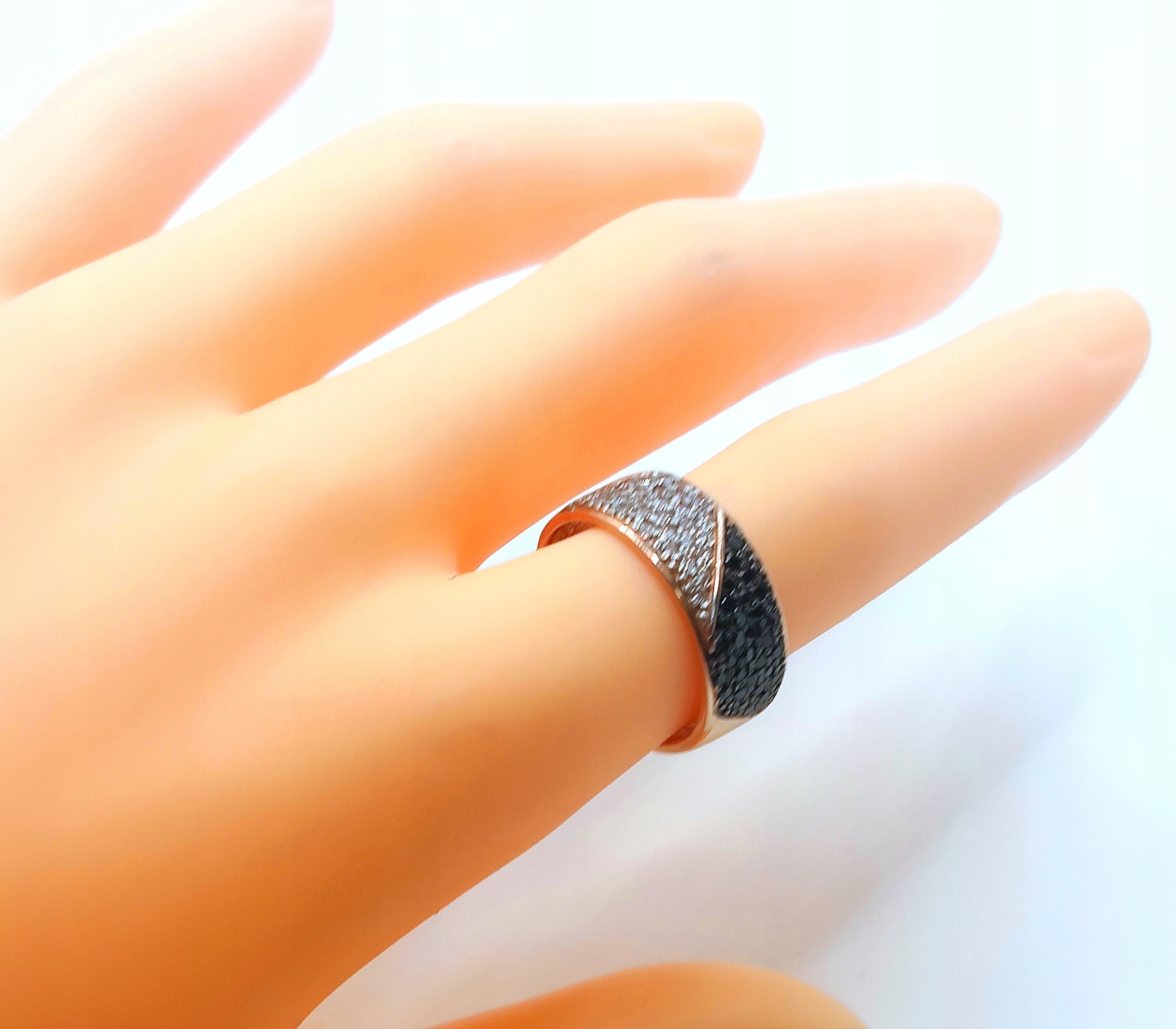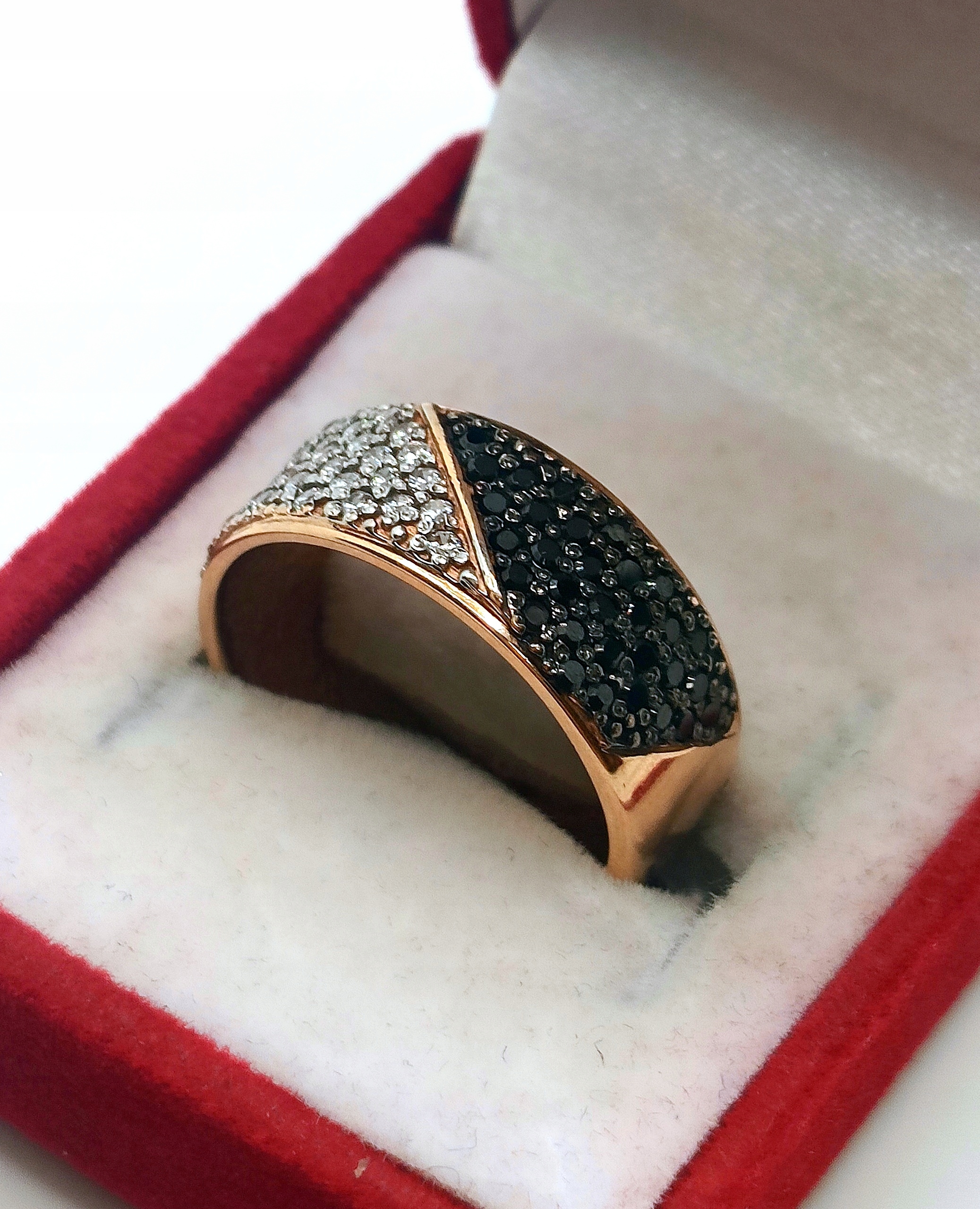 Oferujemy na sprzedaż złoty pierścionek w formie szerokiej obroczki zdobionej symetrycznie białymi oraz czarnymi cyrkoniami.