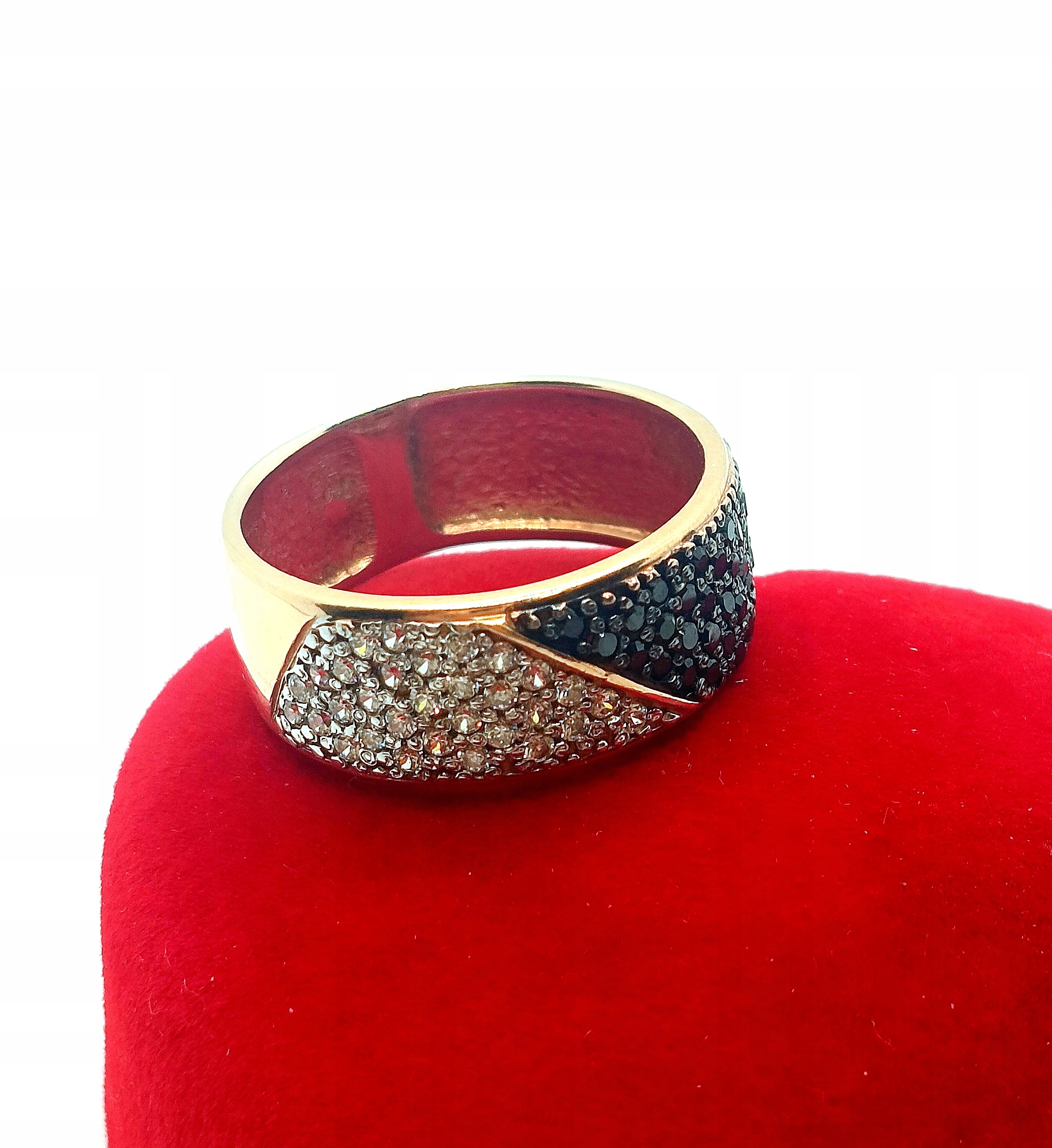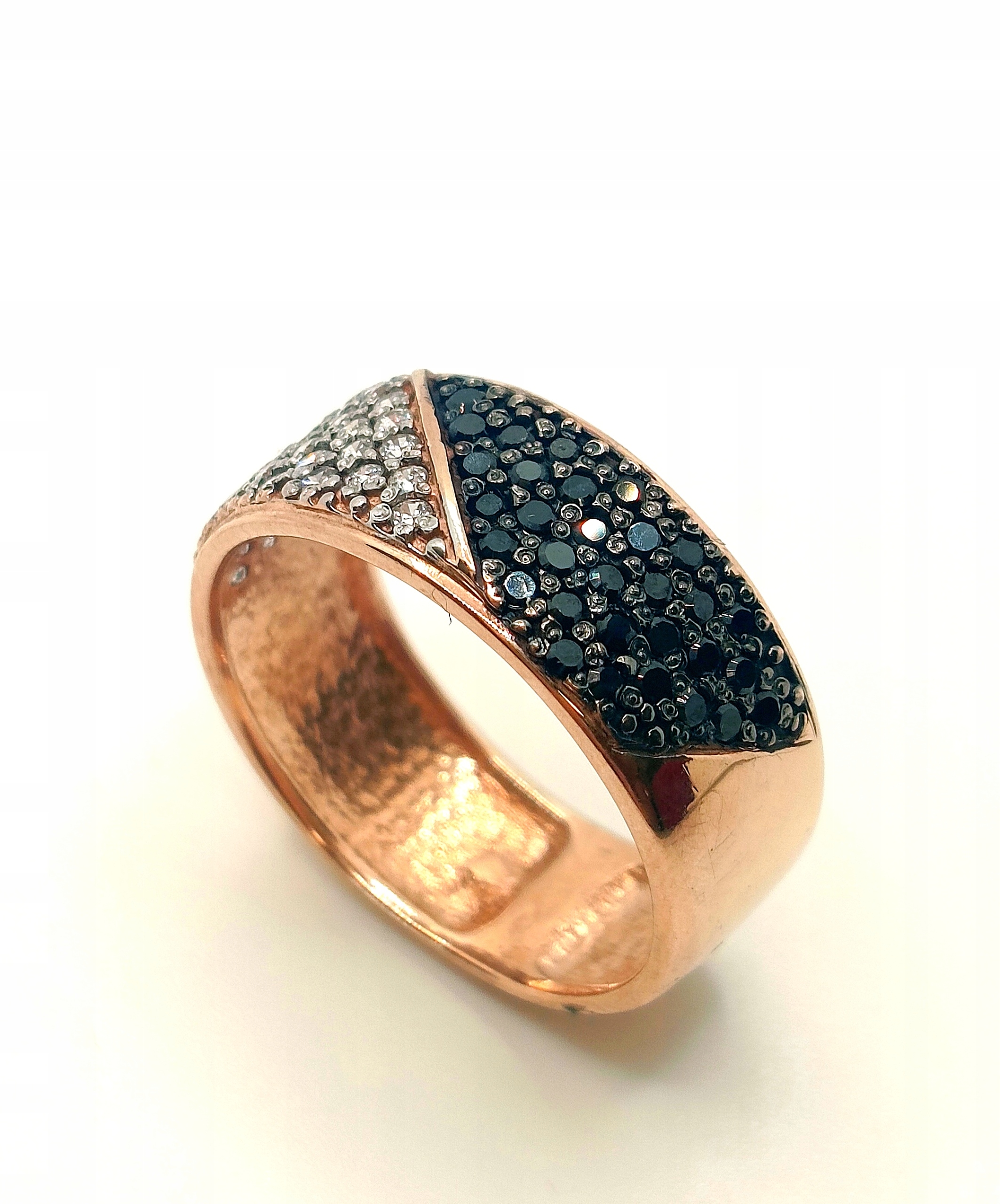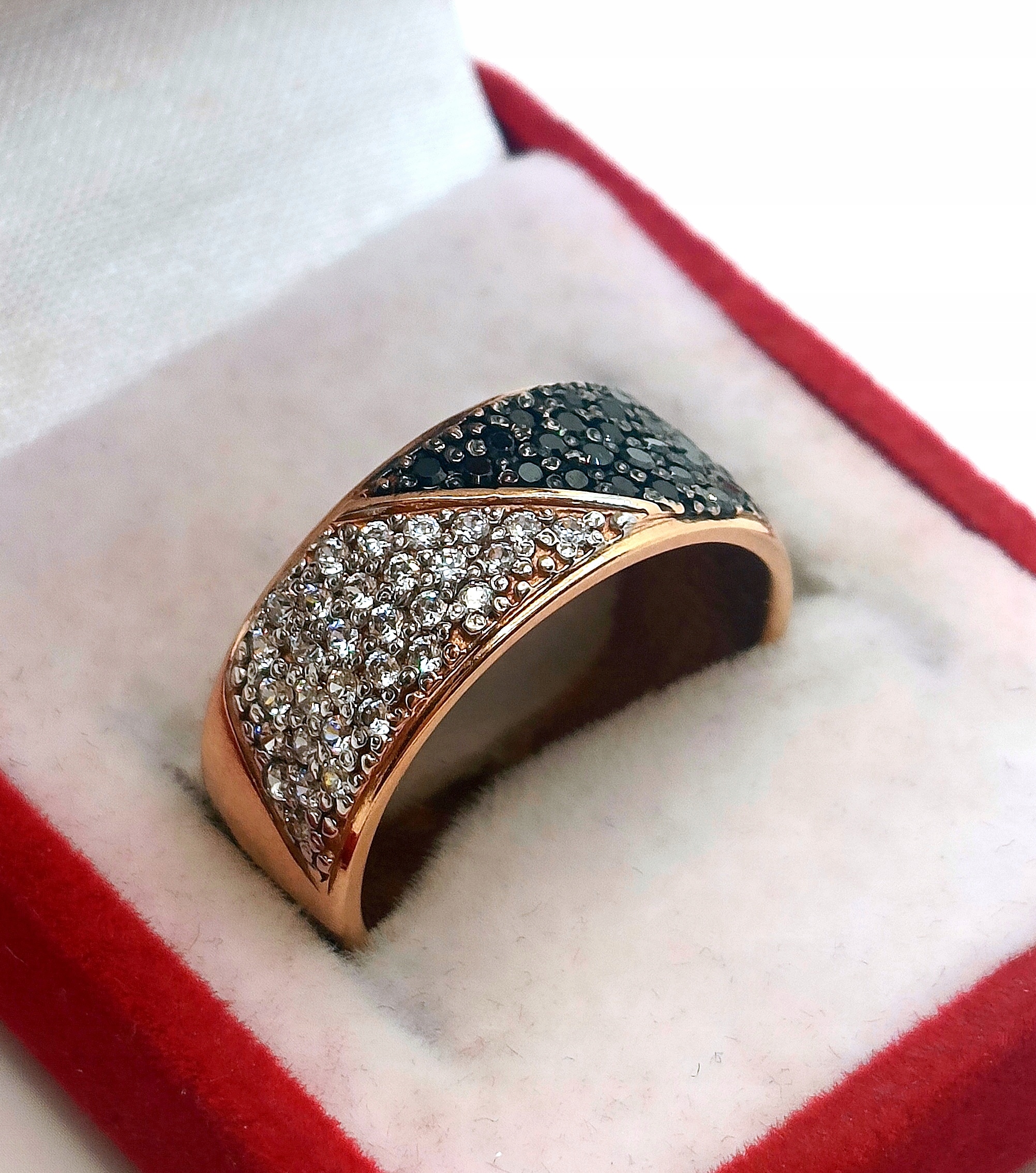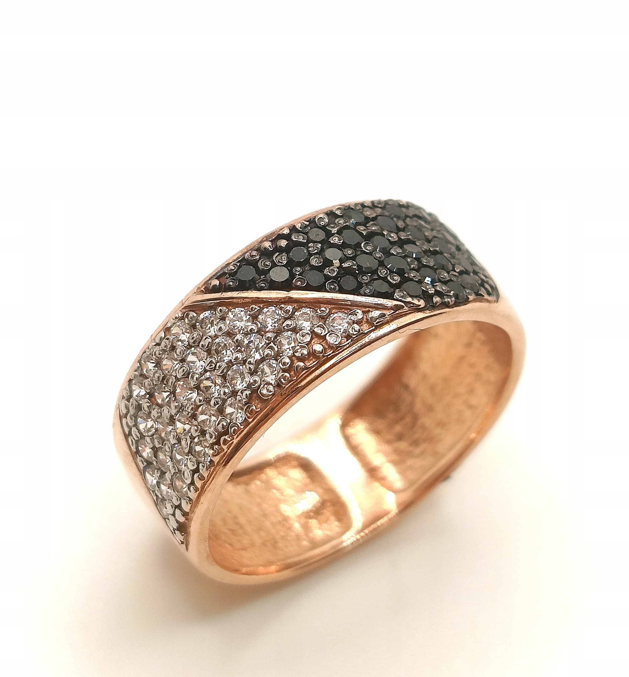 Oferujemy na sprzedaż złoty pierścionek w formie szerokiej obroczki zdobionej symetrycznie białymi oraz czarnymi cyrkoniami.