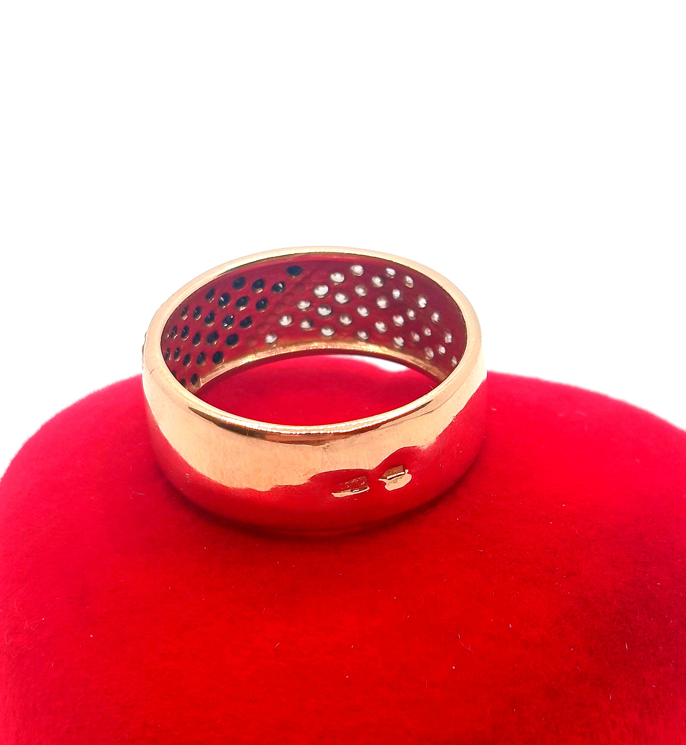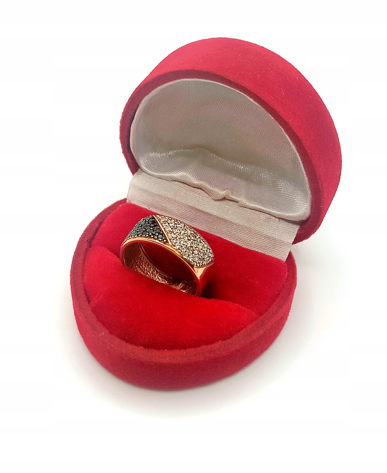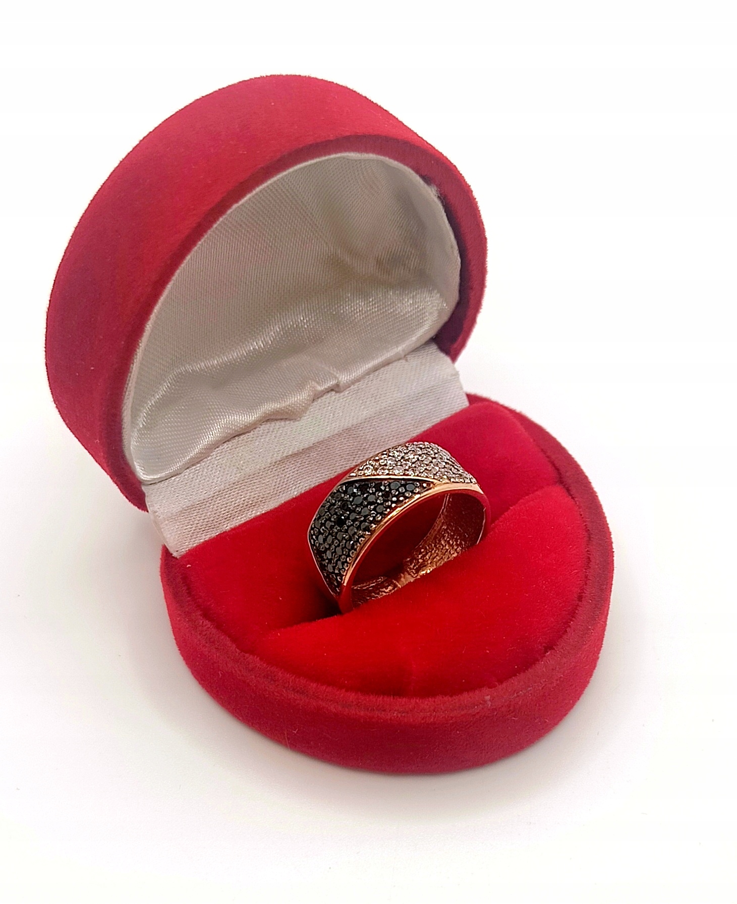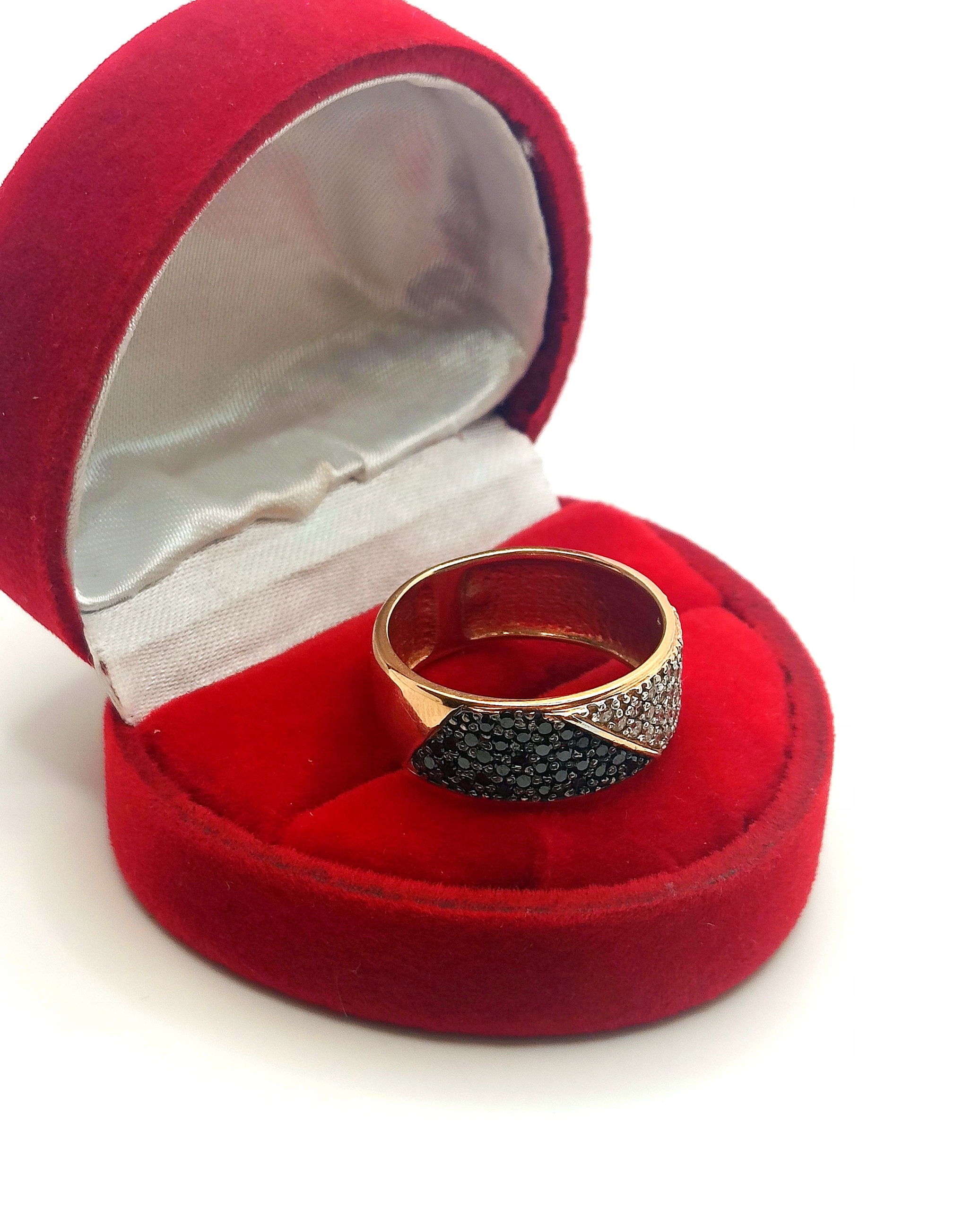 Oferujemy na sprzedaż złoty pierścionek w formie szerokiej obroczki zdobionej symetrycznie białymi oraz czarnymi cyrkoniami.
