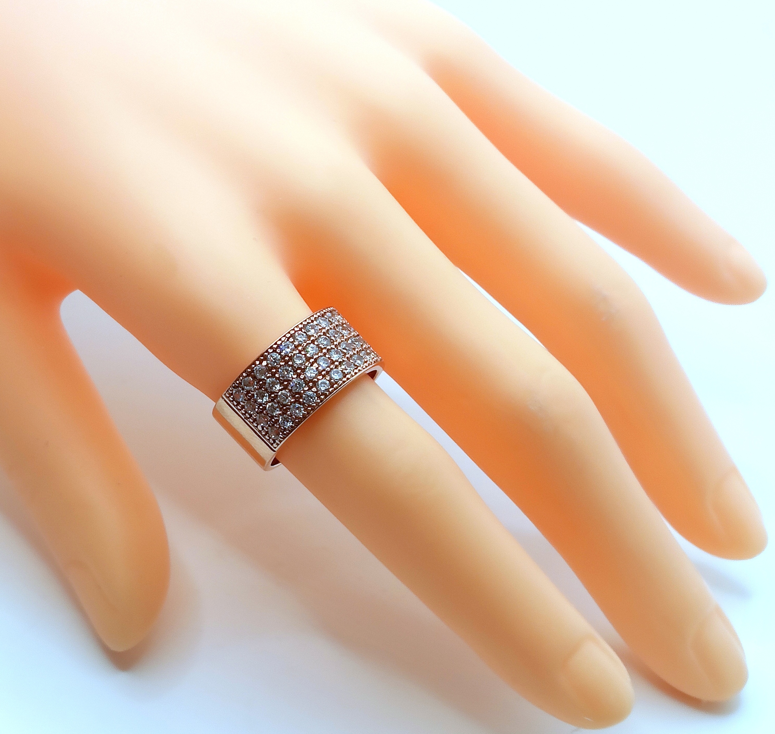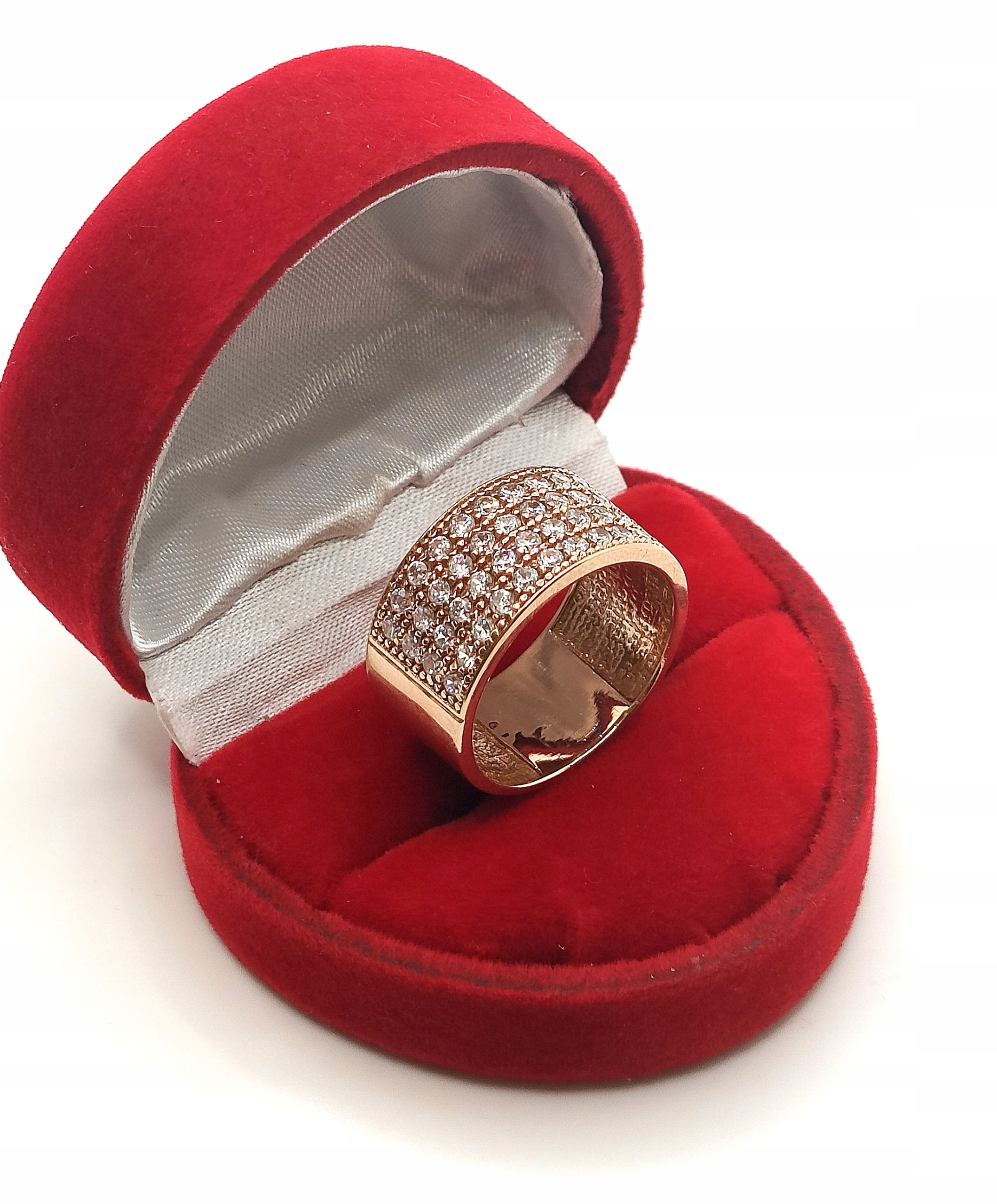 Oferujemy na sprzedaż piękny, złoty pierścionek w kształcie szerokiej obrączki, ozdobiony czterema rzędami cyrkonii.