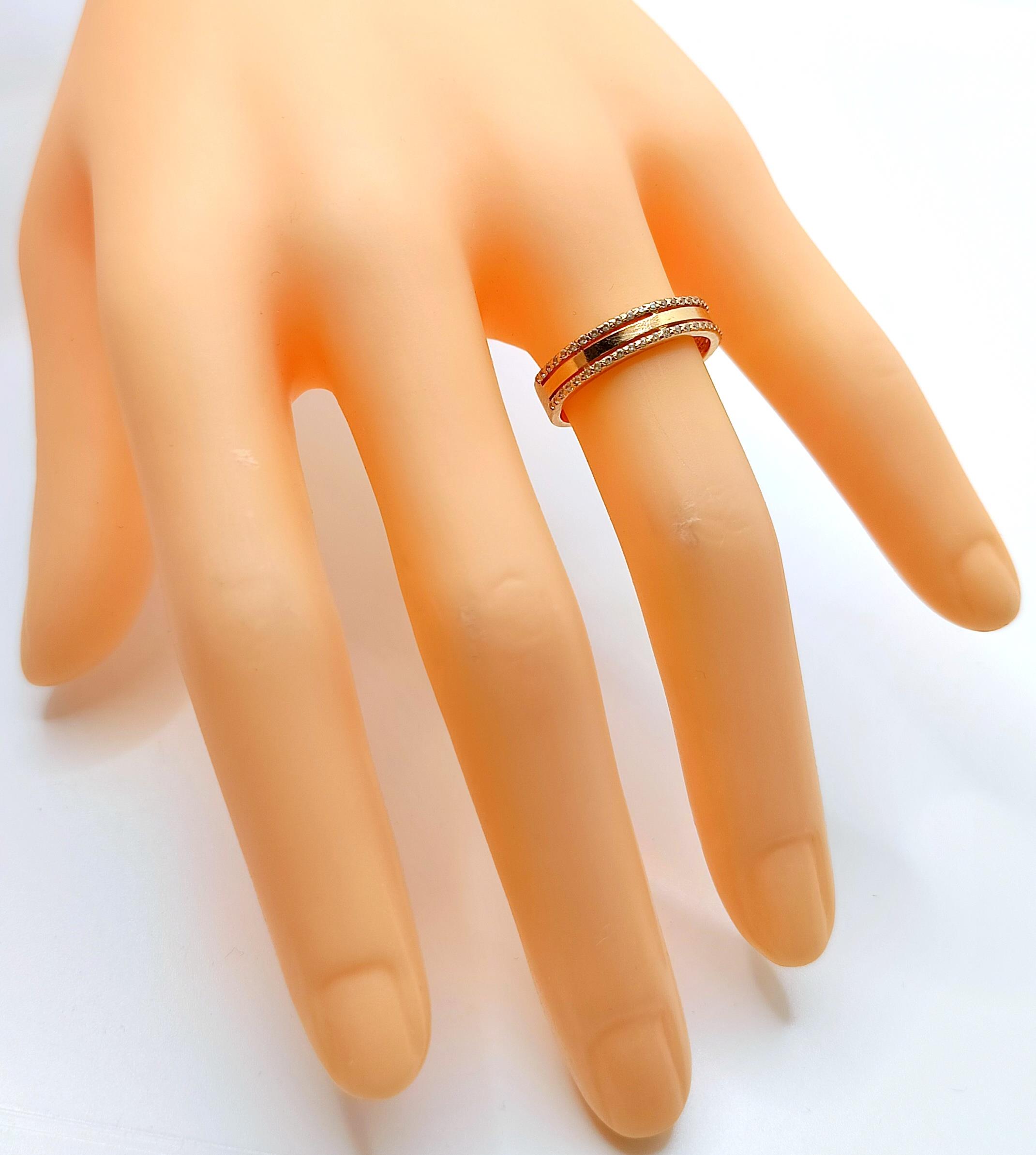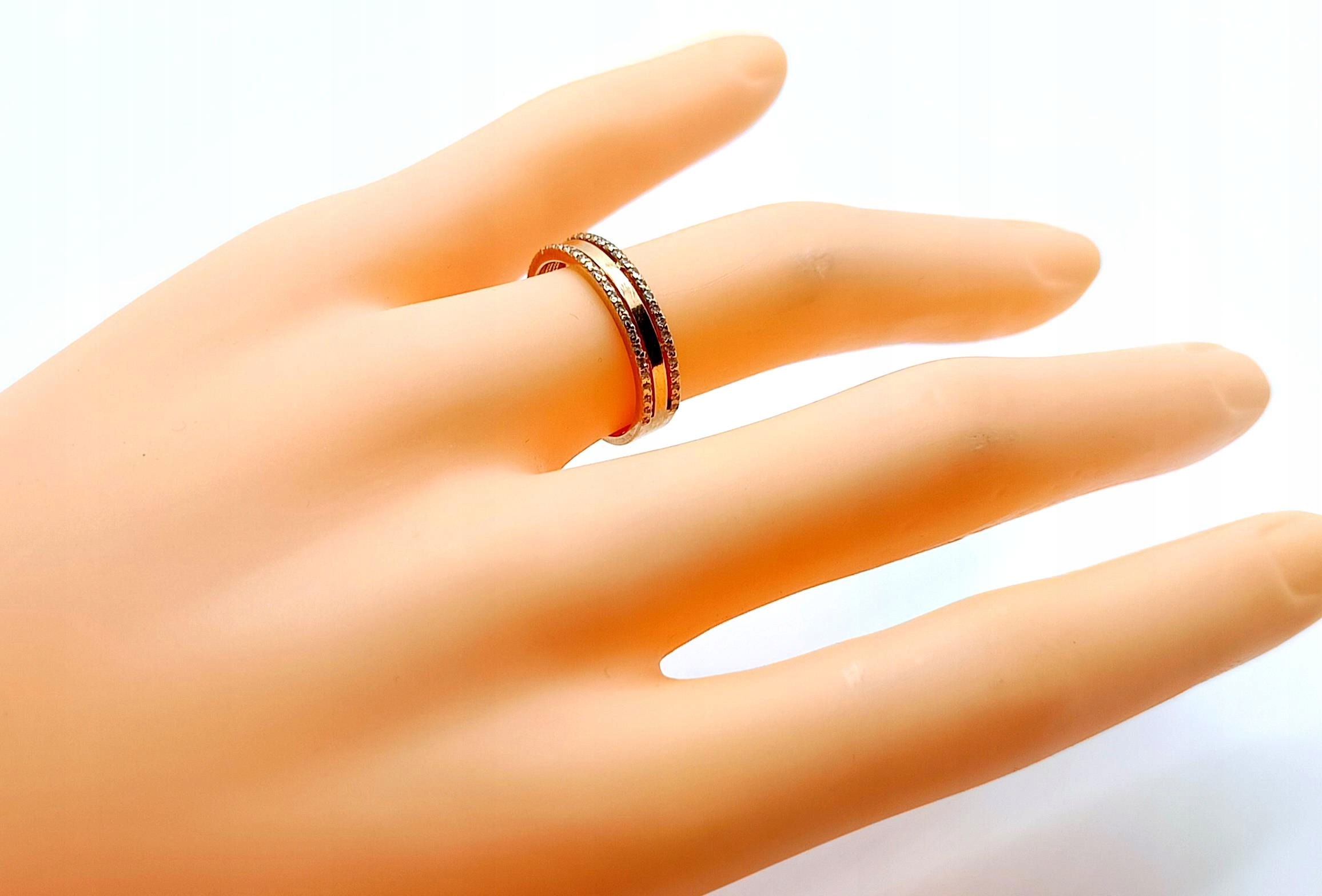 W ofercie na sprzedaż mamy dla Państwa złoty pierścionek, o kształcie obrączki, ozdobiony cyrkoniami.