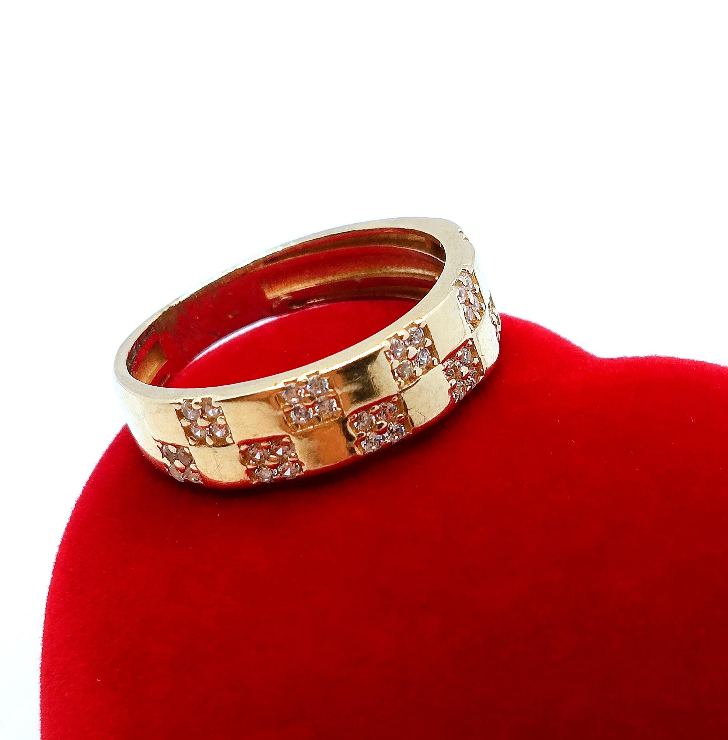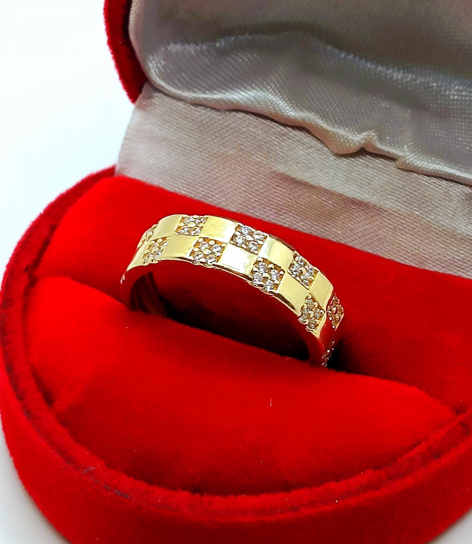 W ofercie na sprzedaż mamy dla Państwa złoty pierścionek, o kształcie obrączki, ozdobiony cyrkoniami.