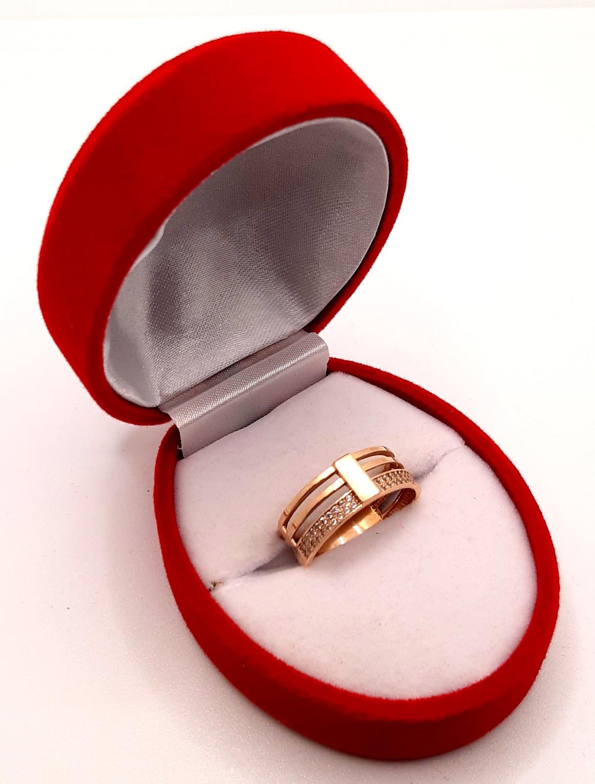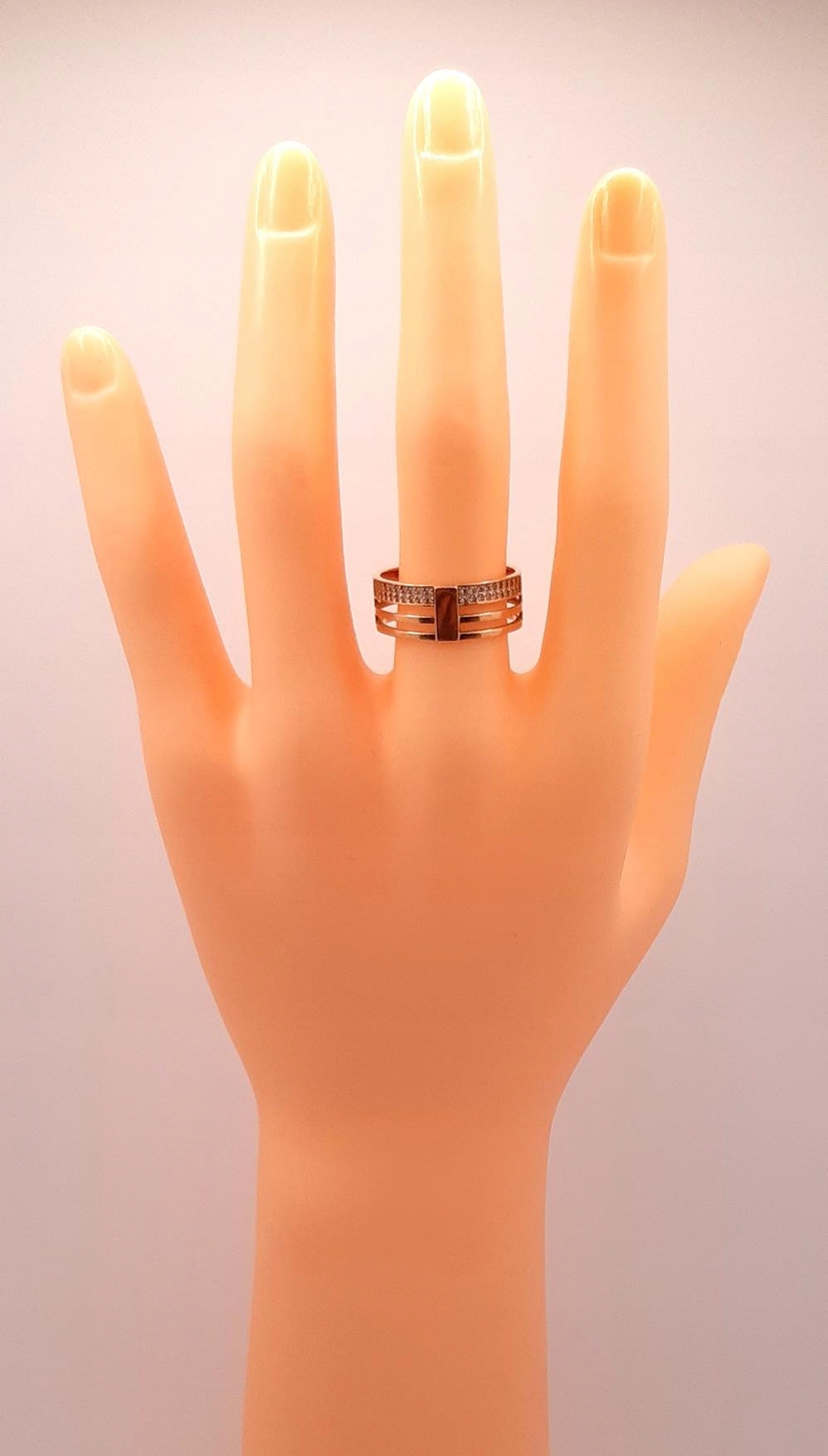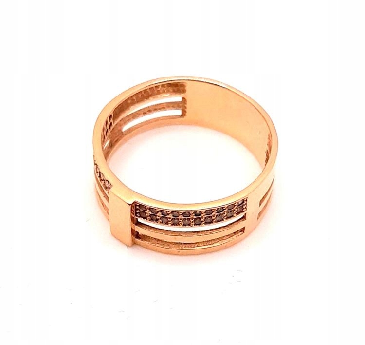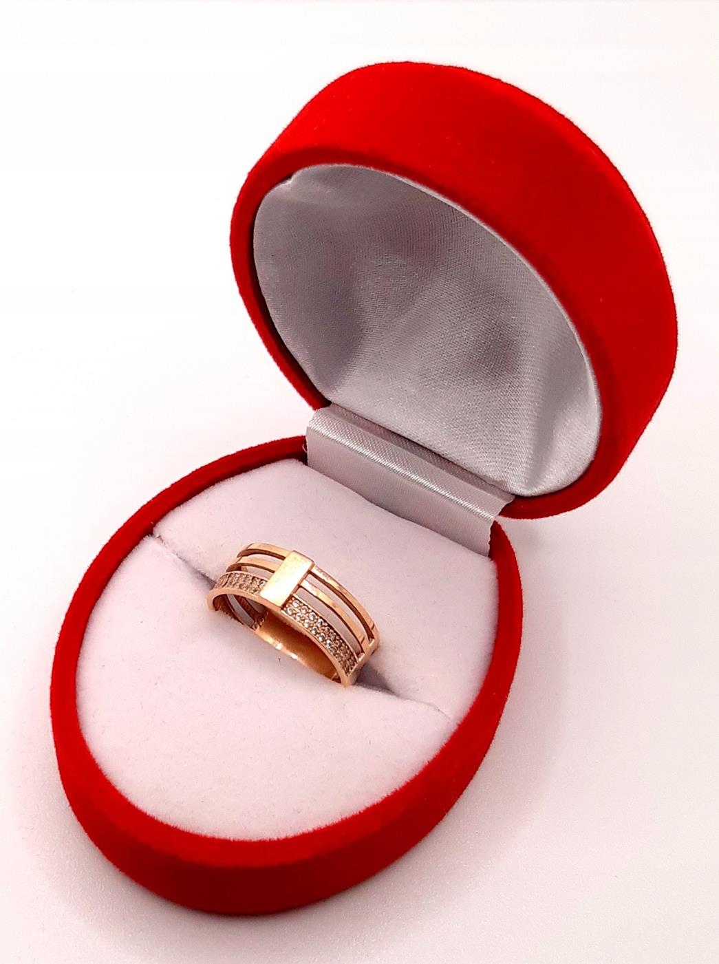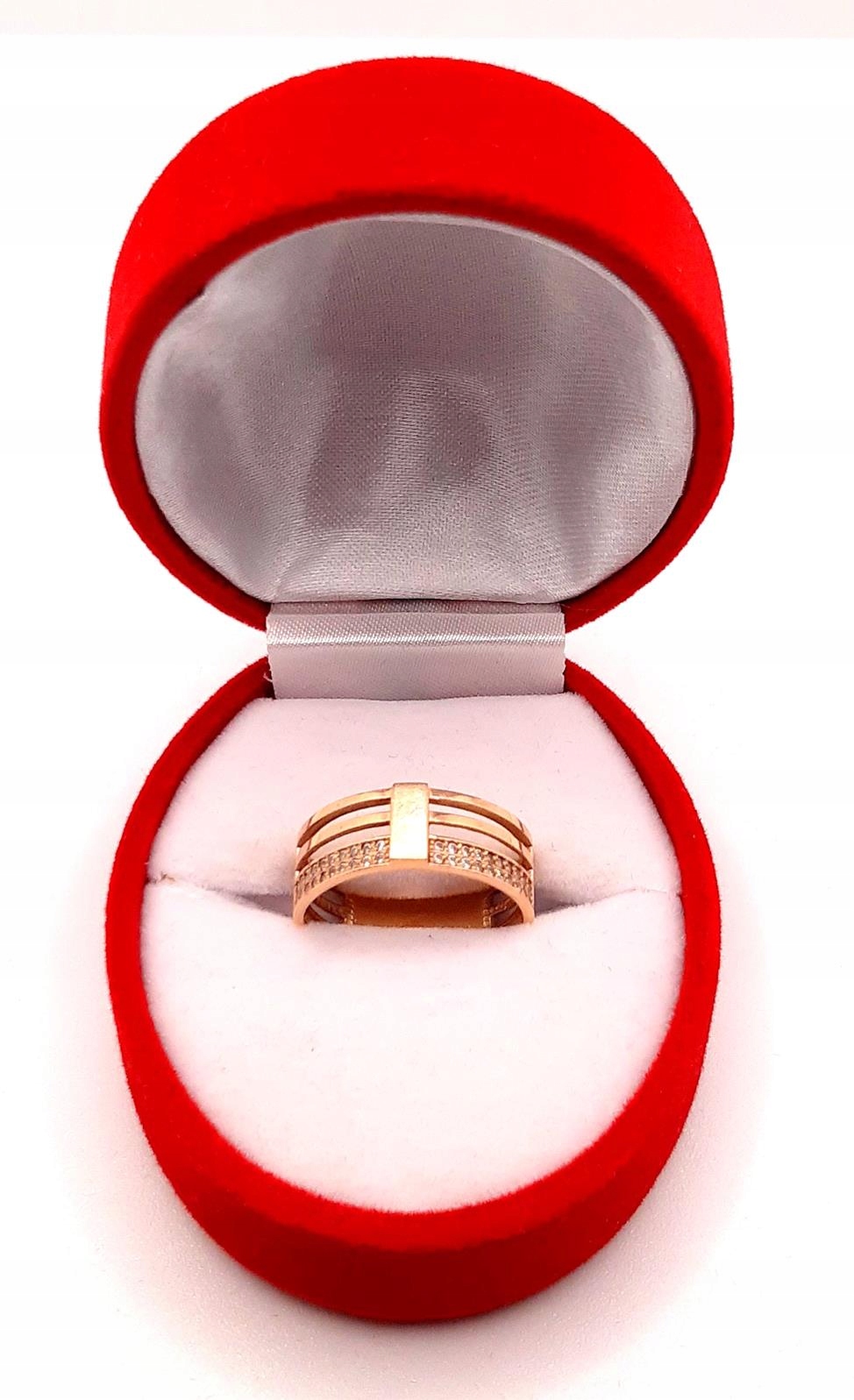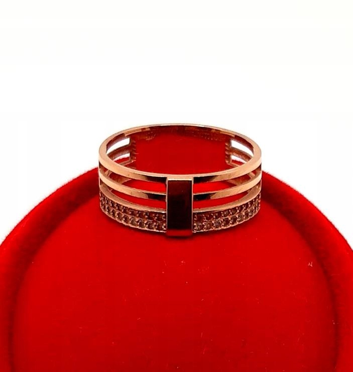 W ofercie sprzedaży posiadamy piękny, złoty pierścionek w kształcie obrączki ozdobionej cyrkoniami.
