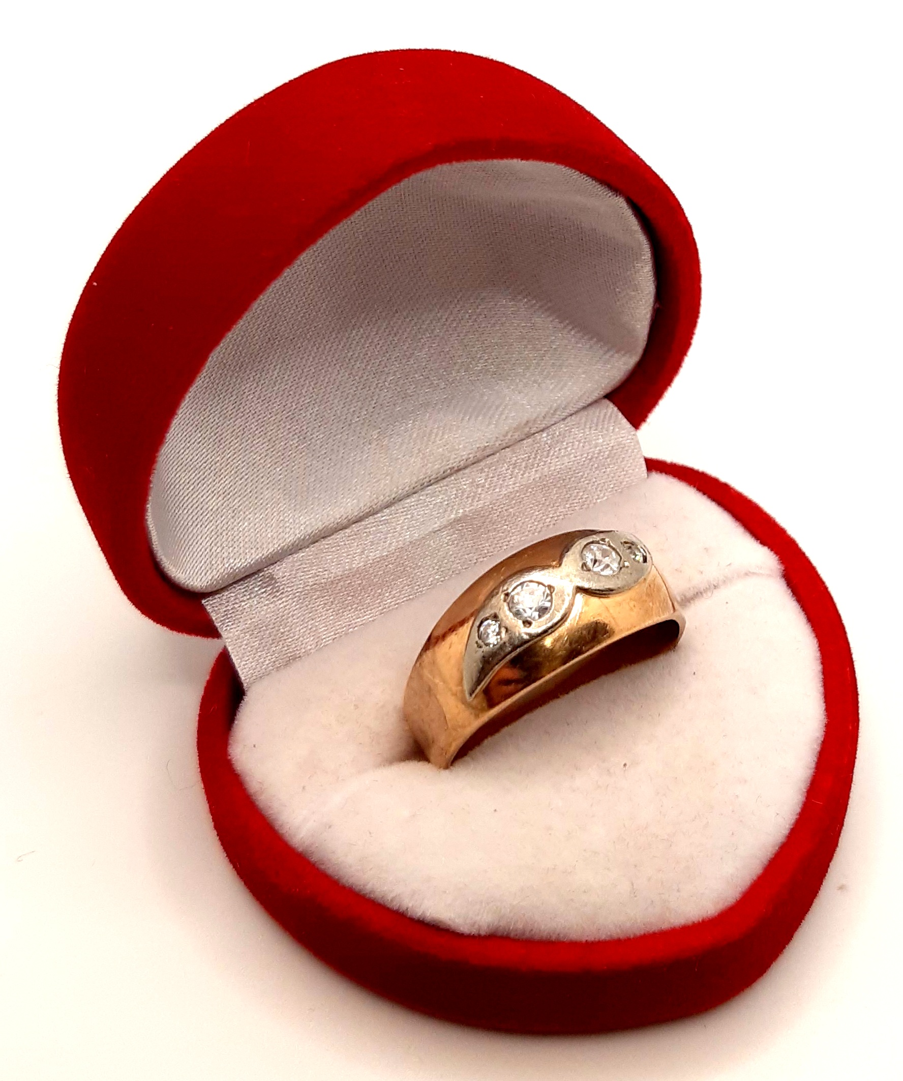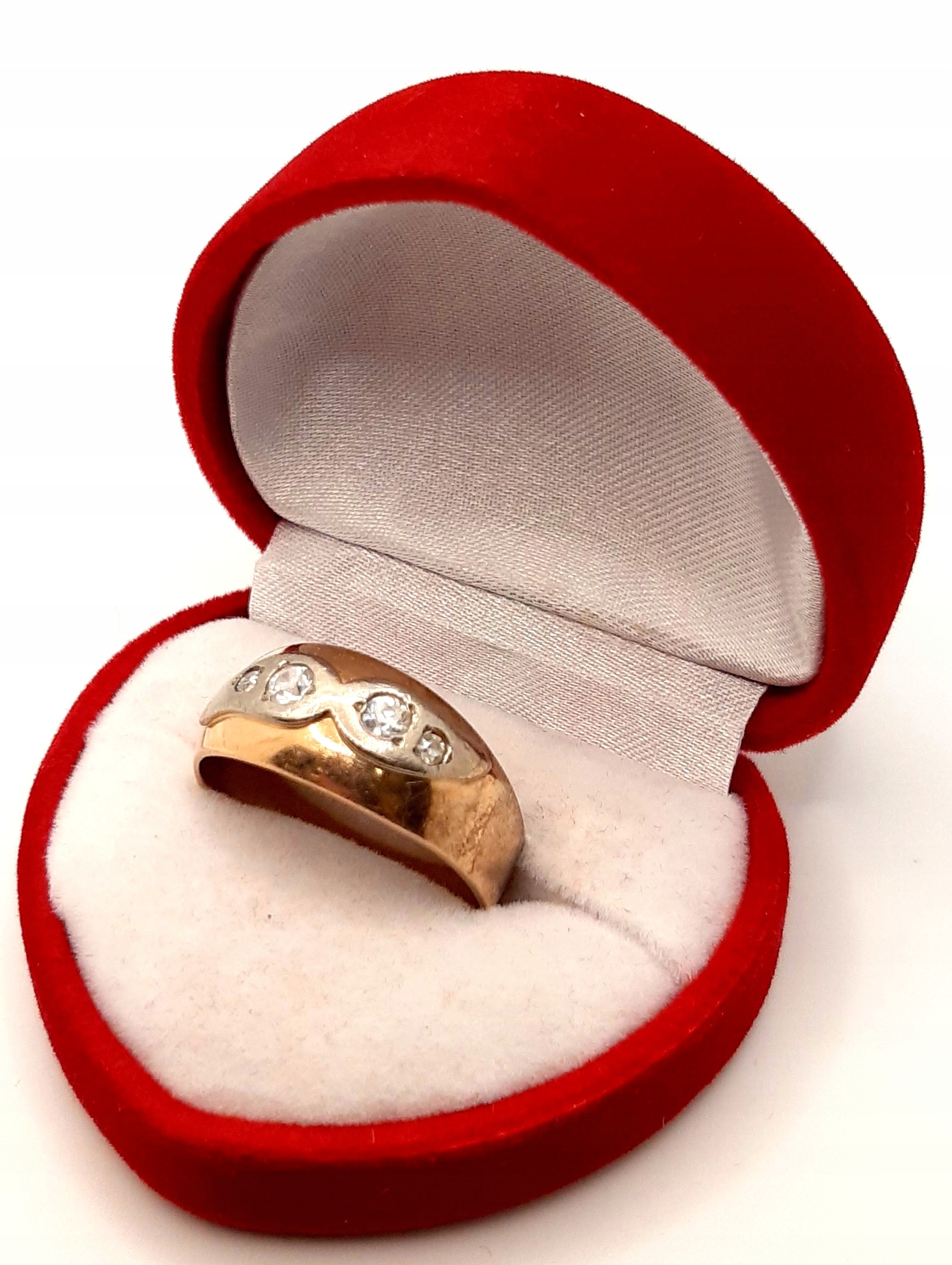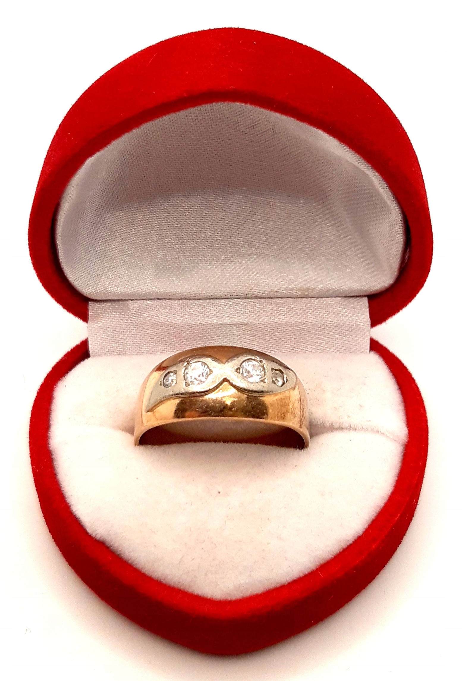 Oferujemy na sprzedaż złoty pierścionek w kształcie obrączki, ozdobiony cyrkoniami .