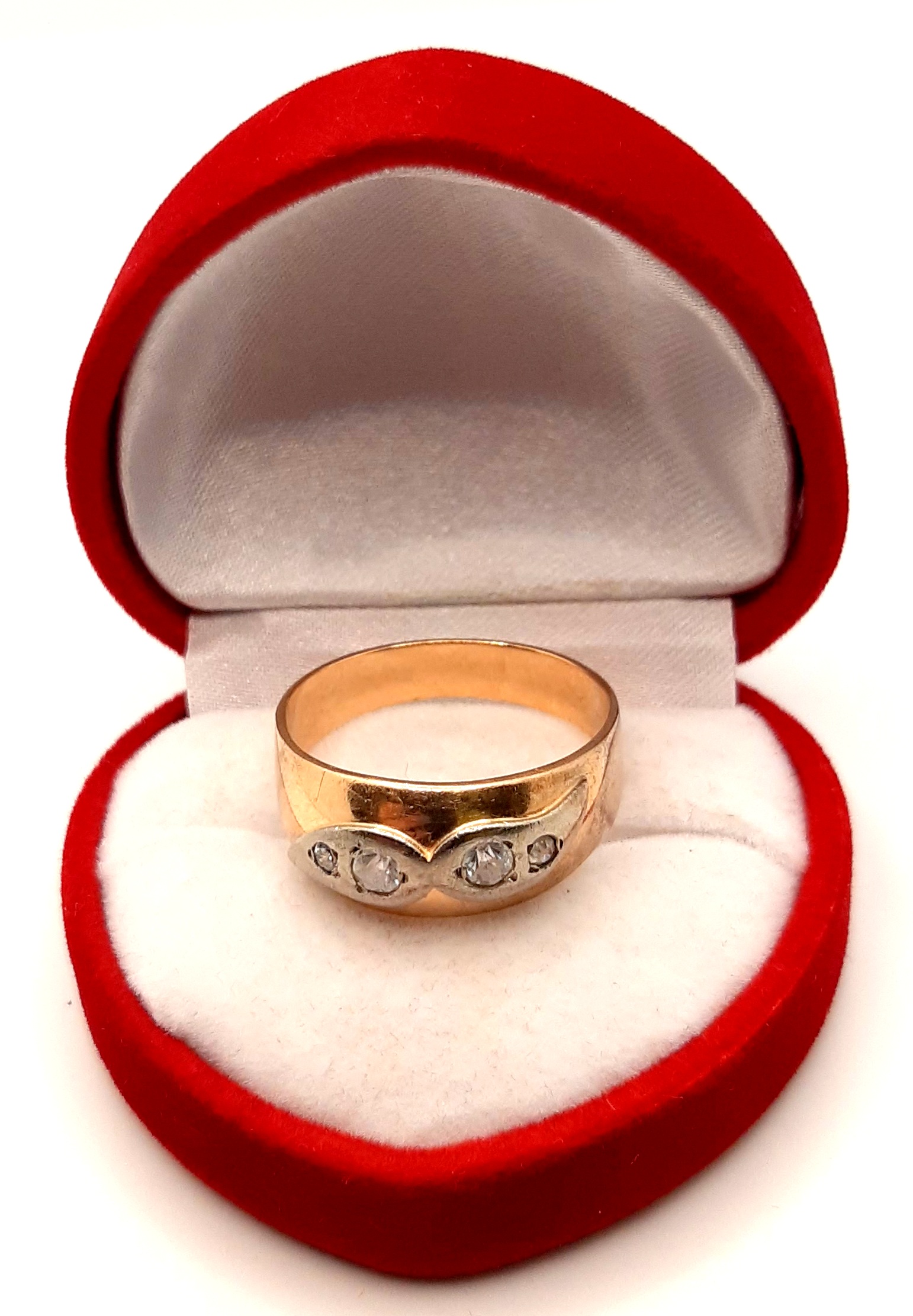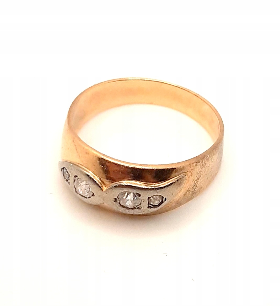 Pierścionek w całości wykonany z różowego i białego złota próby 585.