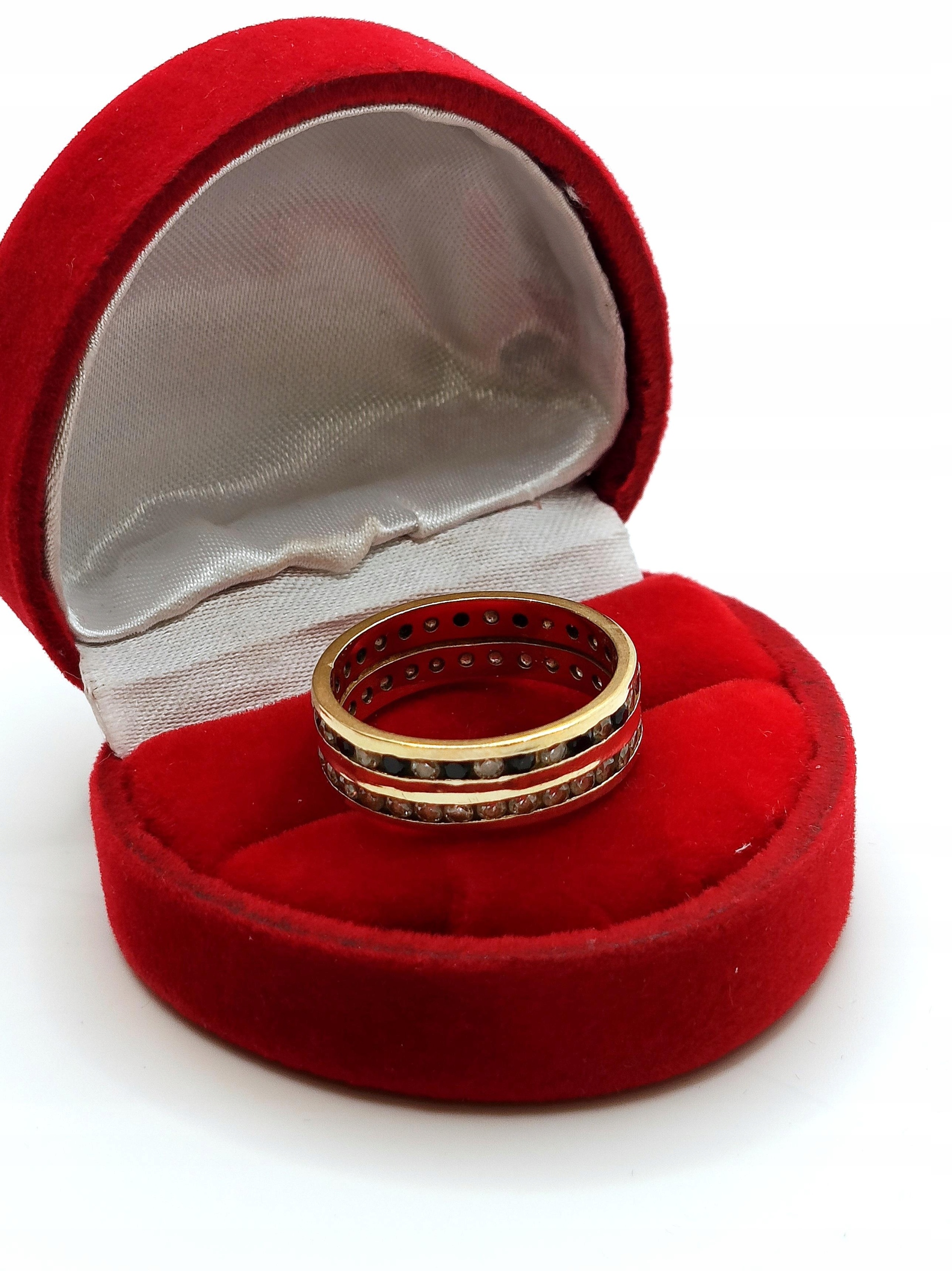 Oferujemy na sprzedaż złoty pierścionek w formie obroczki zdobionej dwoma rzędami cyrkonii.