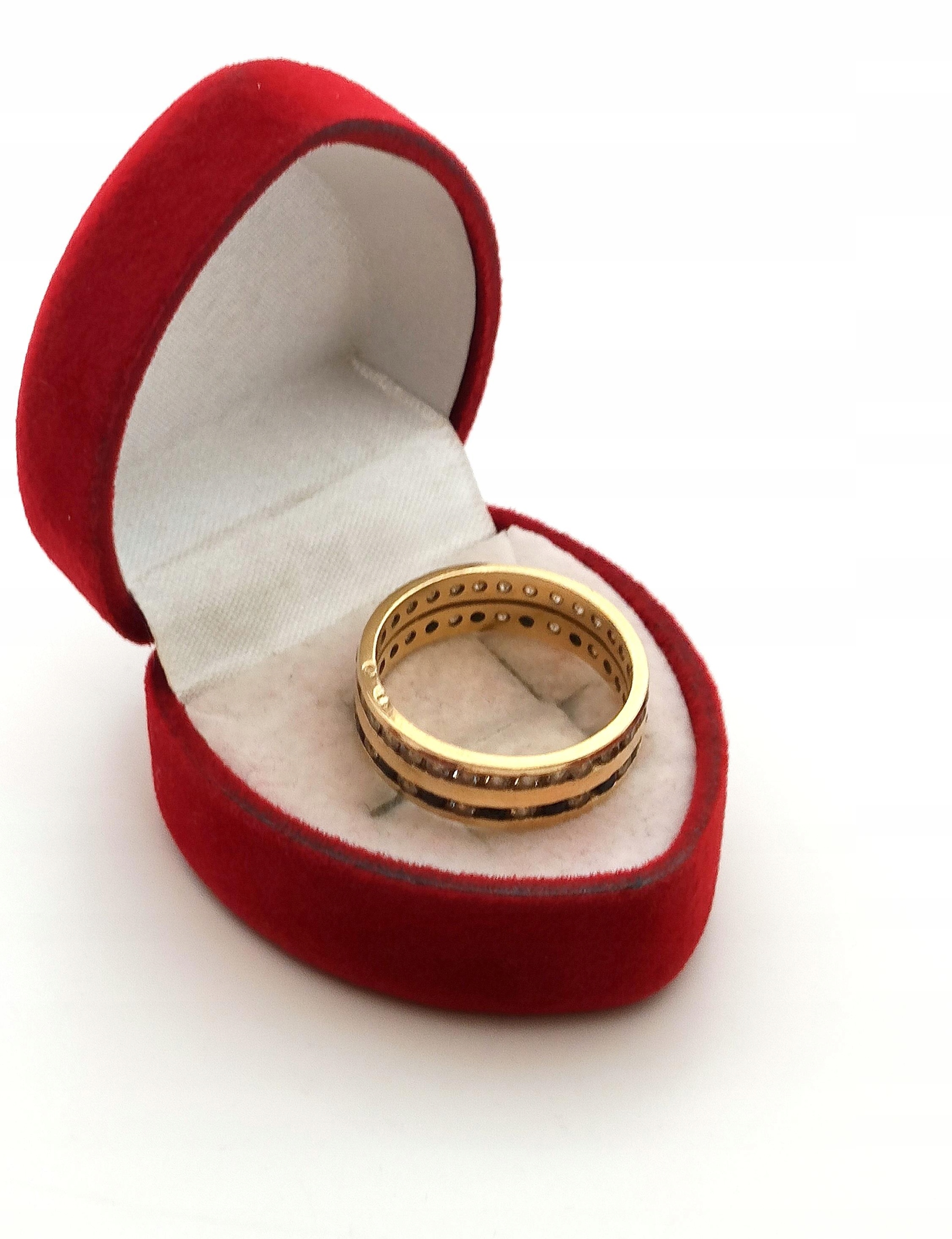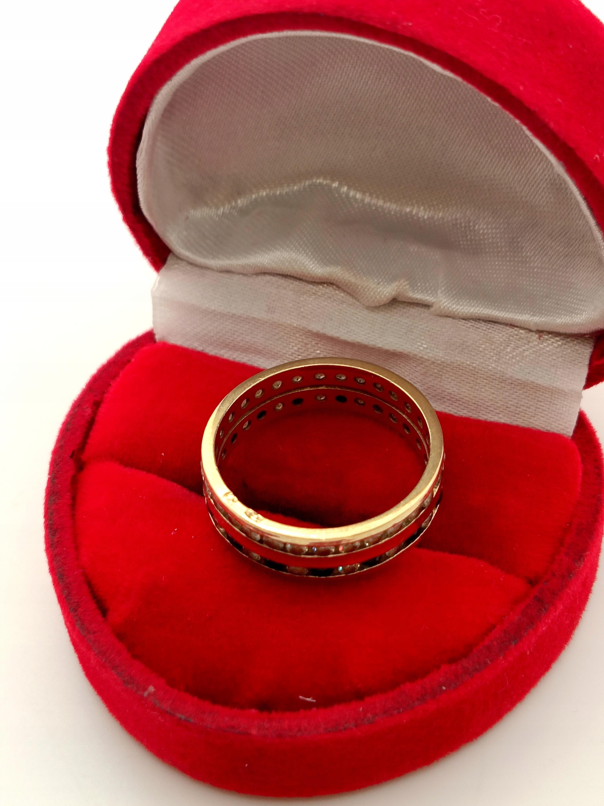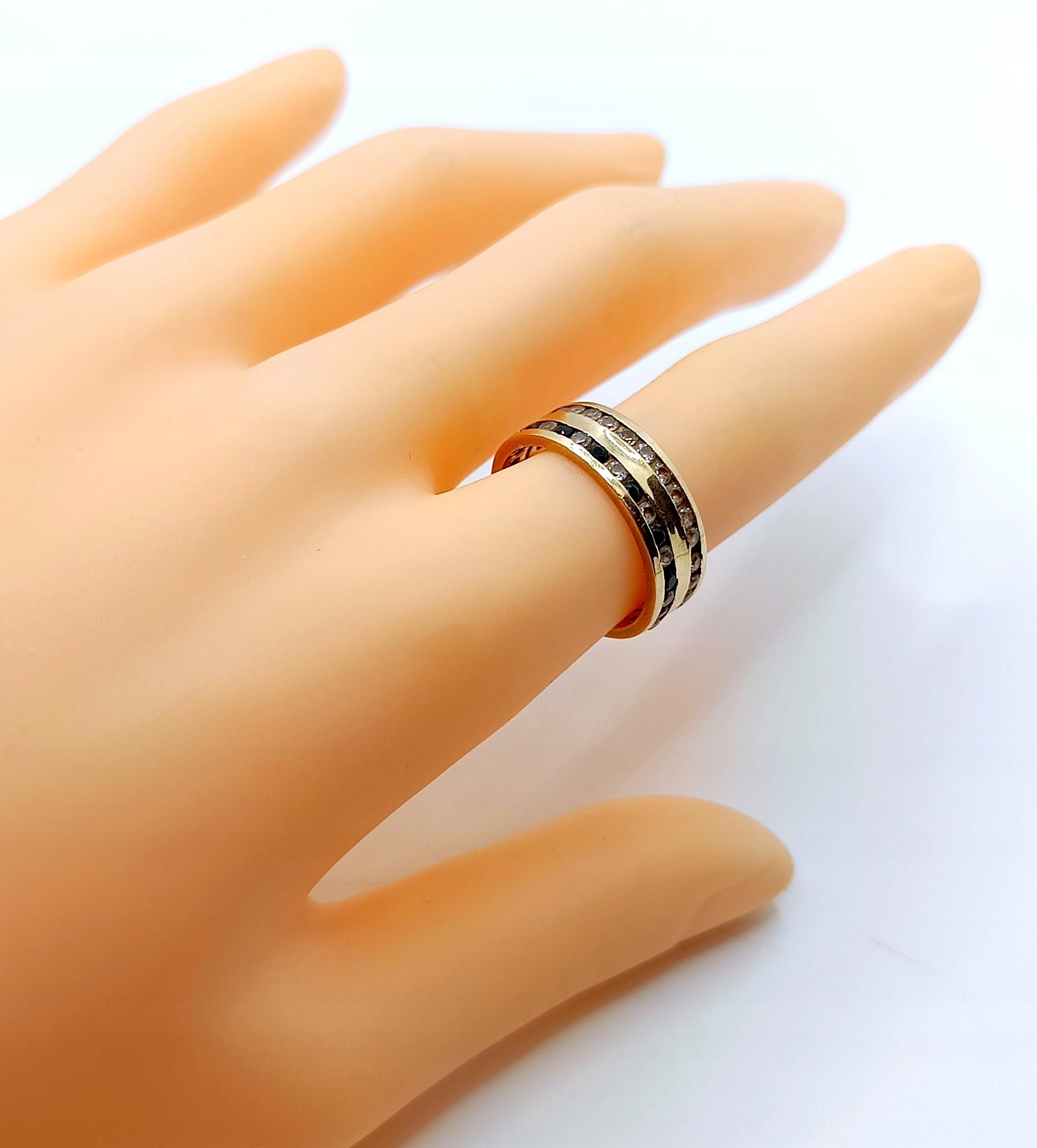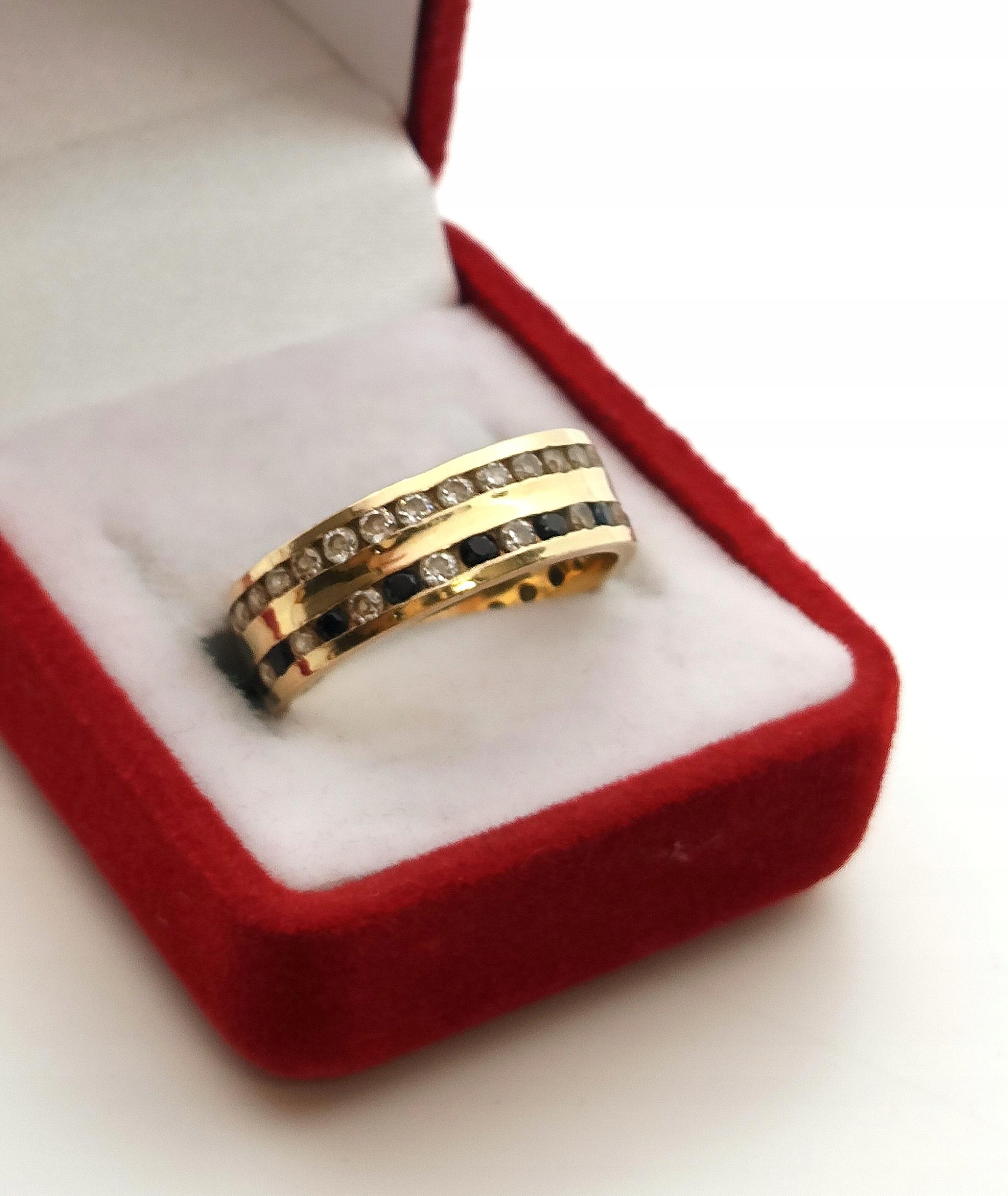 Oferujemy na sprzedaż złoty pierścionek w formie obroczki zdobionej dwoma rzędami cyrkonii.