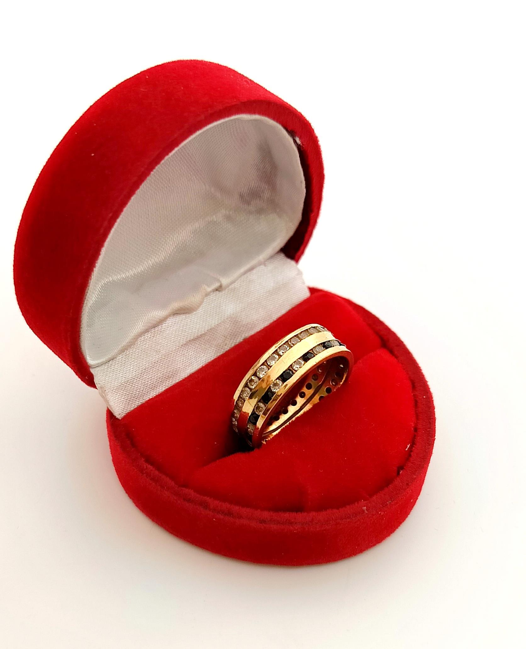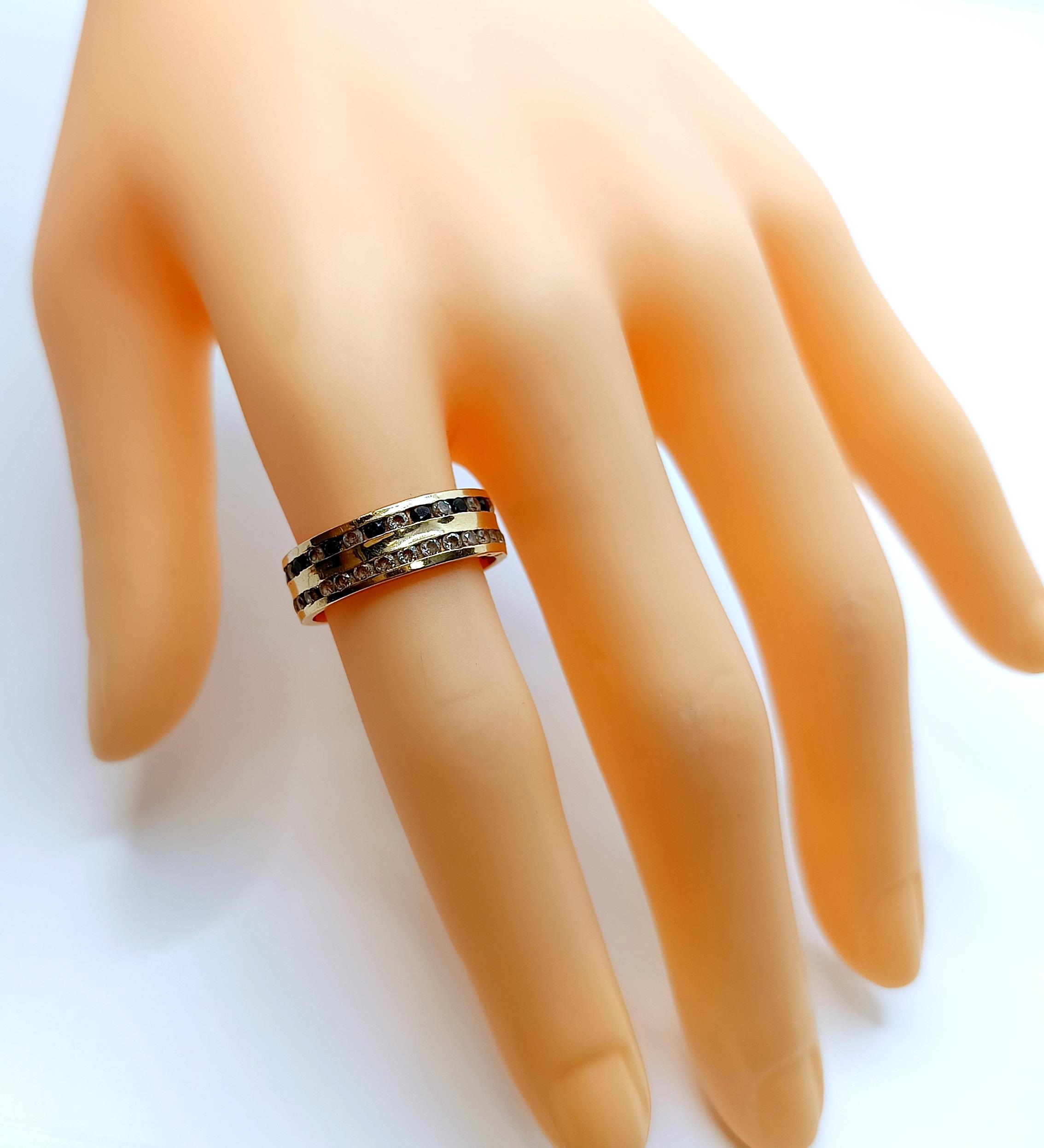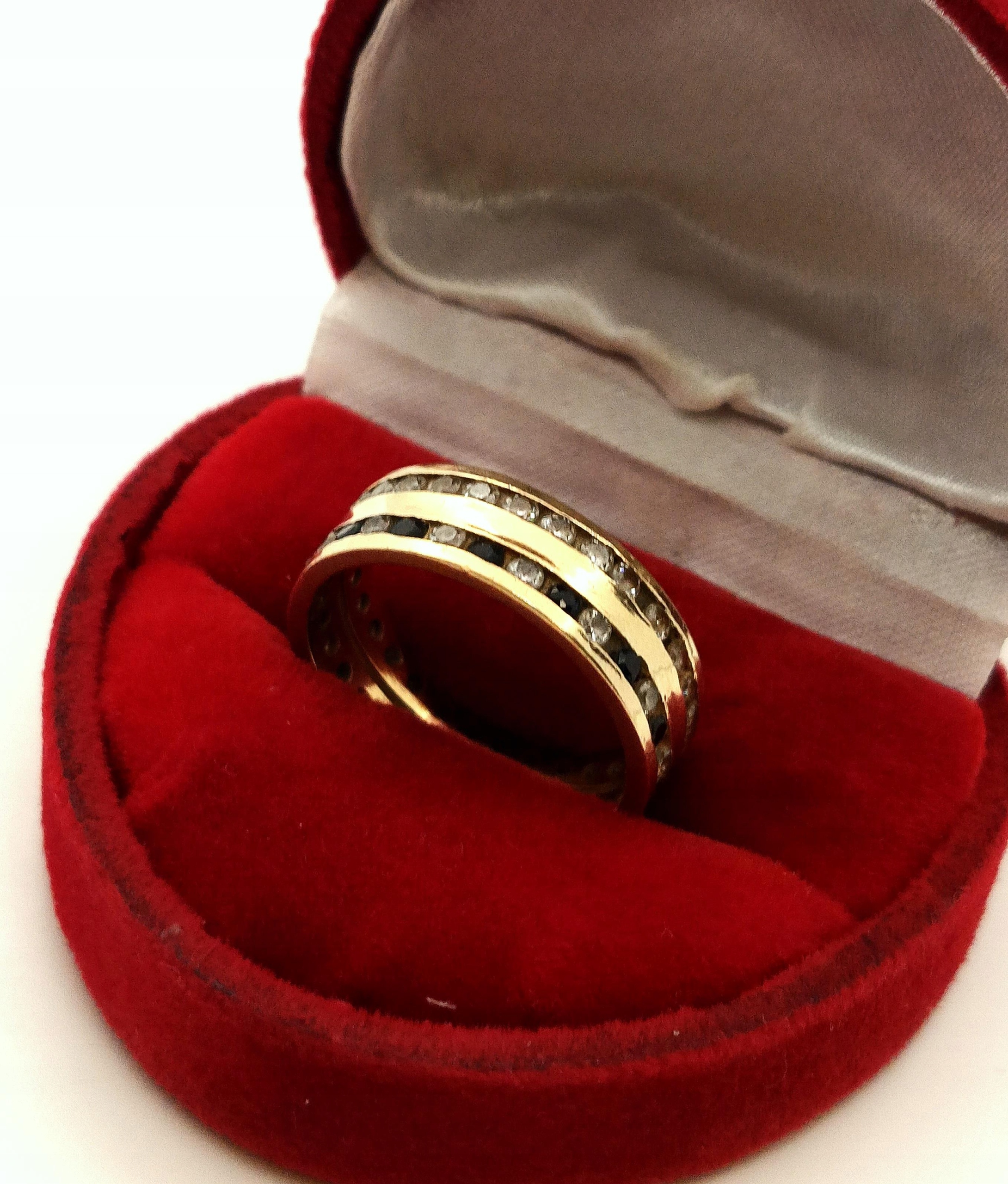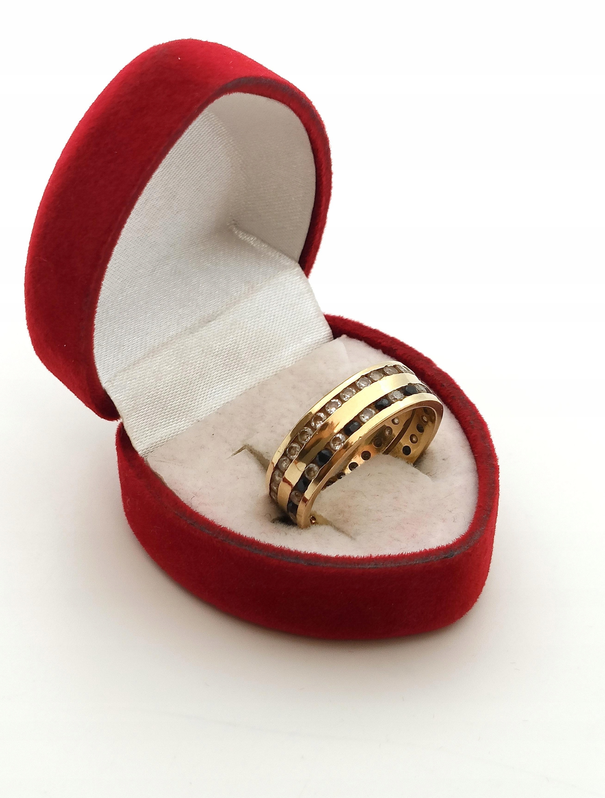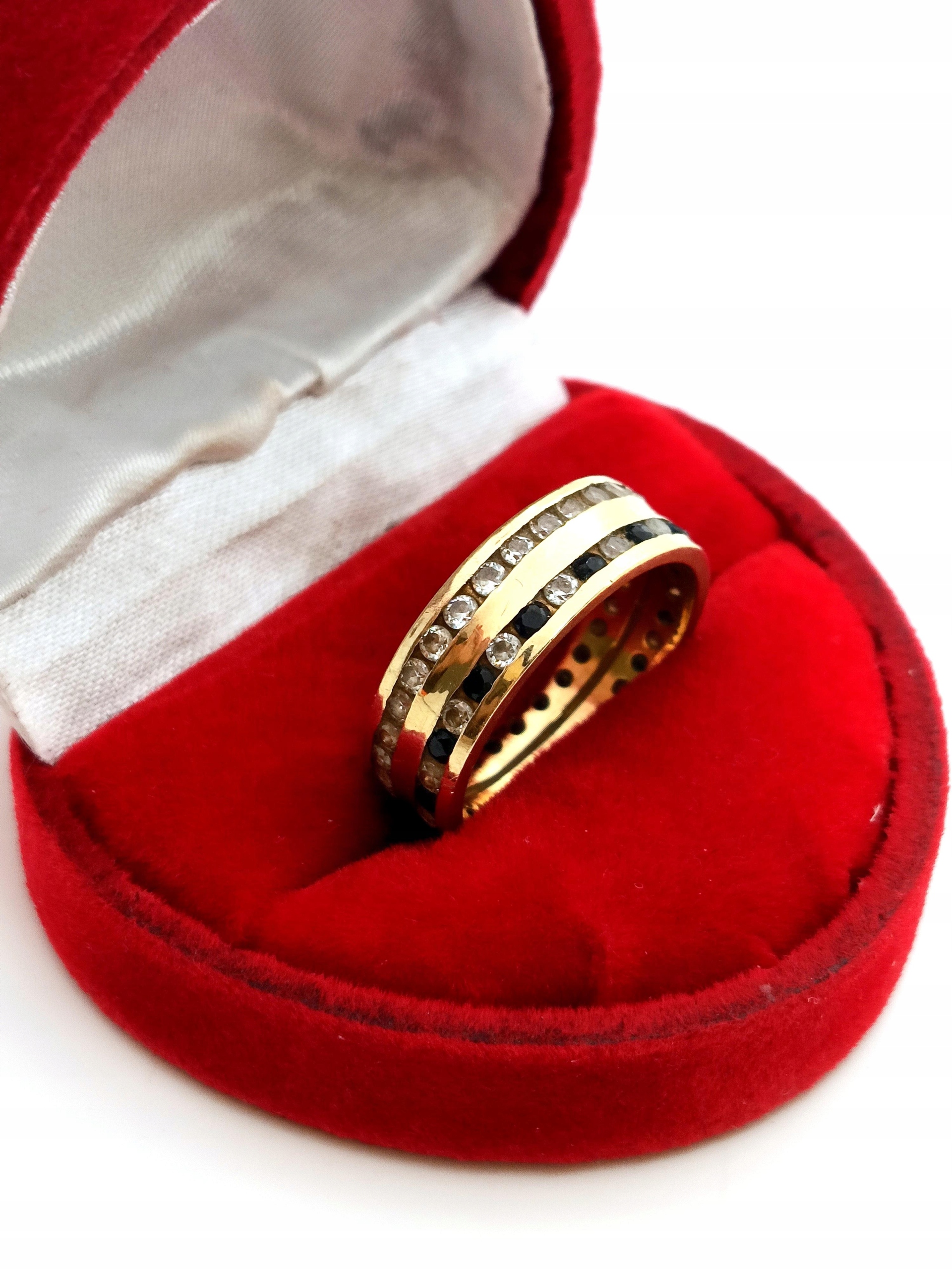 Oferujemy na sprzedaż złoty pierścionek w formie obroczki zdobionej dwoma rzędami cyrkonii.