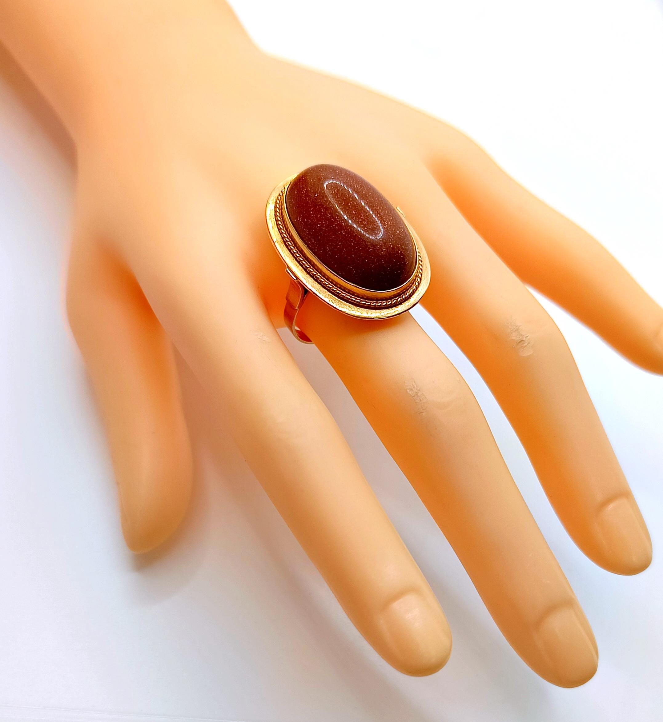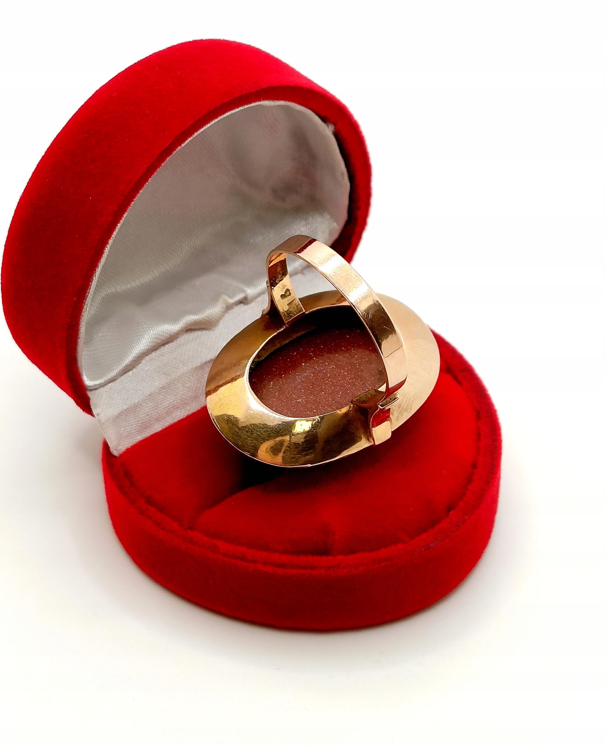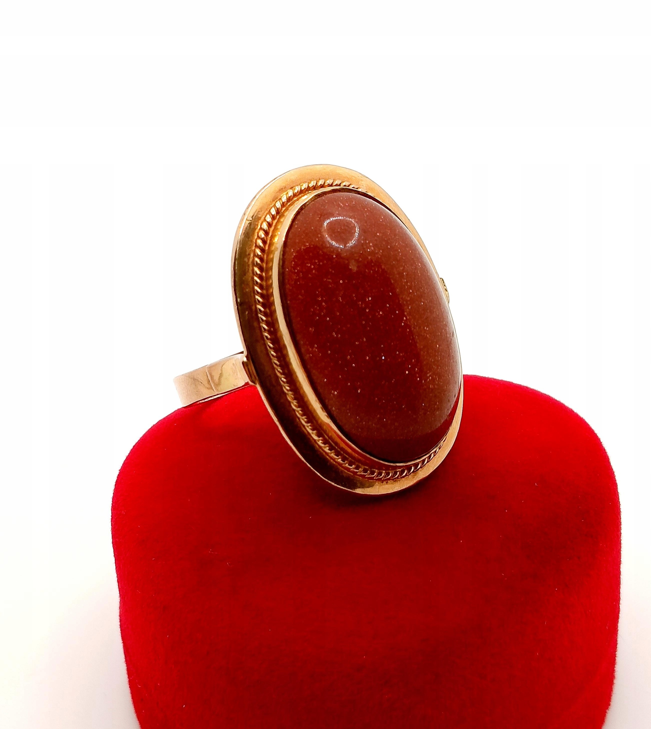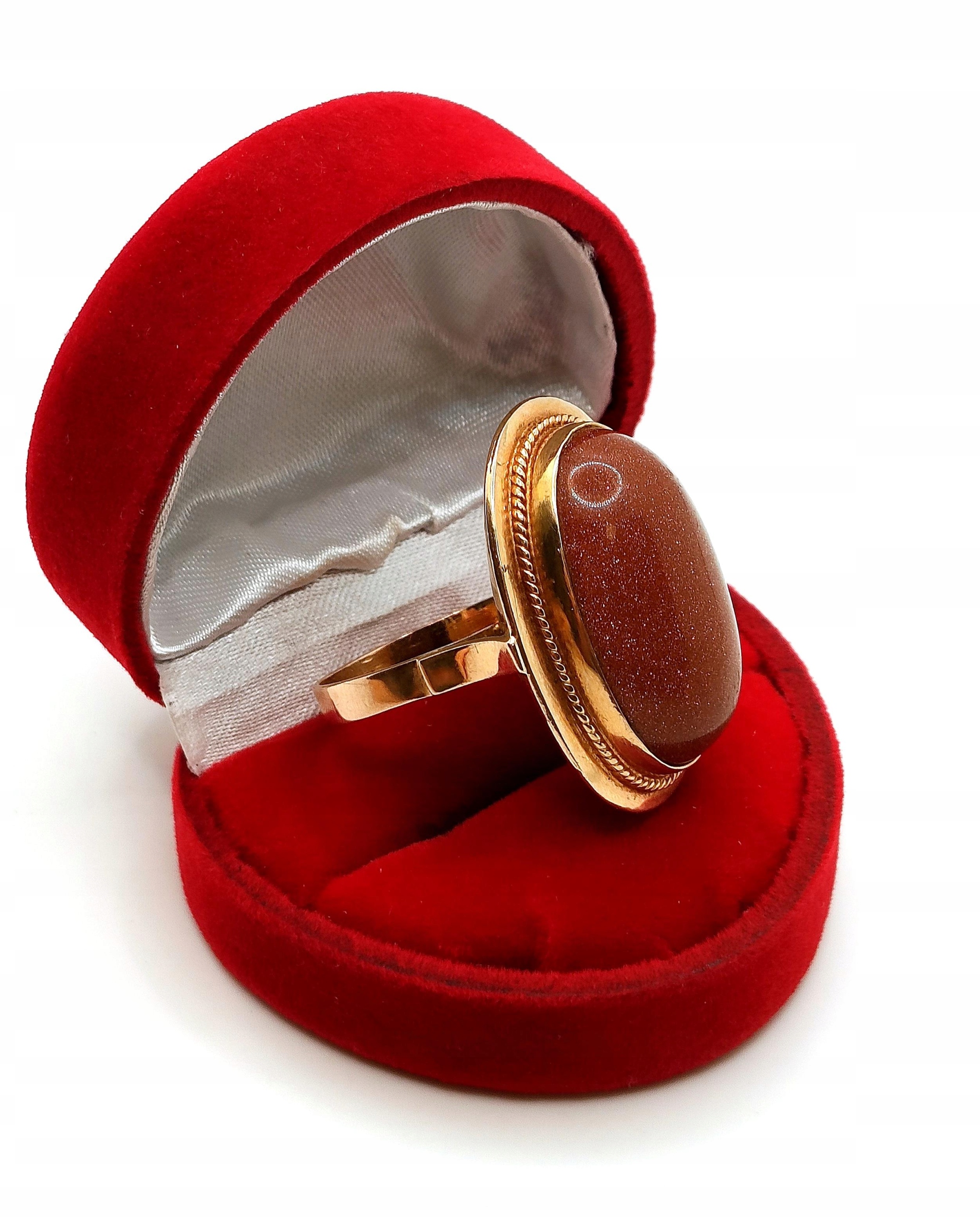 Oferujemy na sprzedaż złoty pierścionek z okazałym Piaskiem Pustyni. Piękny brąz kamienia ze złotymi drobinkami mieniącymi się w świetle.