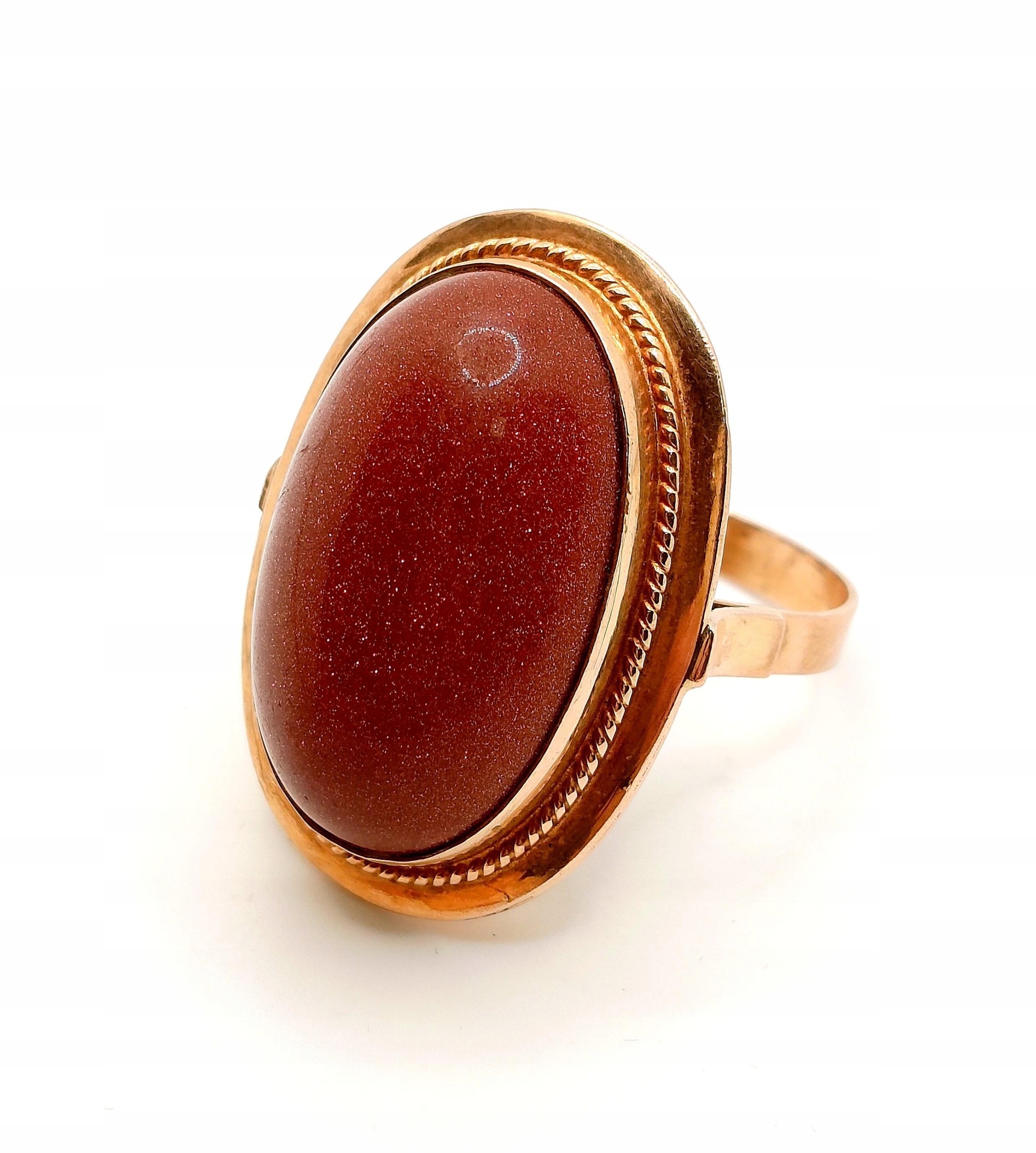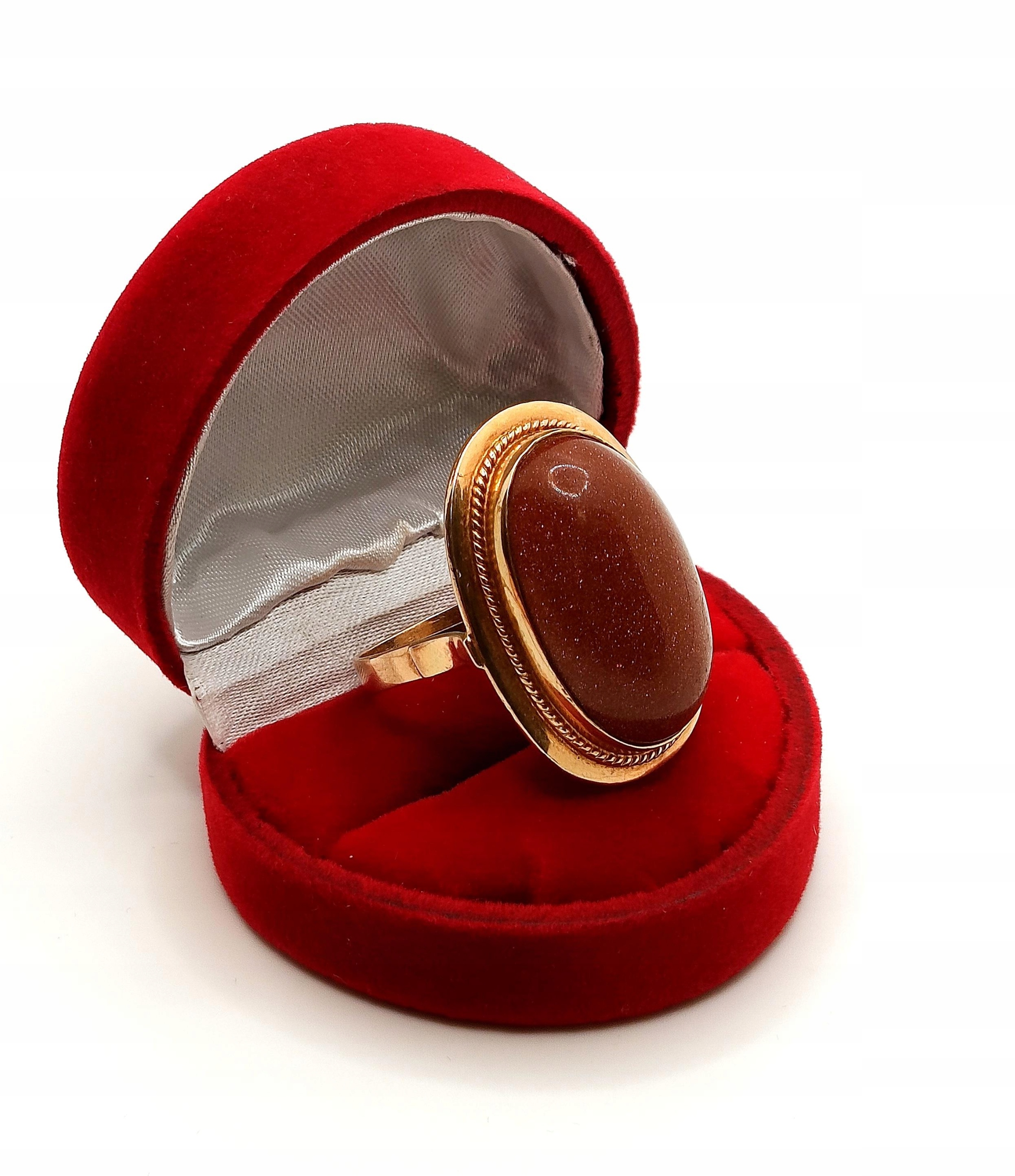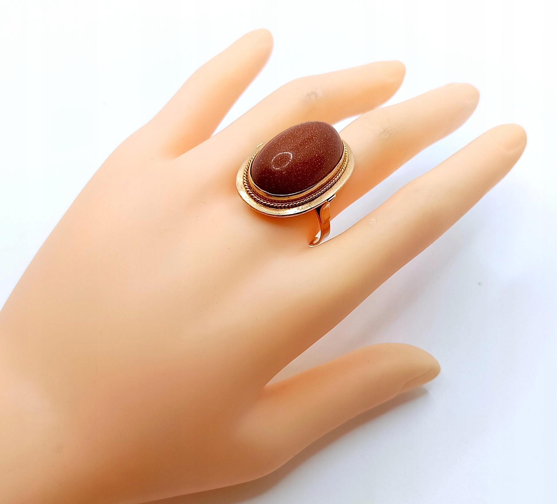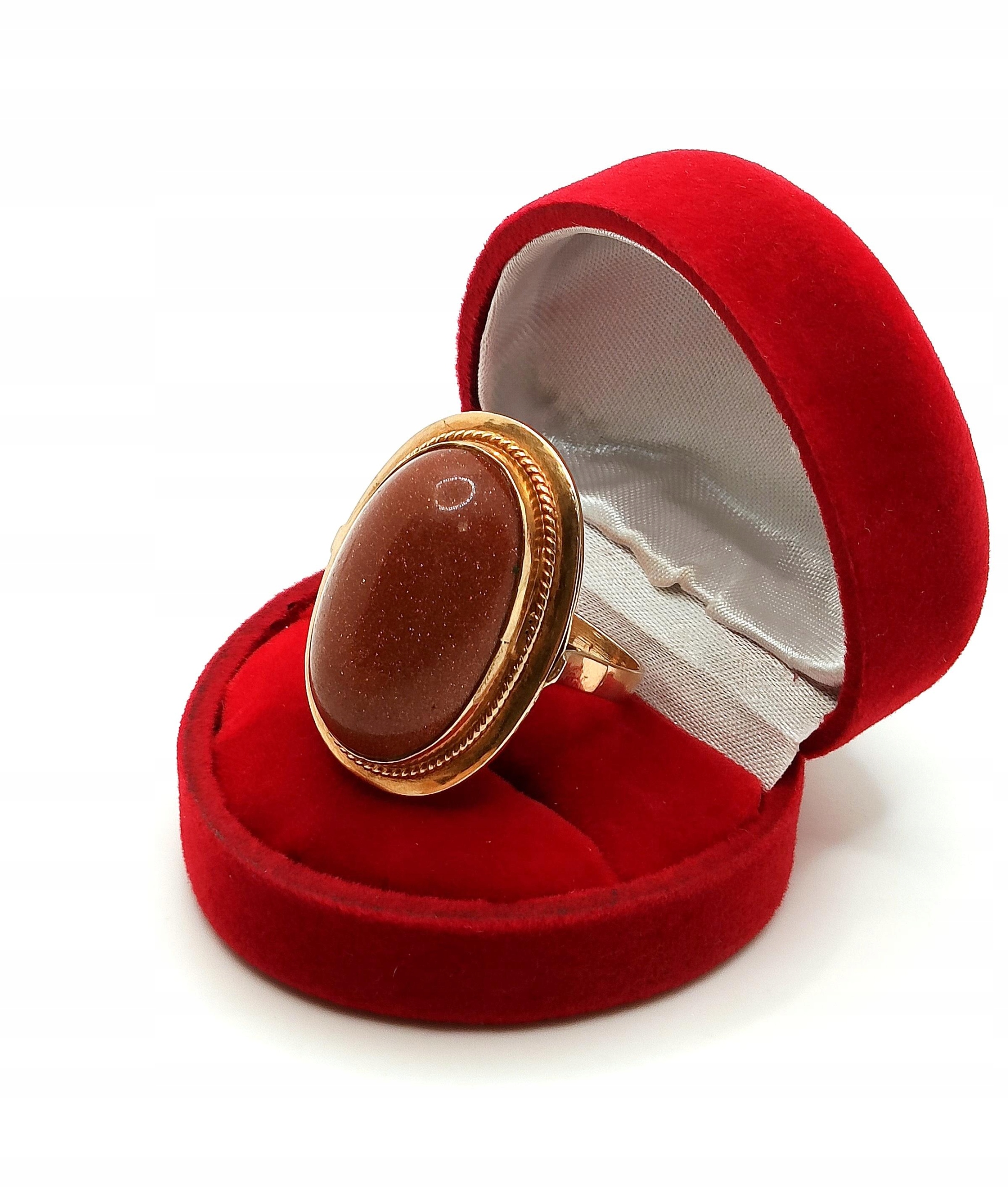 Oferujemy na sprzedaż złoty pierścionek z okazałym Piaskiem Pustyni. Piękny brąz kamienia ze złotymi drobinkami mieniącymi się w świetle.