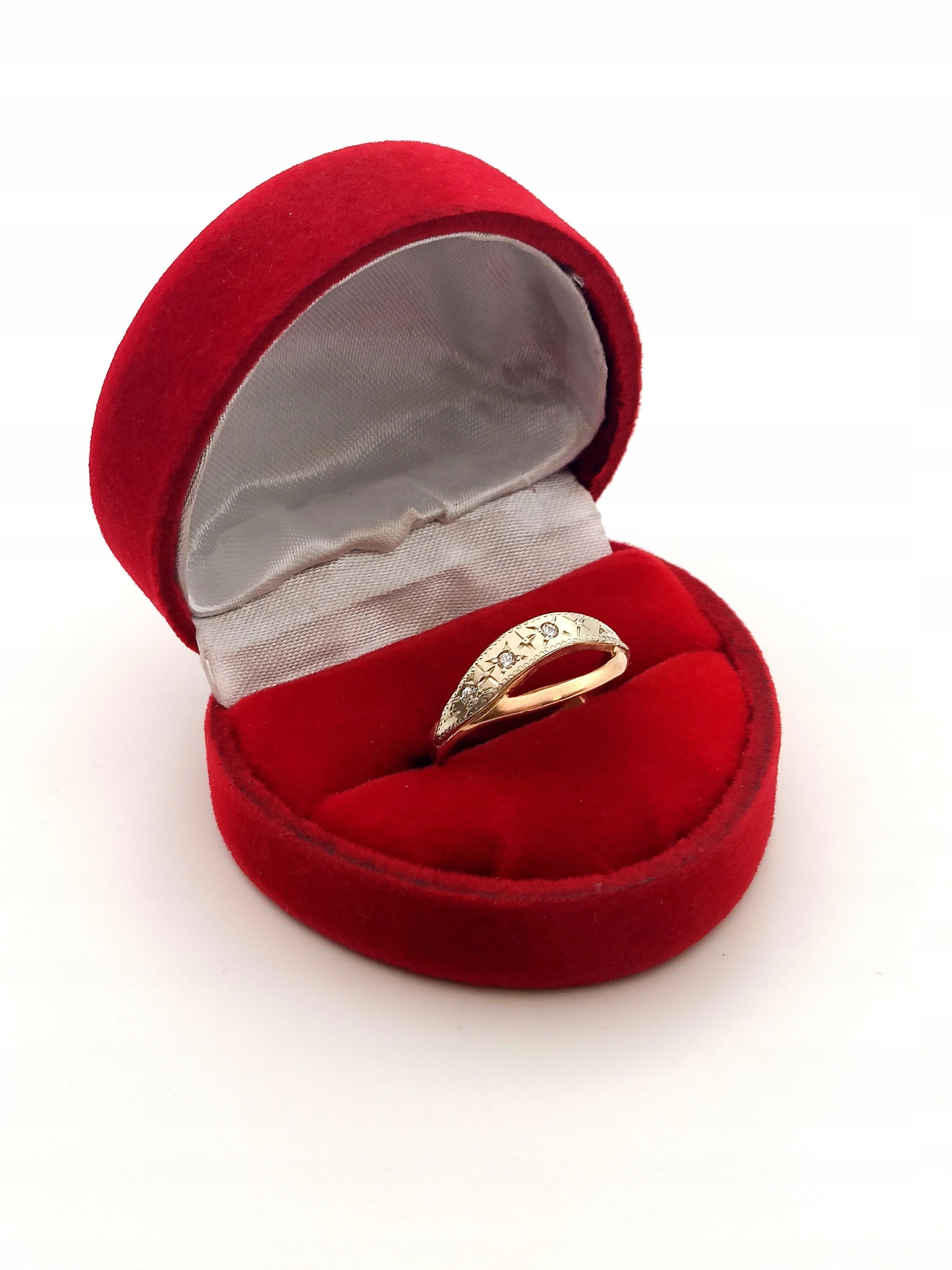 Oferujemy na sprzedaż złoty, płaski pierścionek ozdobiony cyrkoniami.