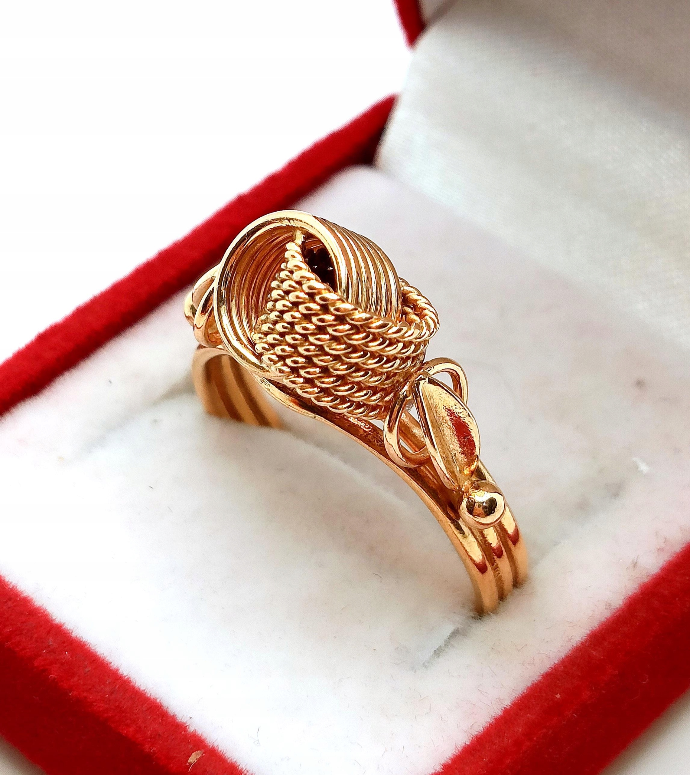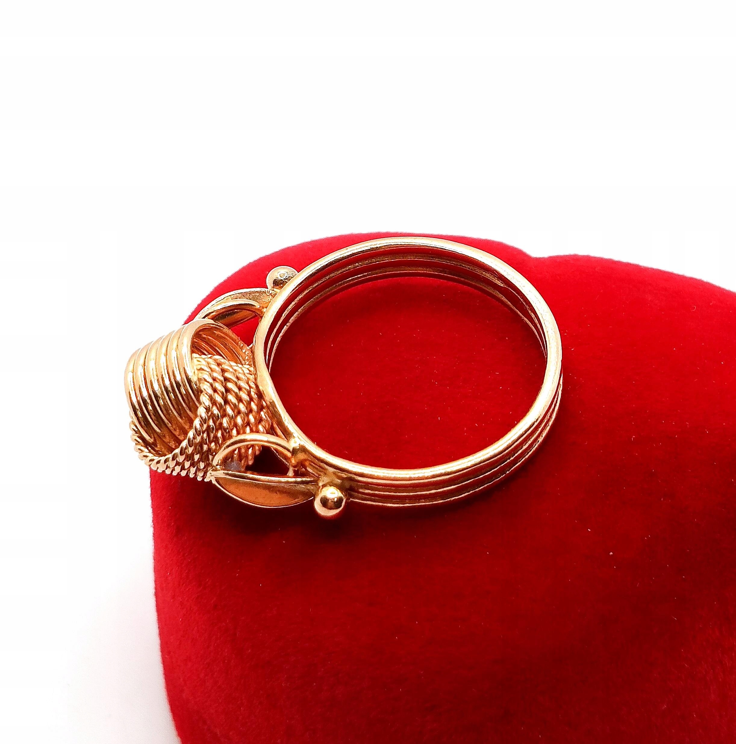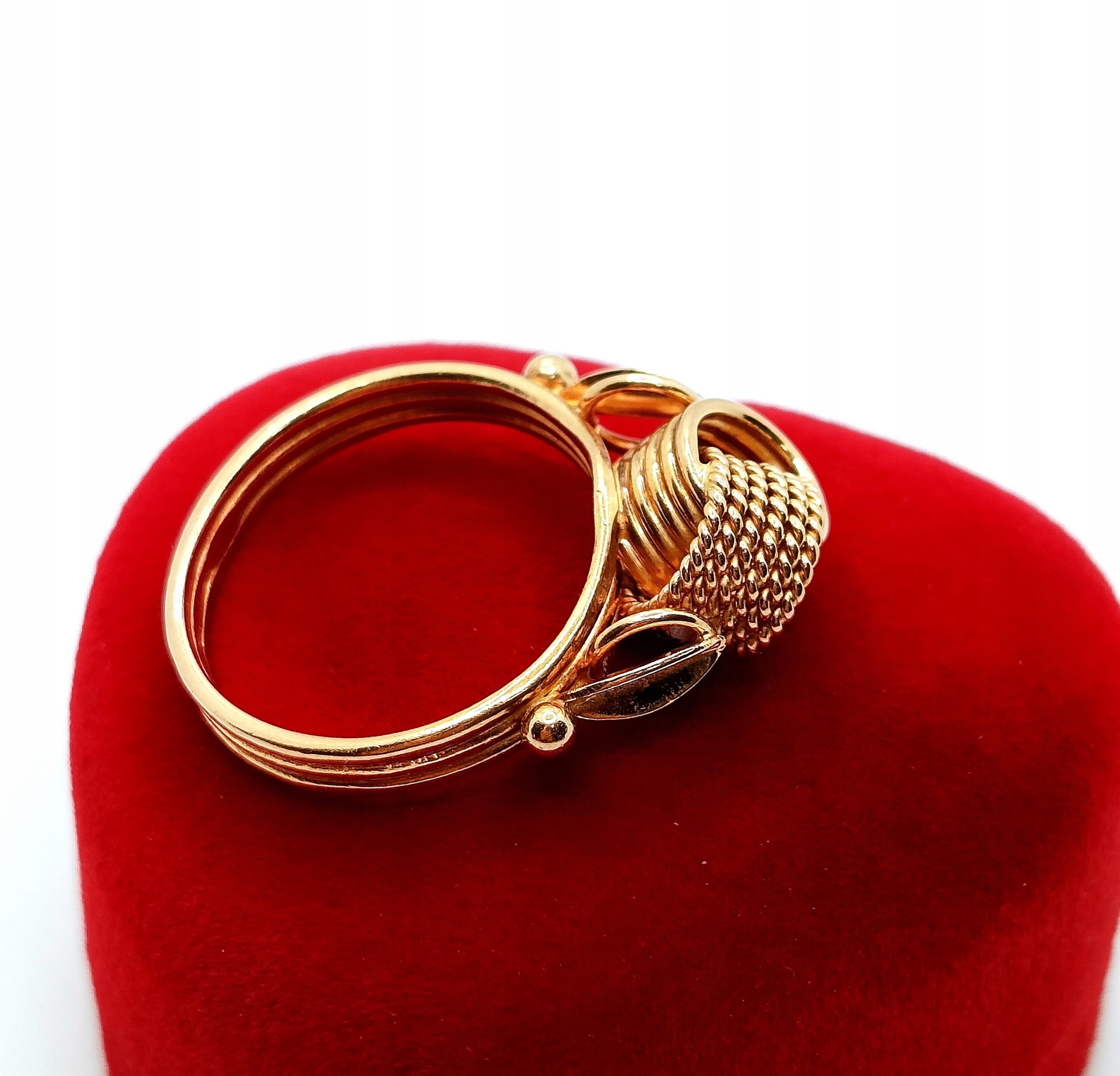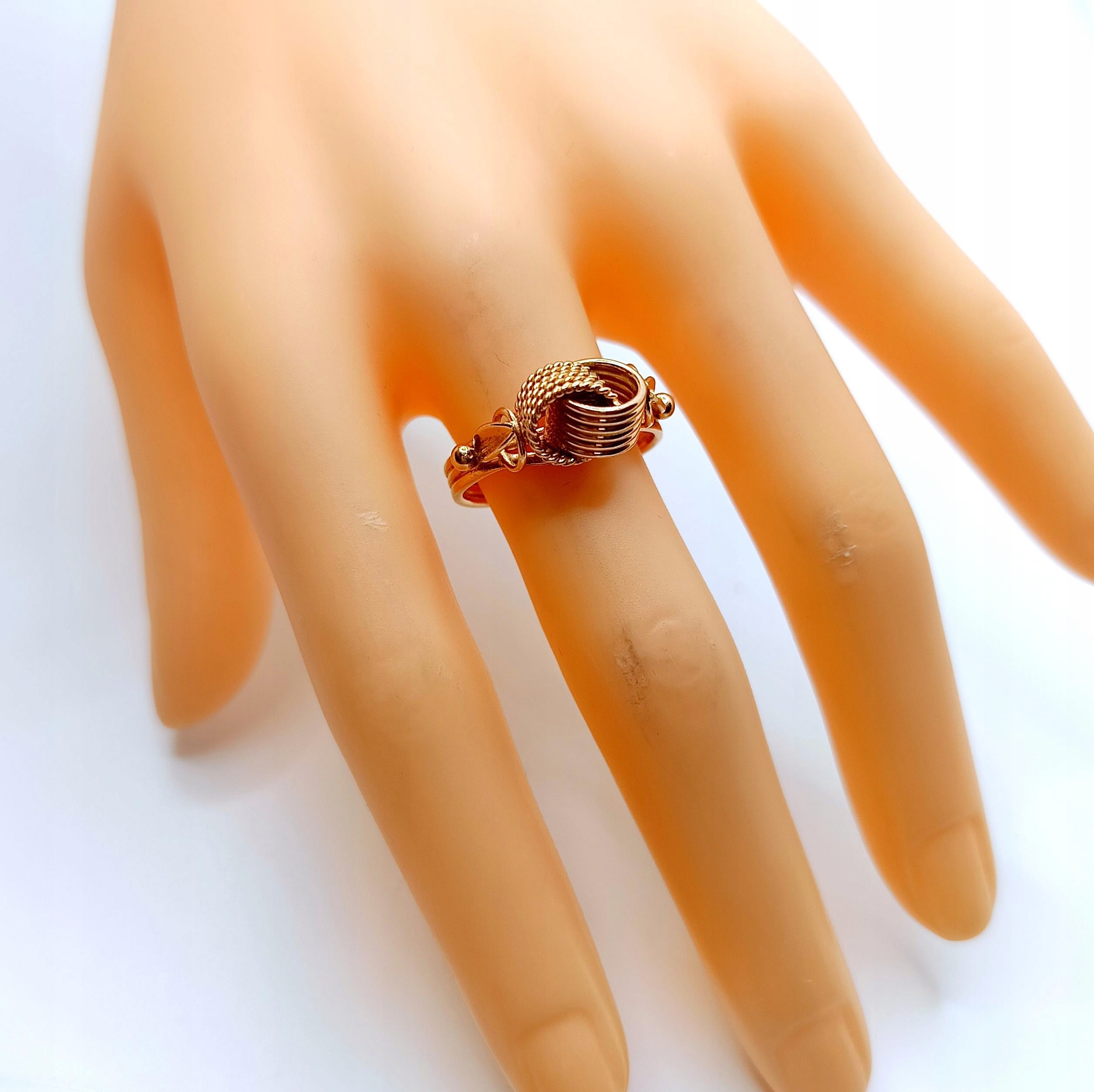 Oferujemy na sprzedaż złoty pierścionek przedstawiający dwa przepleciona koła o różnej fakturze.
