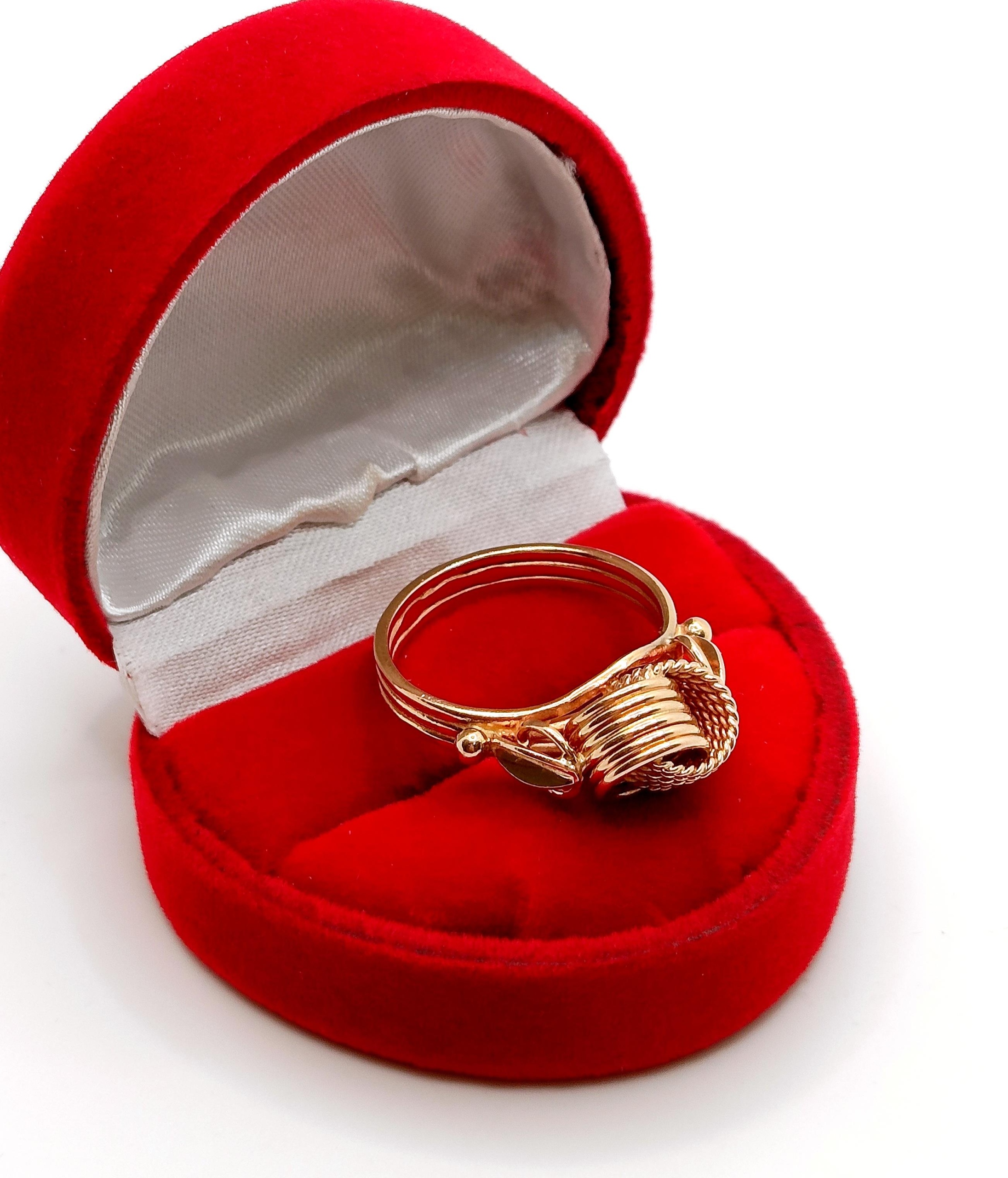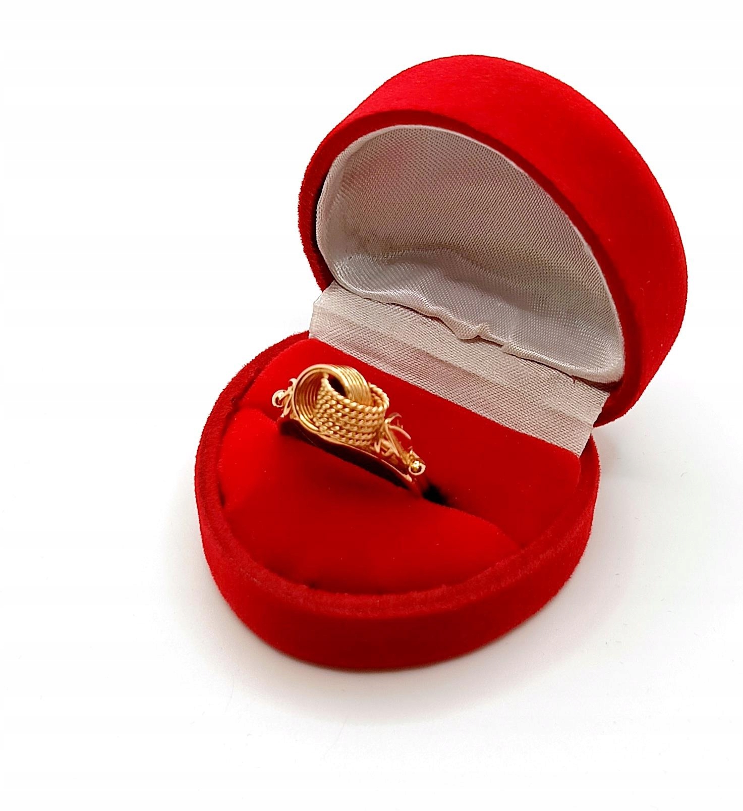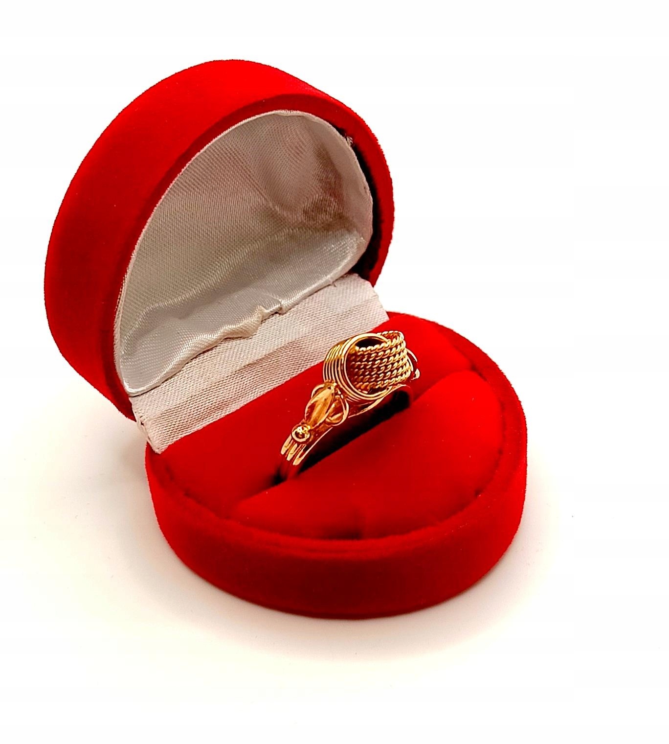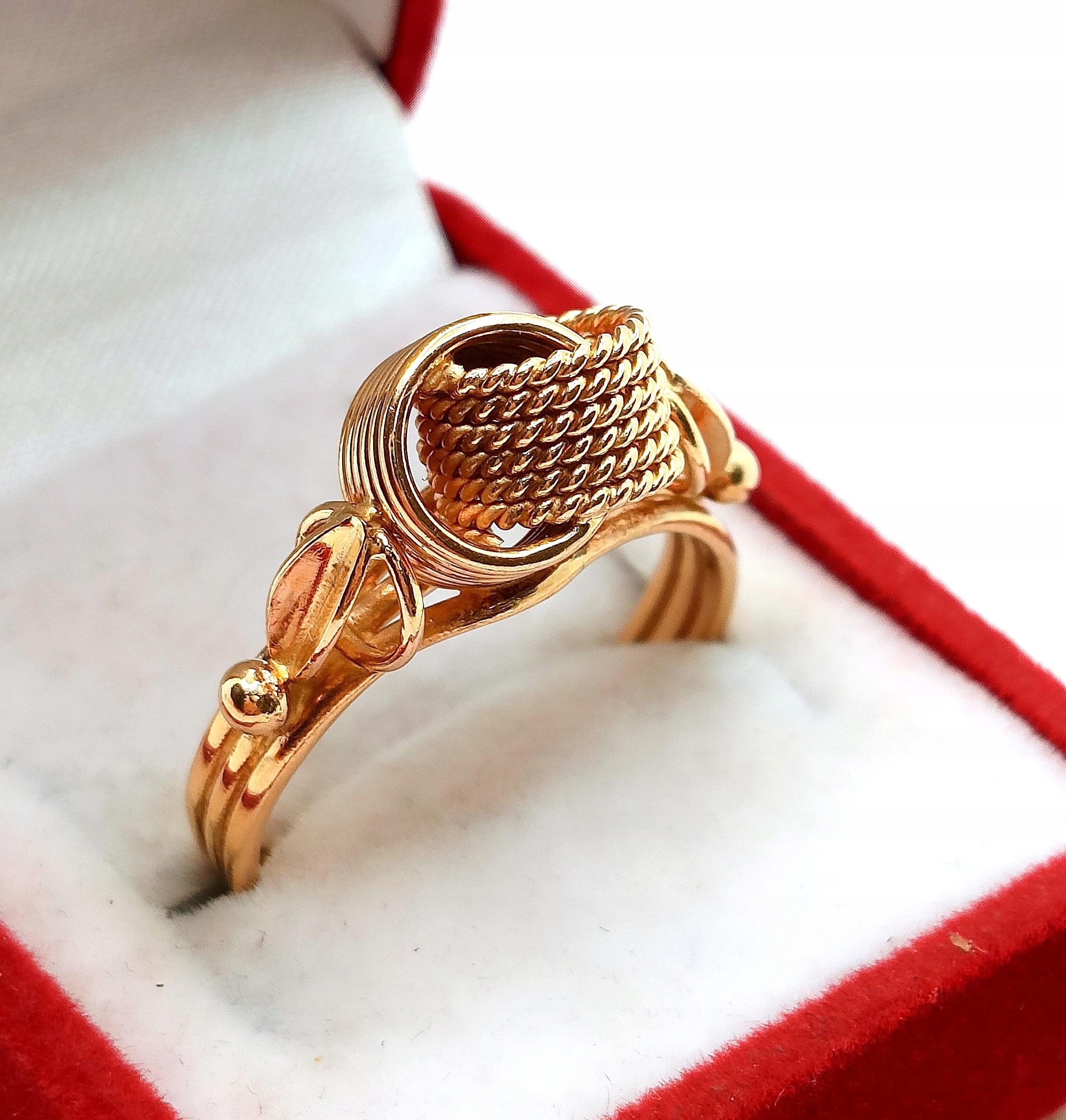 Oferujemy na sprzedaż złoty pierścionek przedstawiający dwa przepleciona koła o różnej fakturze.