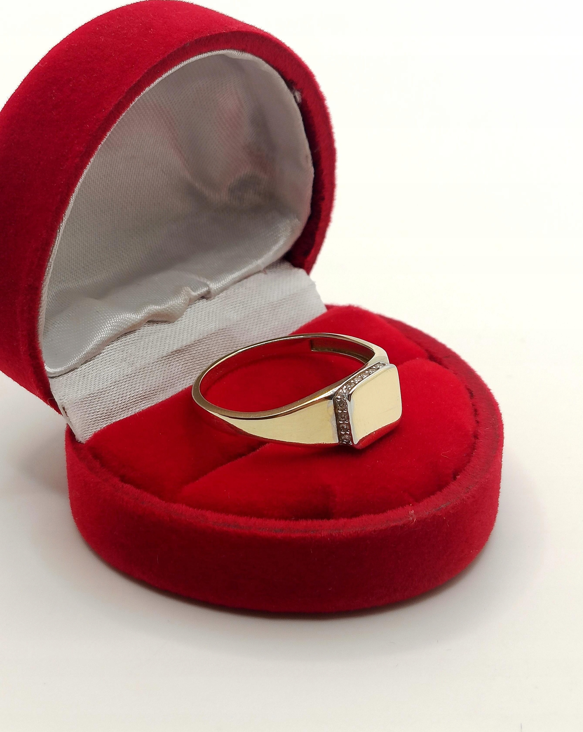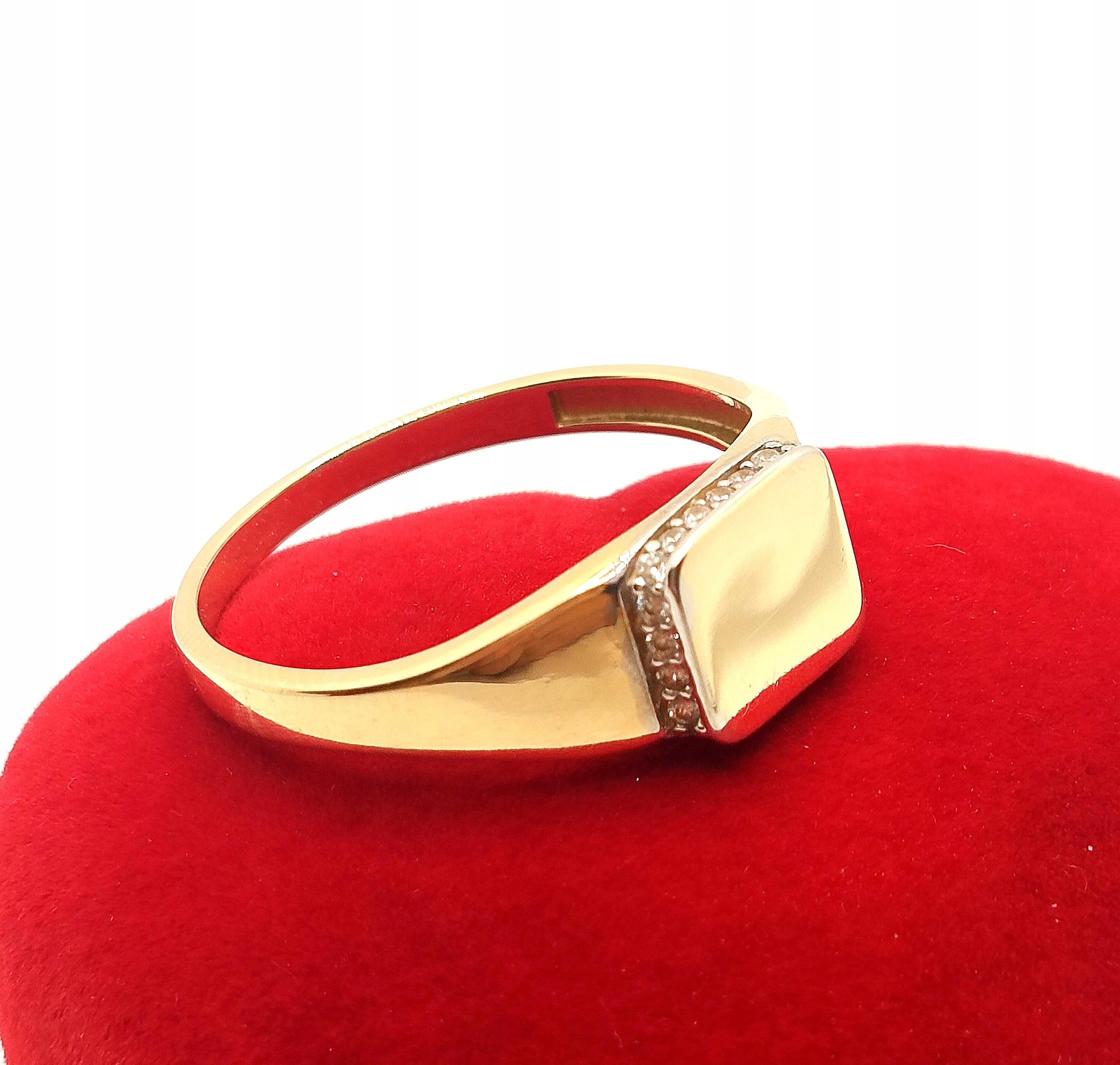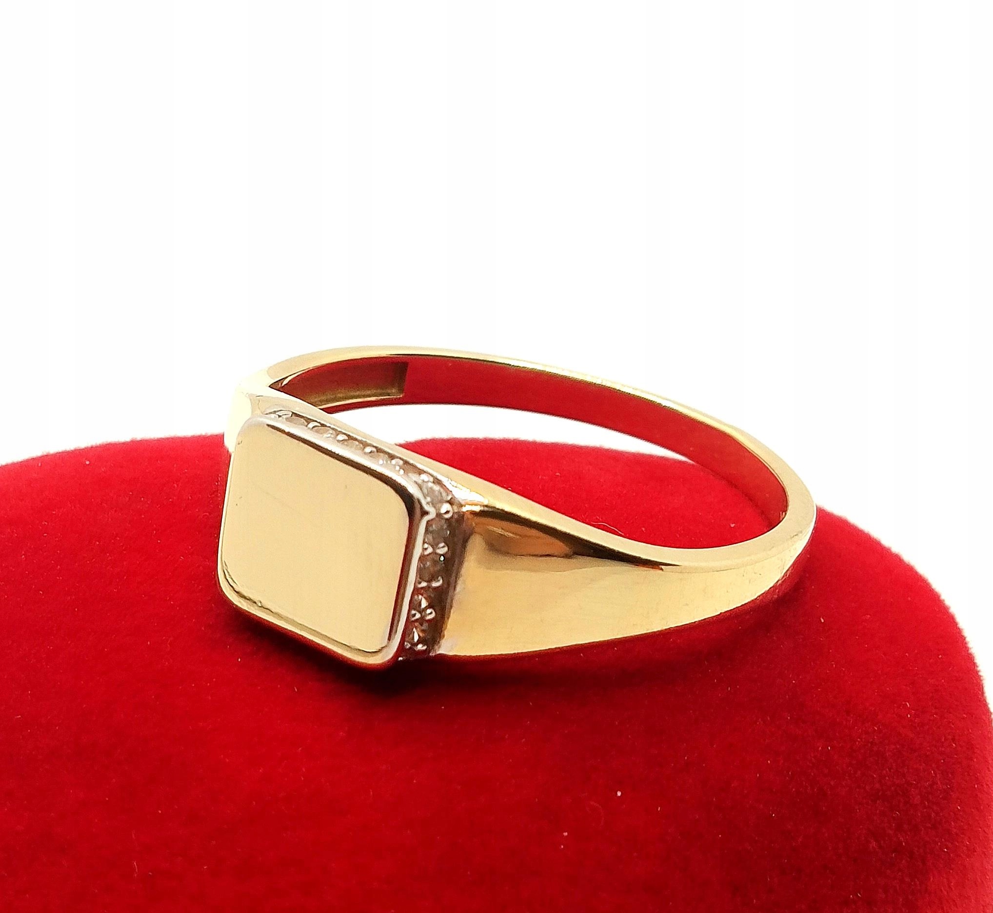 Oferujemy na sprzedaż złoty sygnet zdobiony cyrkoniami po bokach.