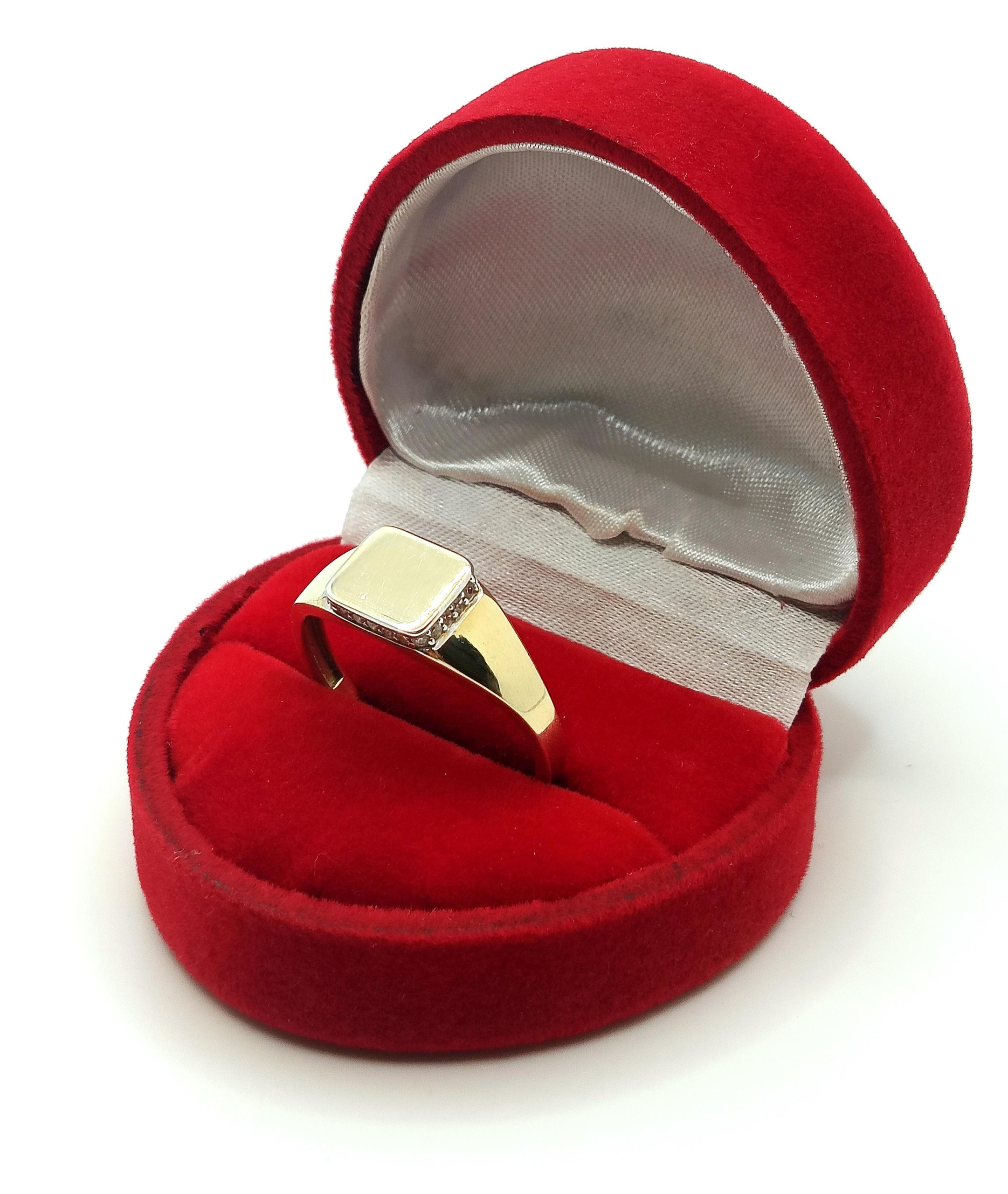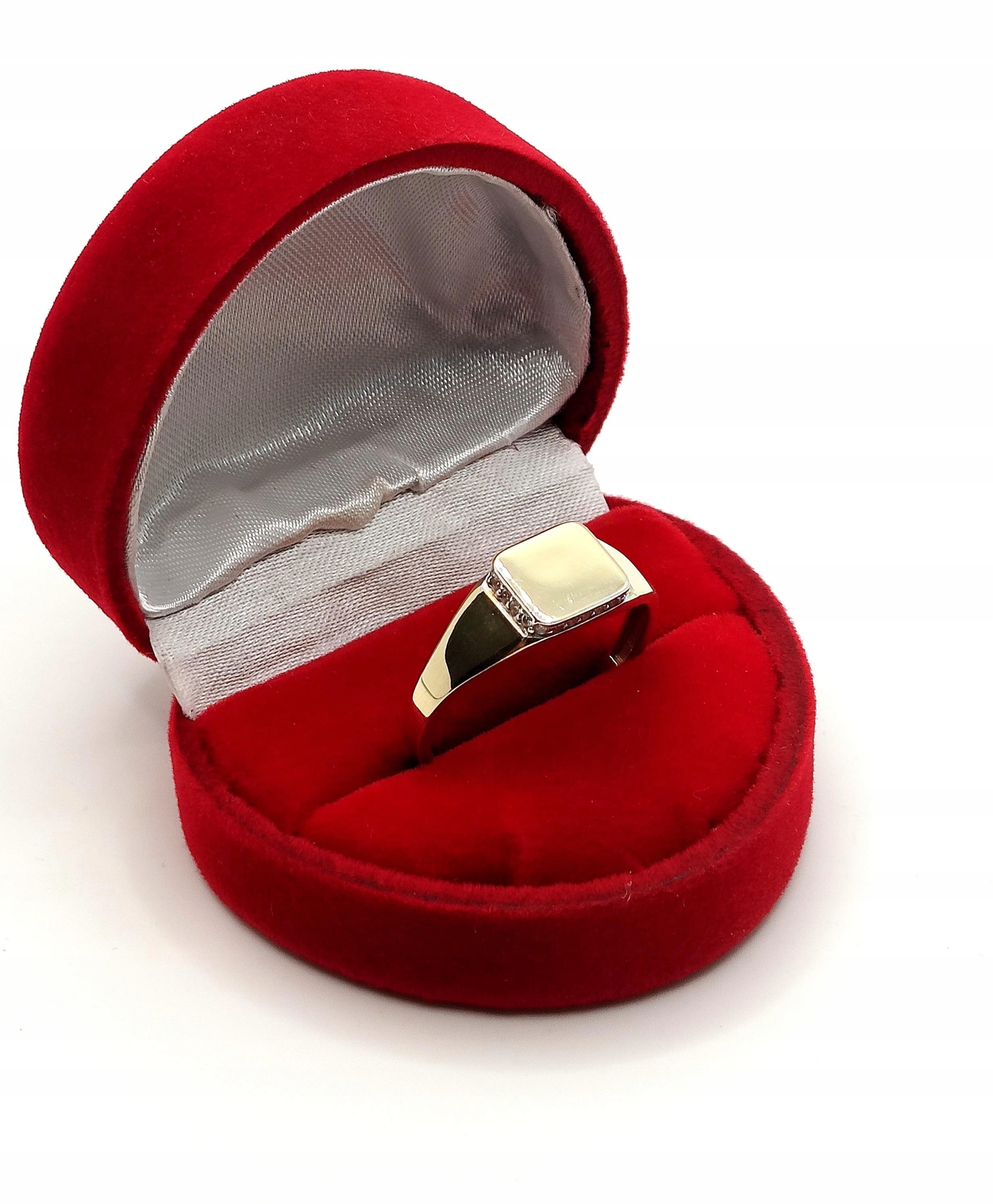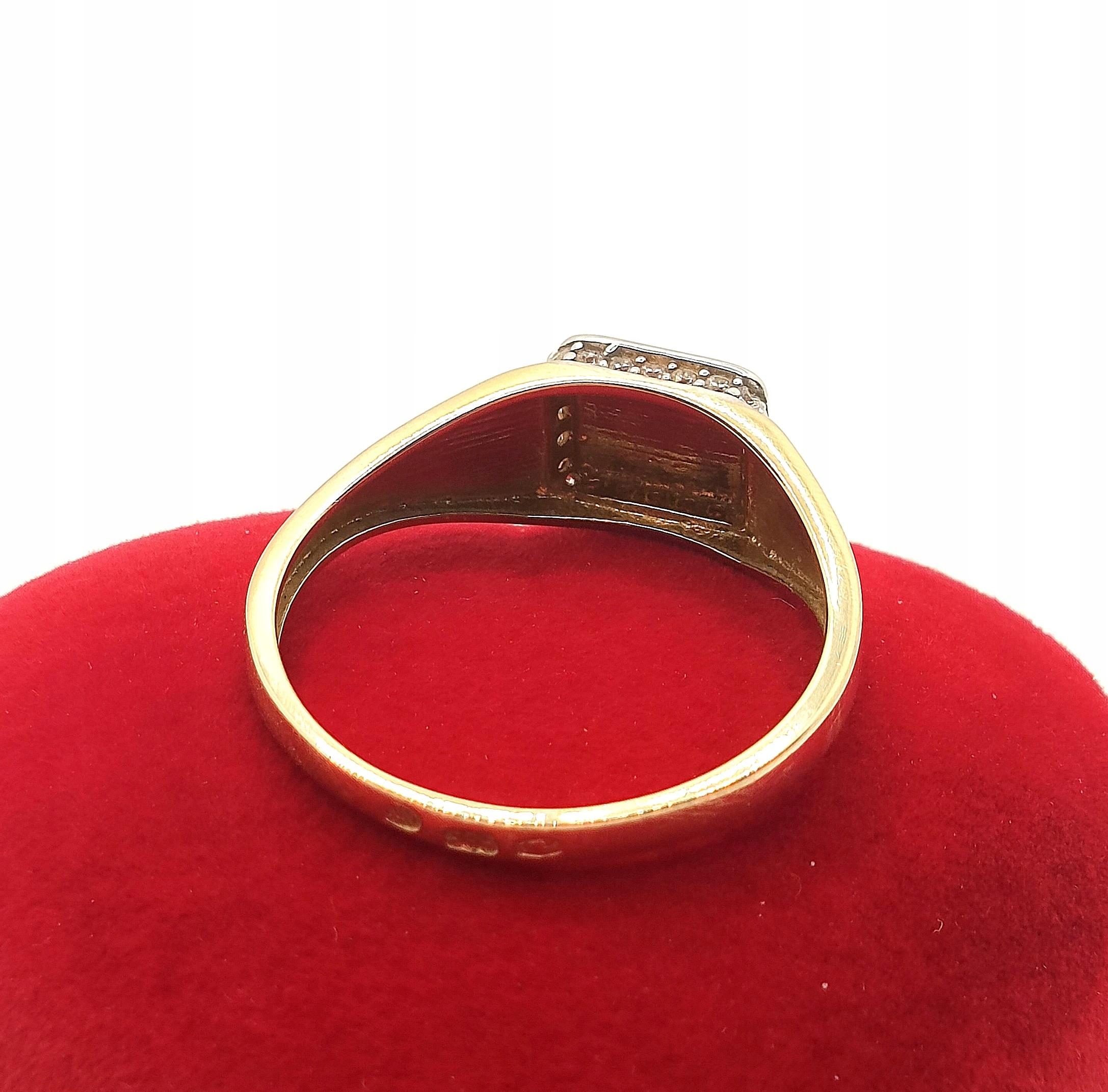 Oferujemy na sprzedaż złoty sygnet zdobiony cyrkoniami po bokach.
