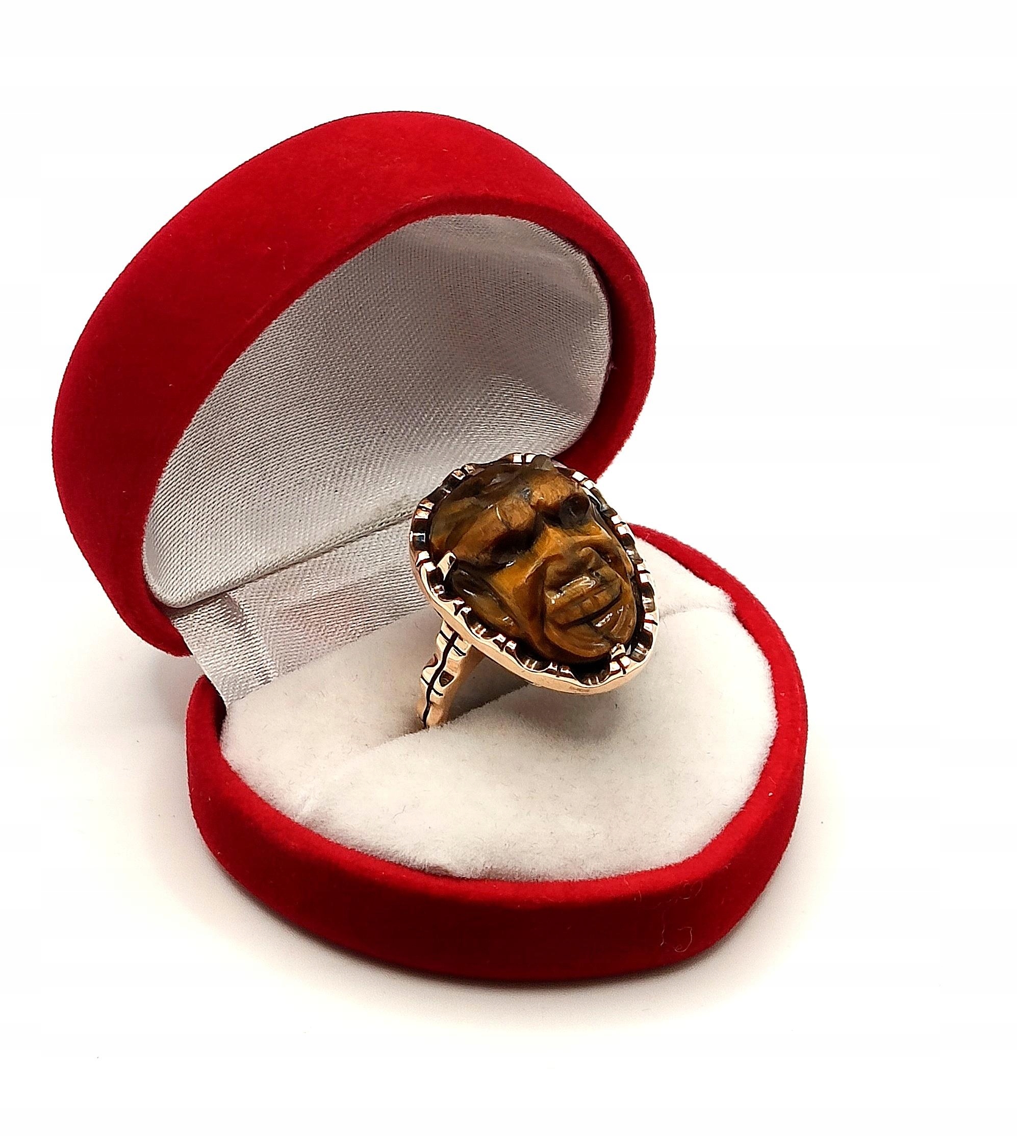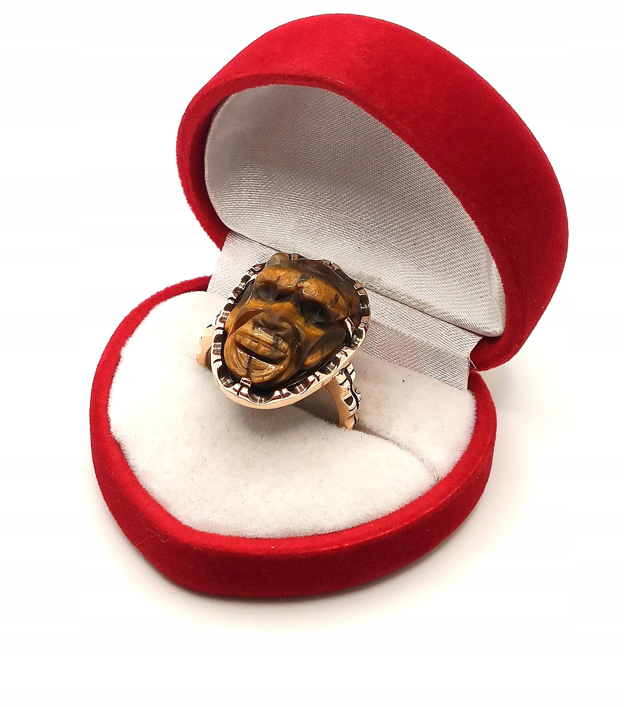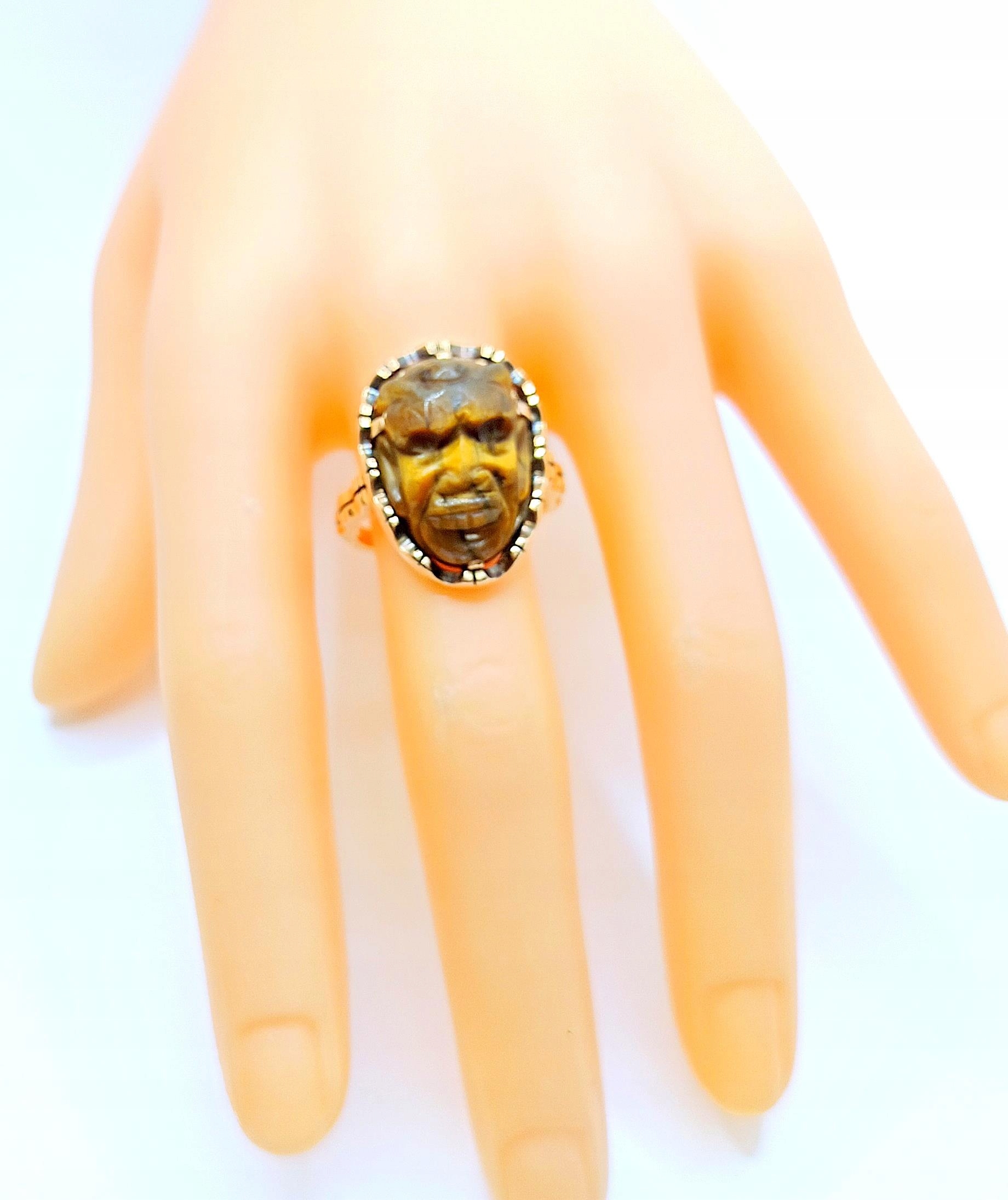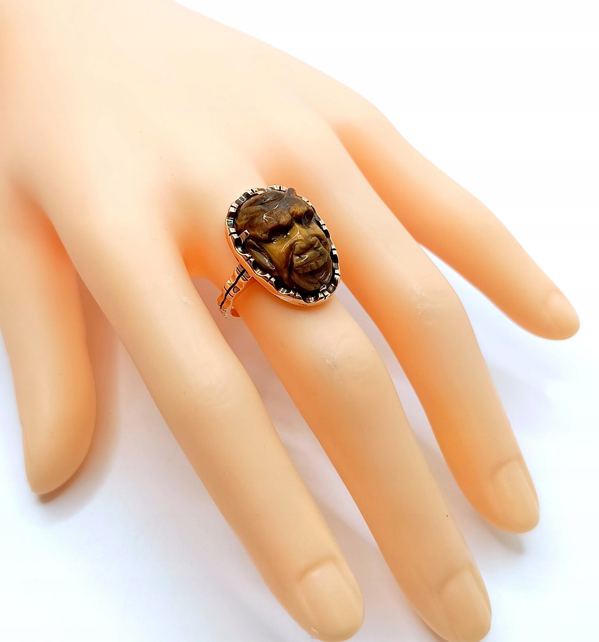 W ofercie na sprzedaż mamy dla Państwa unikatowy pierścień z motywem afrykańskim w formie rzeźby stylem Kamea w kamieniu Tygrysie Oko.