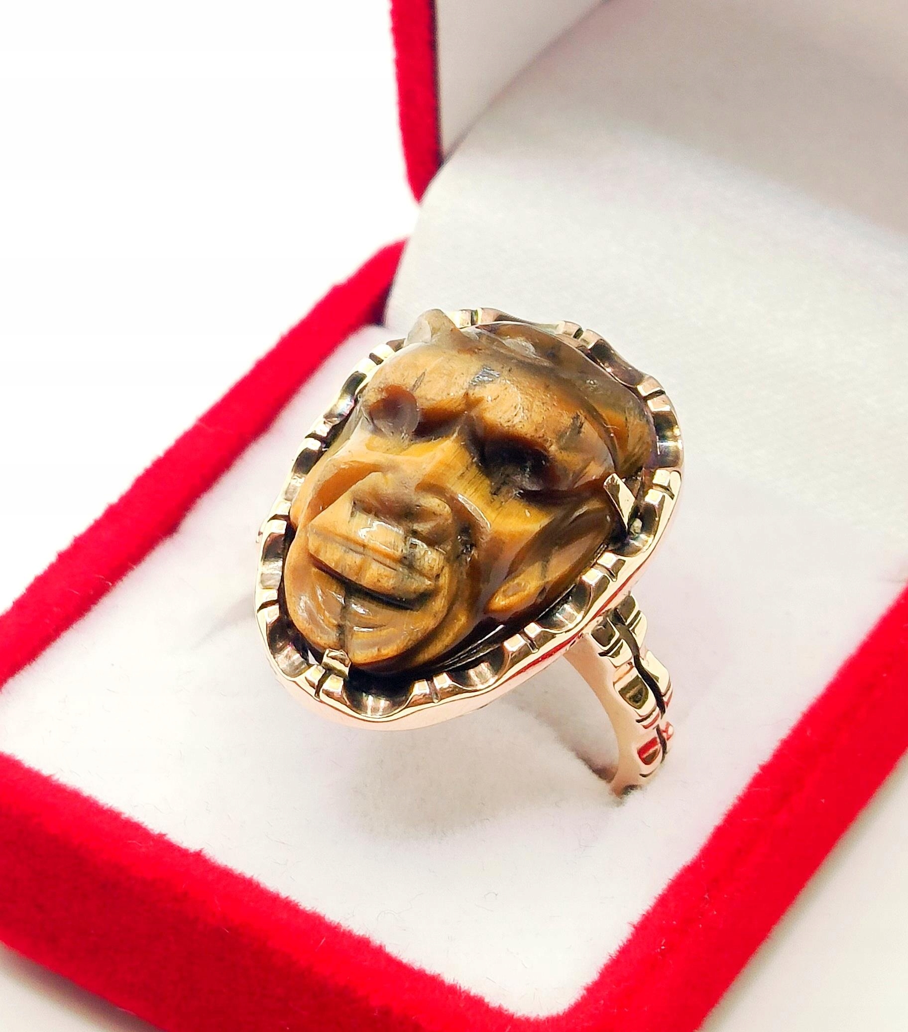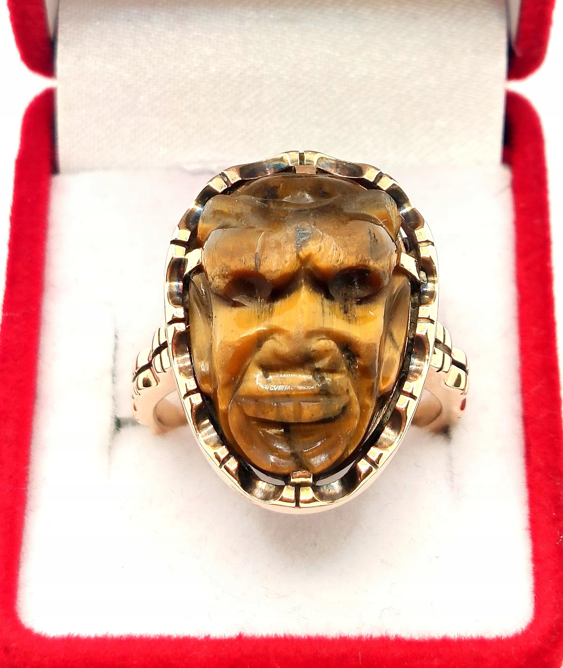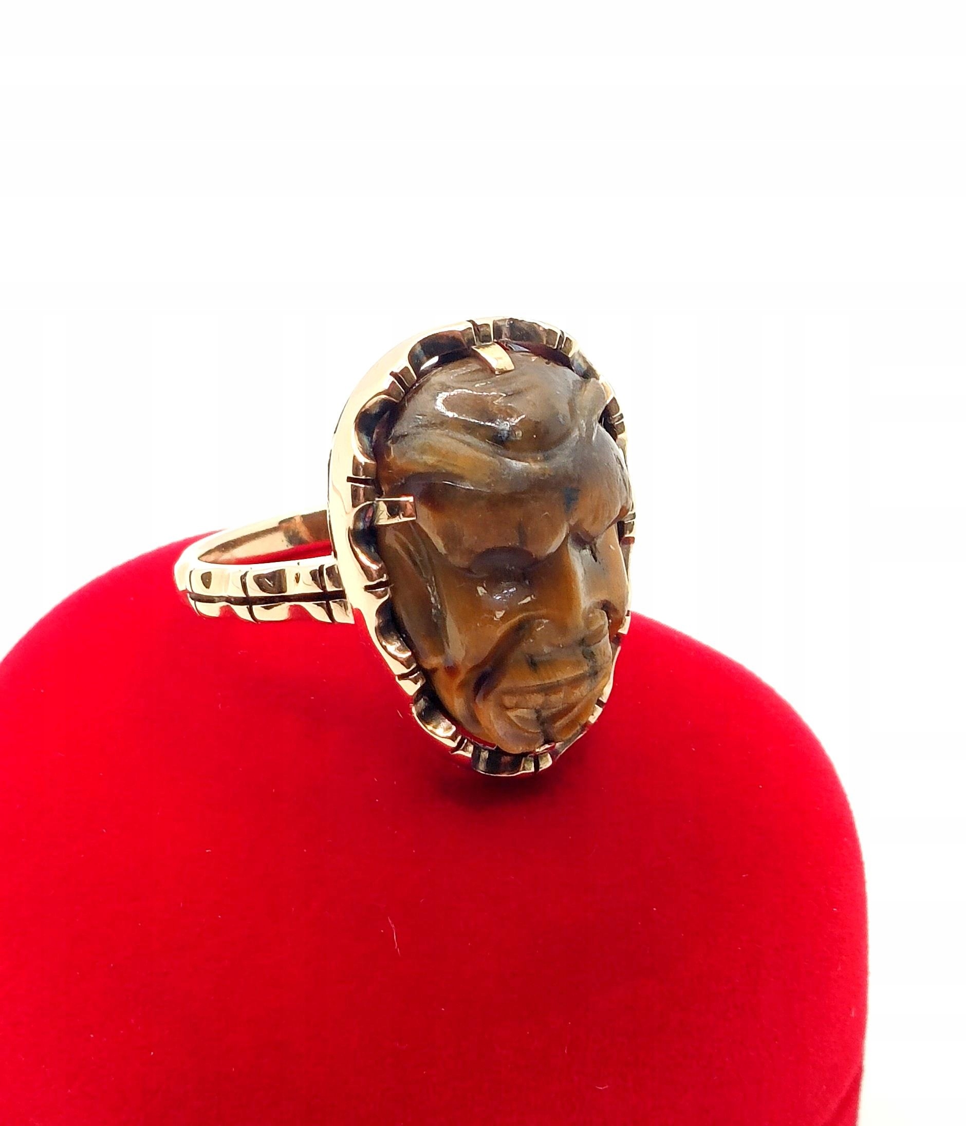 W ofercie na sprzedaż mamy dla Państwa unikatowy pierścień z motywem afrykańskim w formie rzeźby stylem Kamea w kamieniu Tygrysie Oko.
