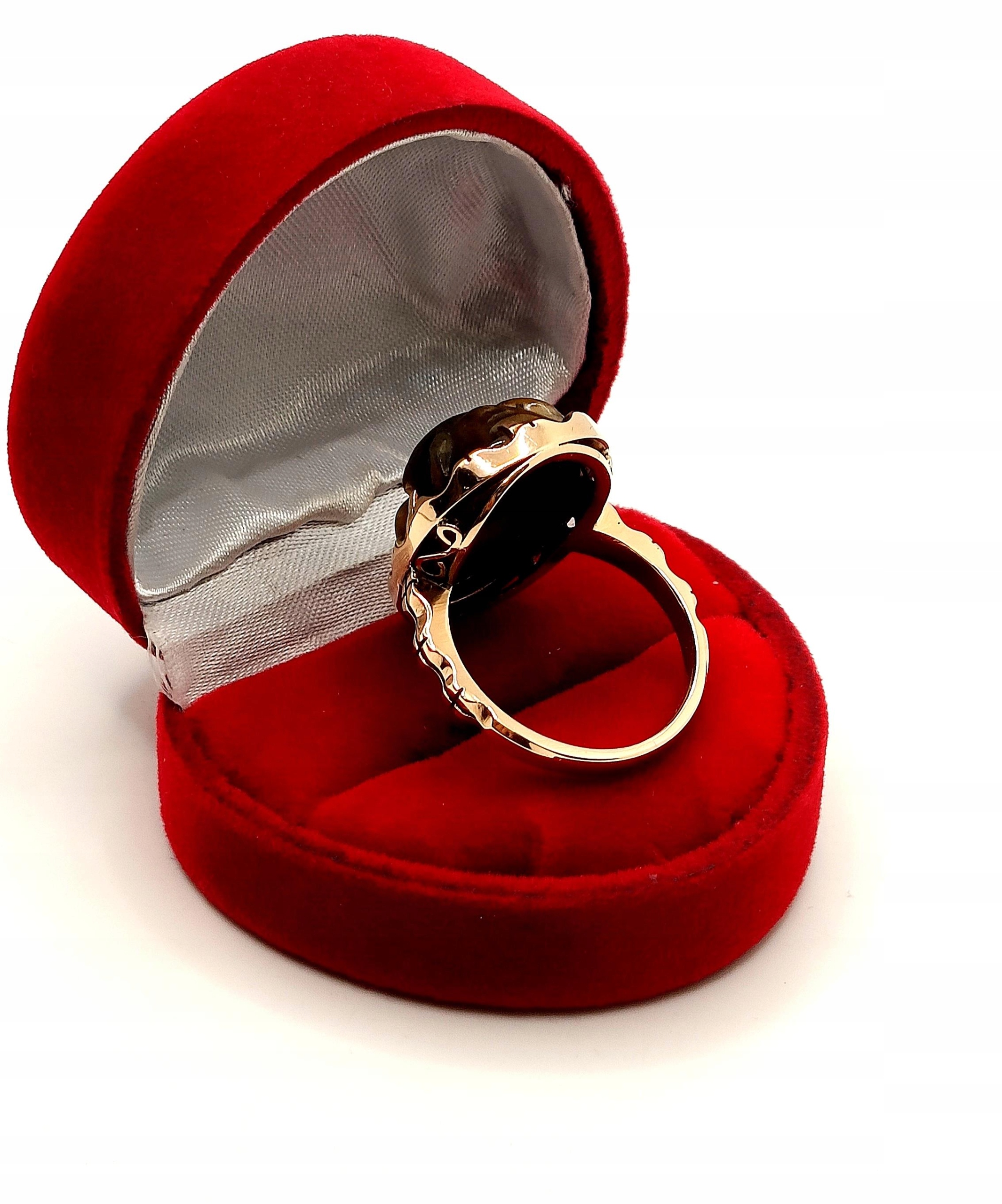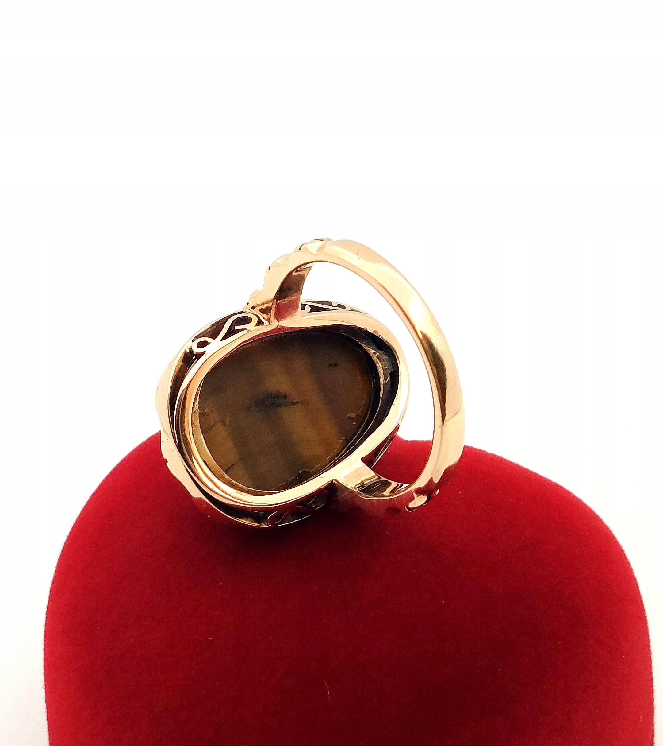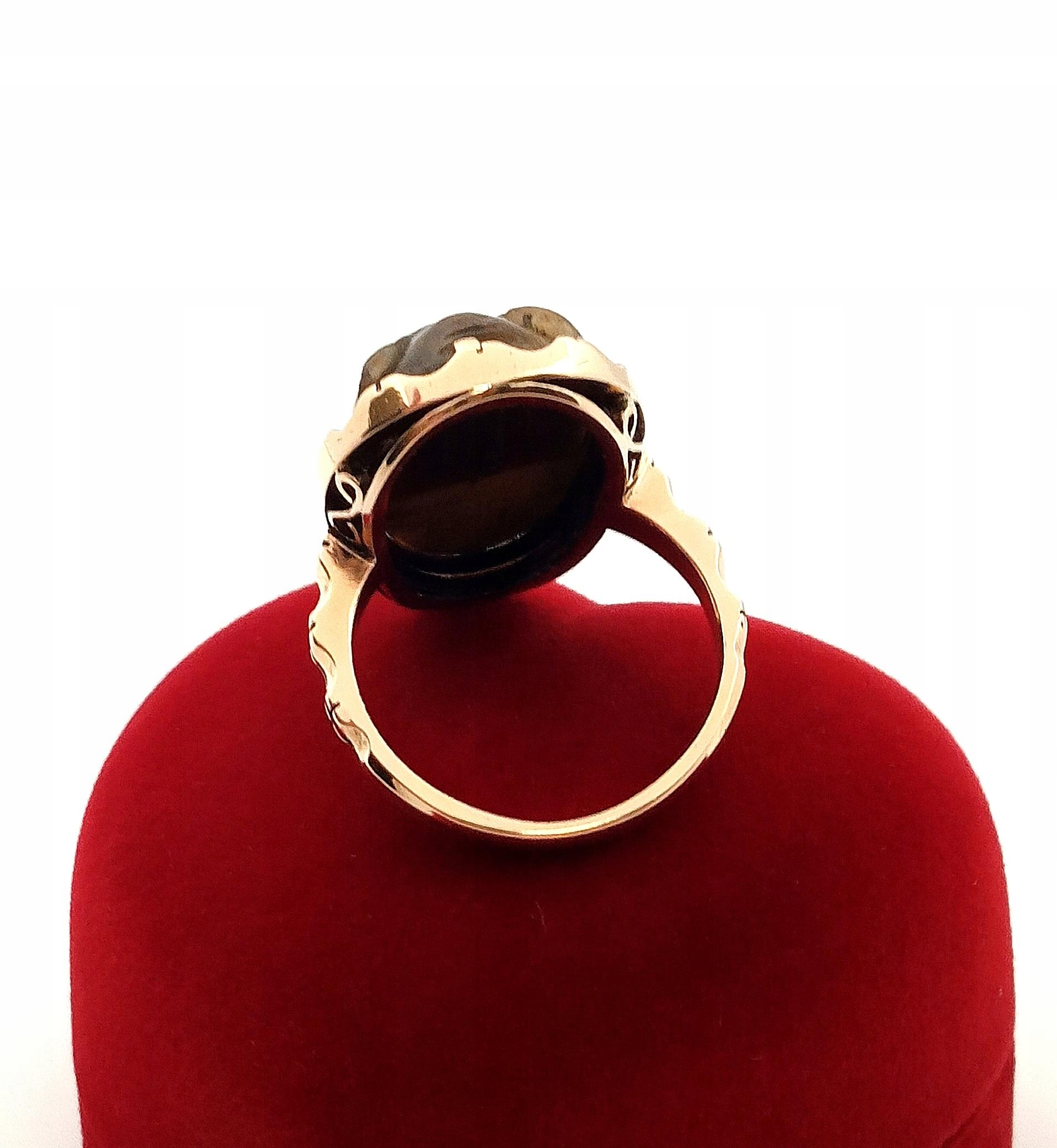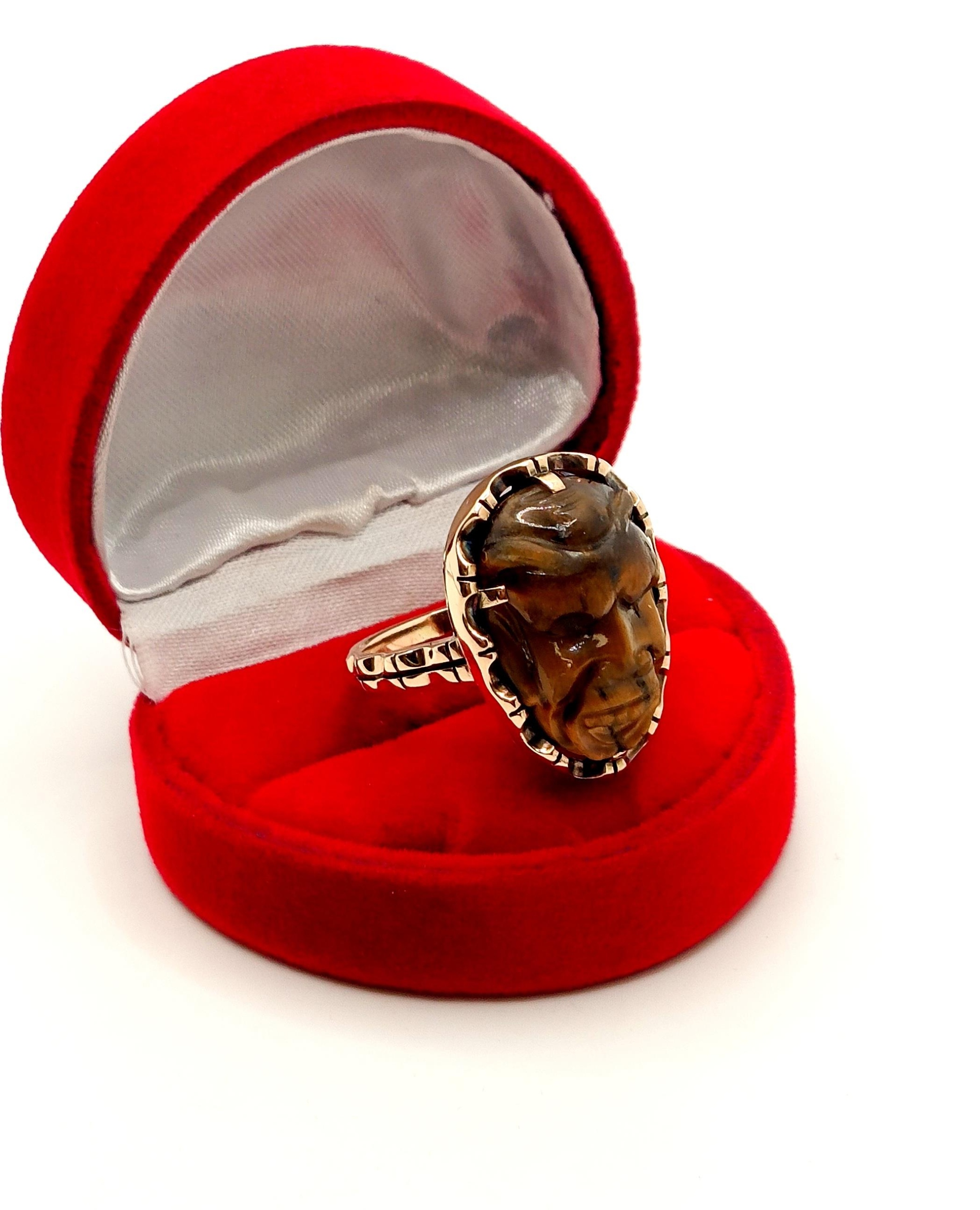 W ofercie na sprzedaż mamy dla Państwa unikatowy pierścień z motywem afrykańskim w formie rzeźby stylem Kamea w kamieniu Tygrysie Oko.
