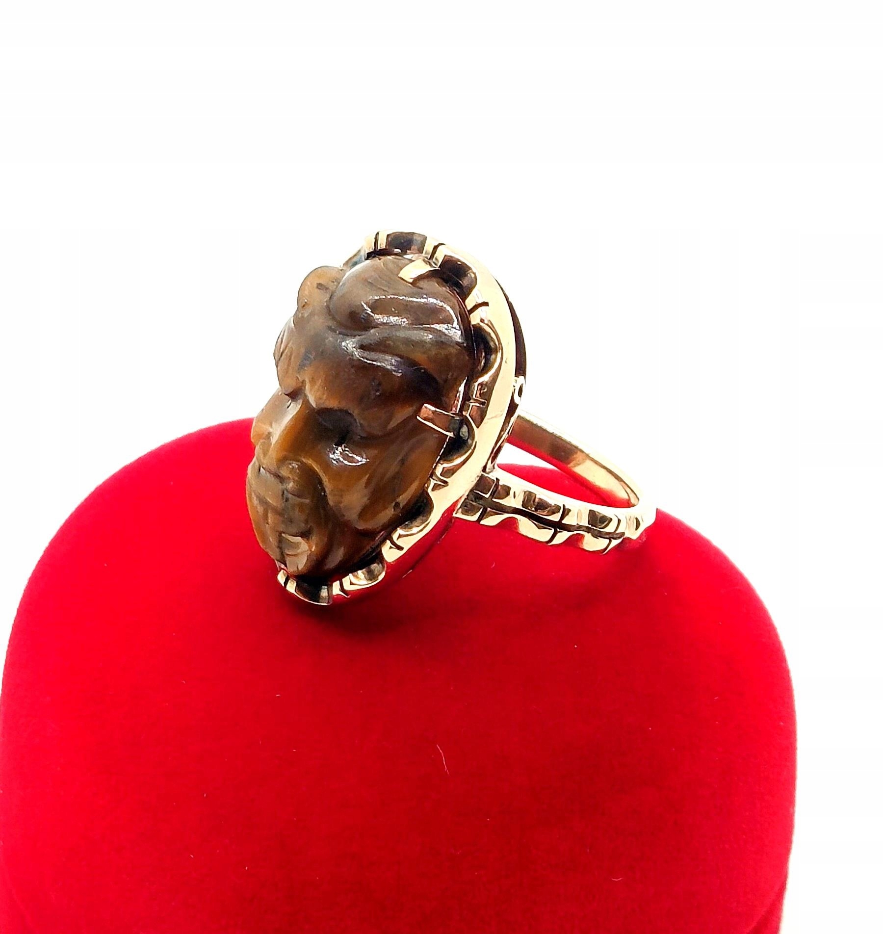 Złoty pierścionek sygnet z rzeźbą w Tygrysim Oku Pr.585 W:8,36gr Roz.17 Rękodzieło
