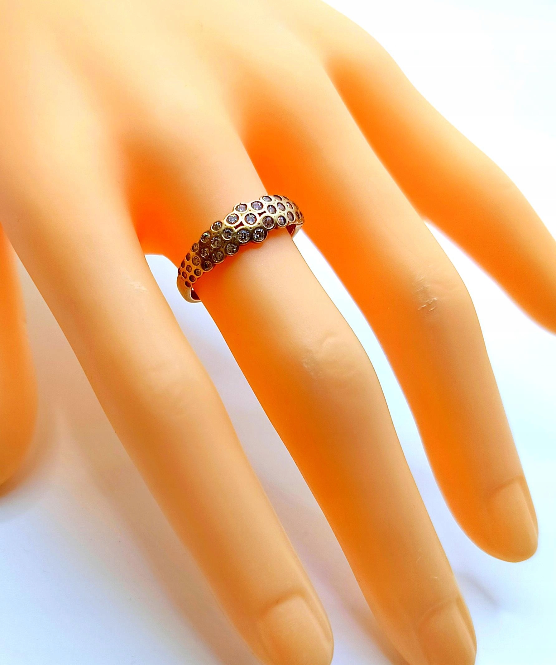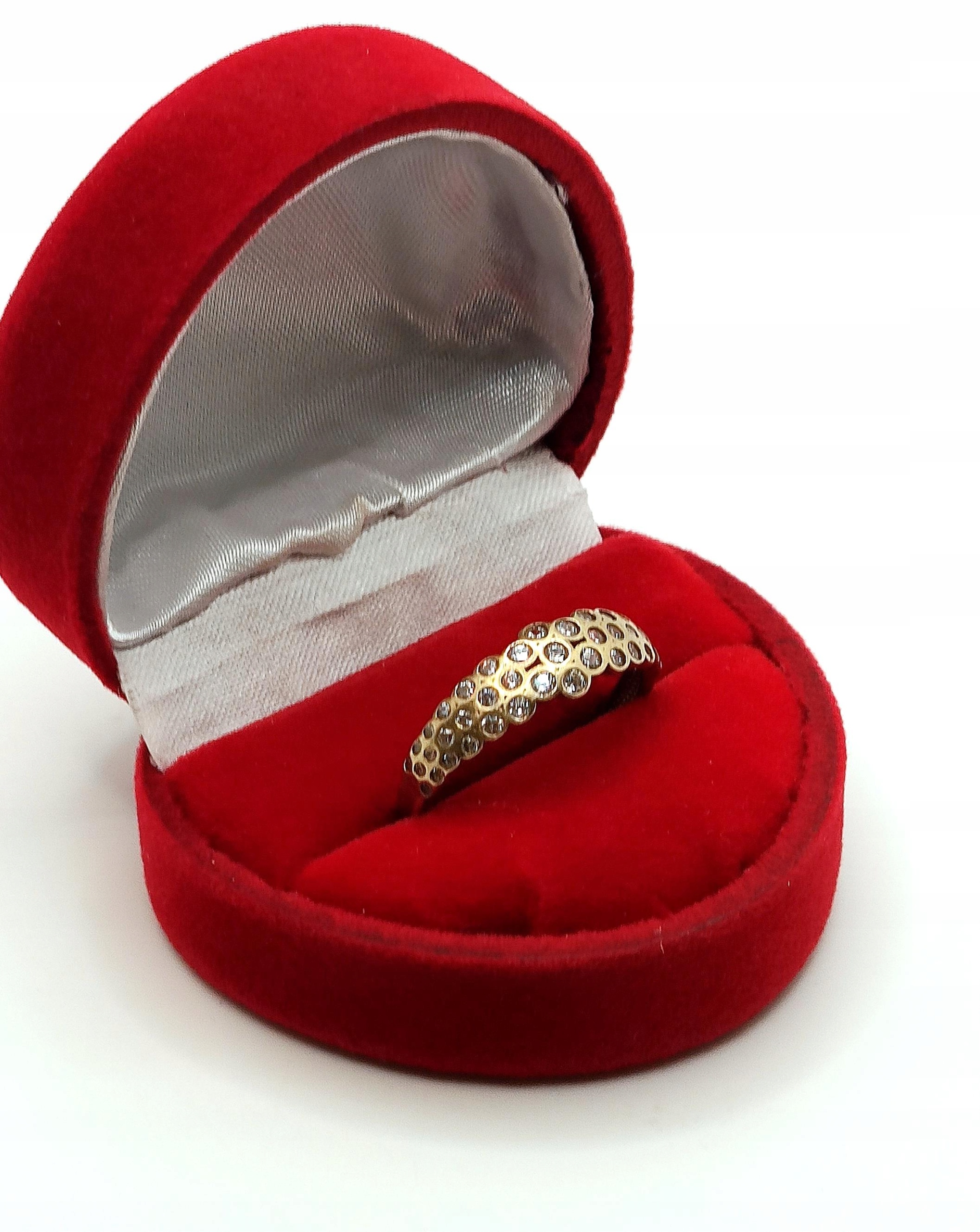 W ofercie na sprzedaż mamy dla państwa szeroki, złoty pierścionek zdobiony cyrkoniami.