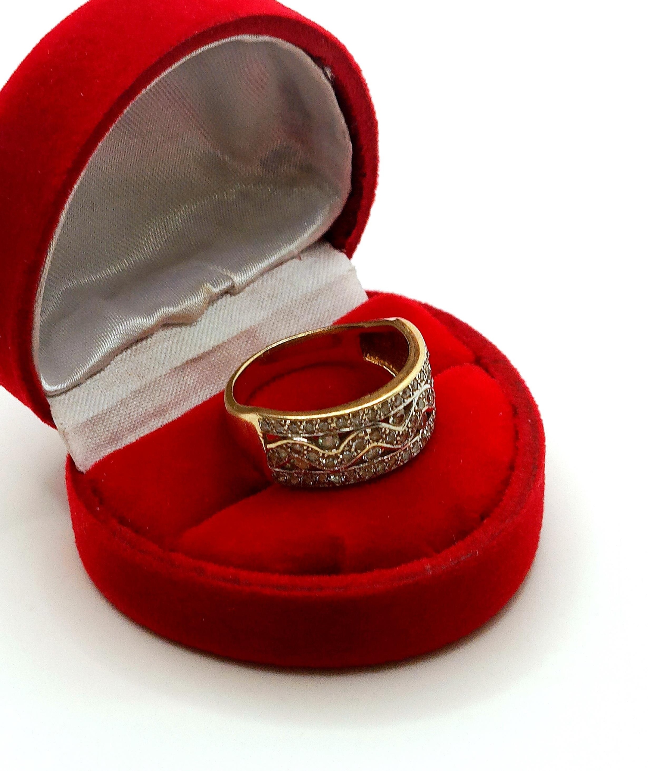 W ofercie na sprzedaż mamy dla państwa szeroki, złoty pierścionek zdobiony cyrkoniami.