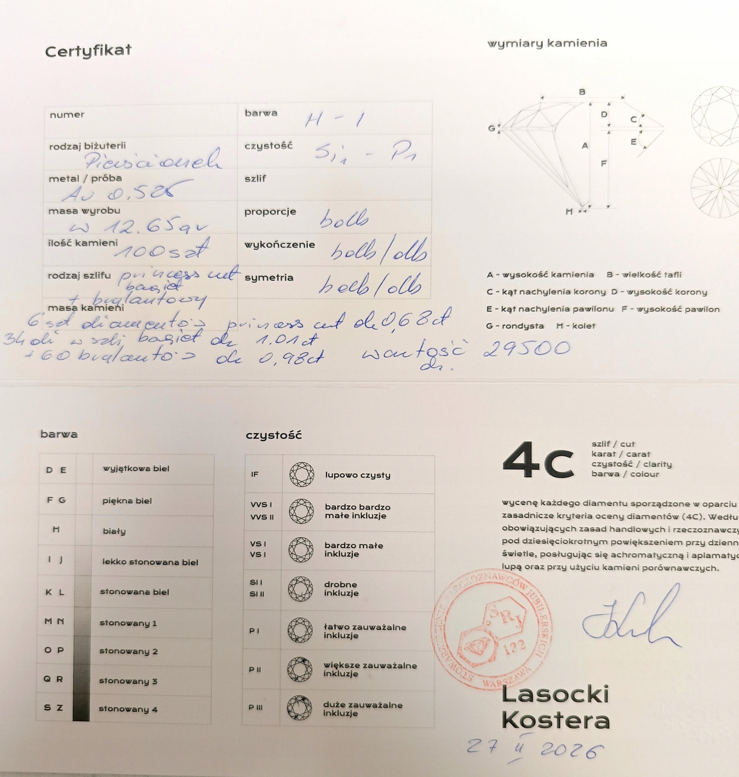 Do pierścionka dołączony jest certyfikat potwierdzający autentyczność z wyceną na około 30’000pln