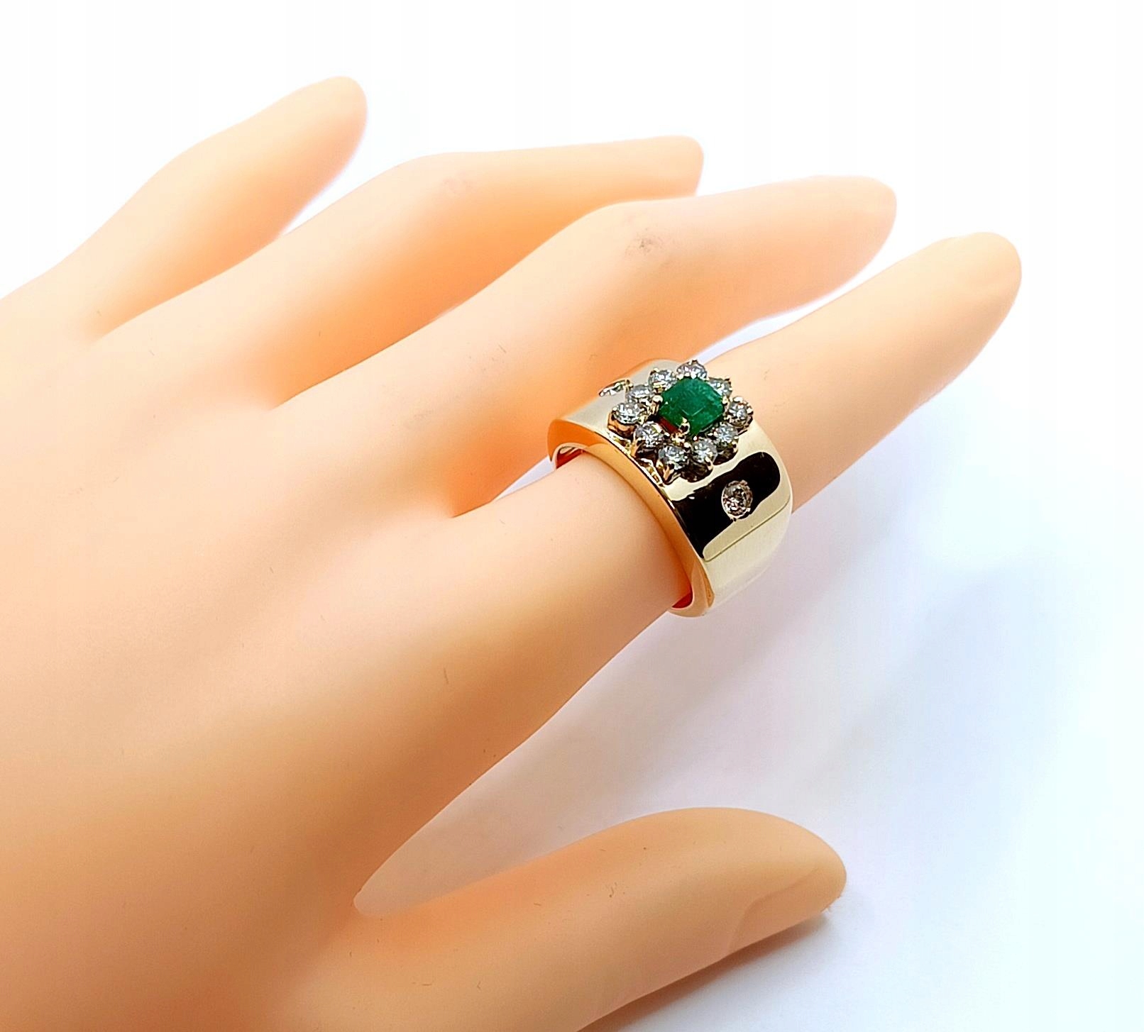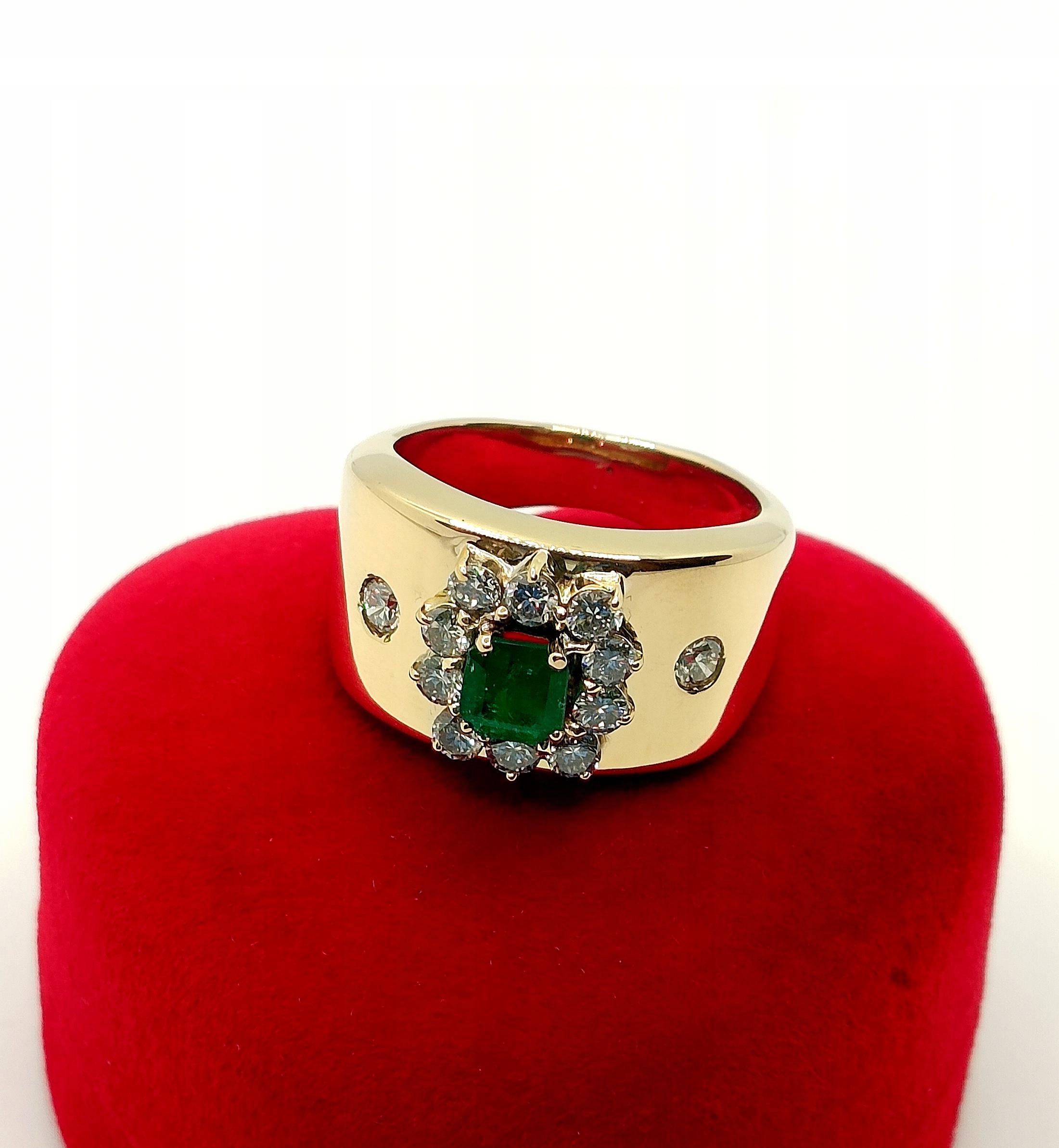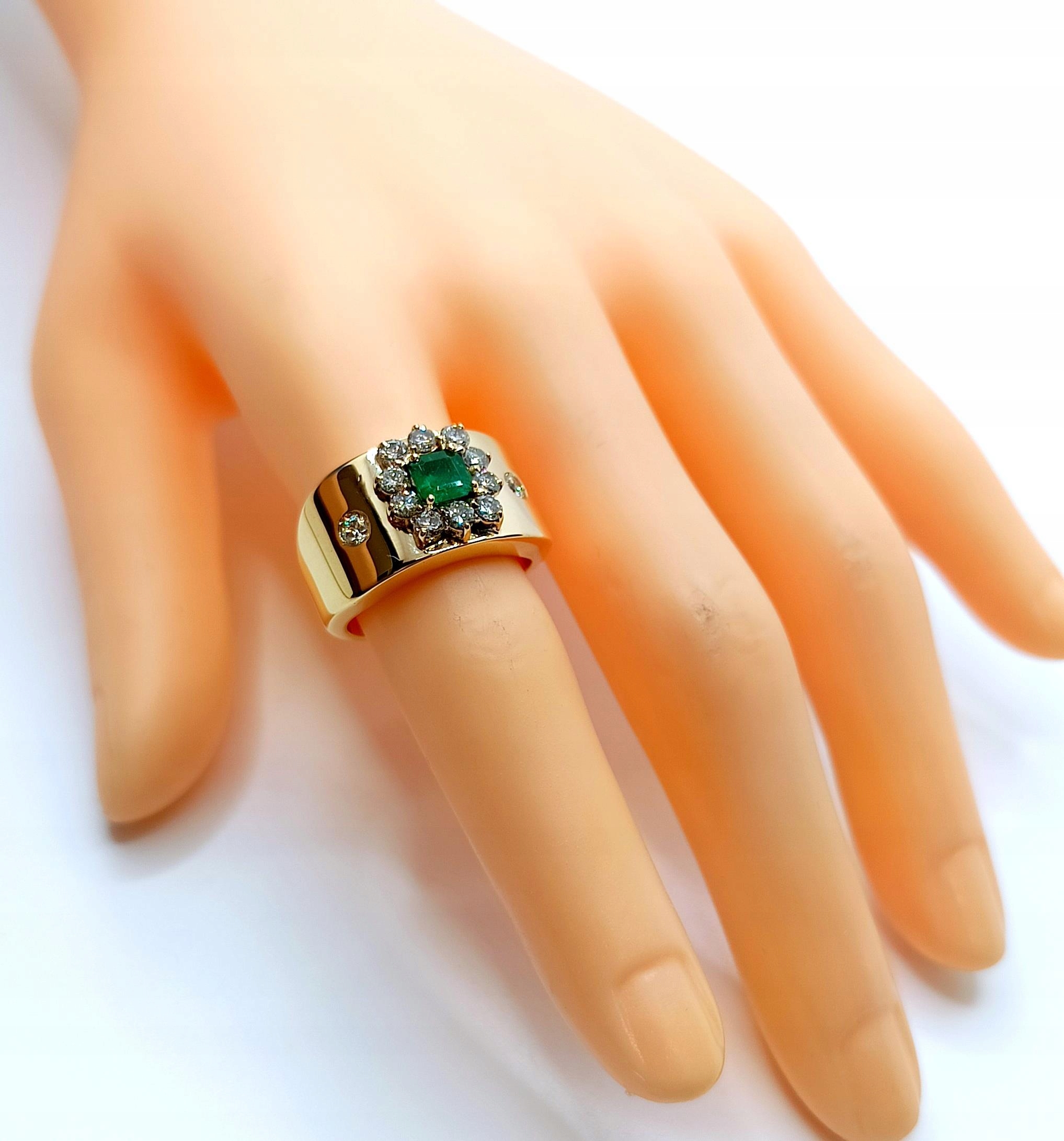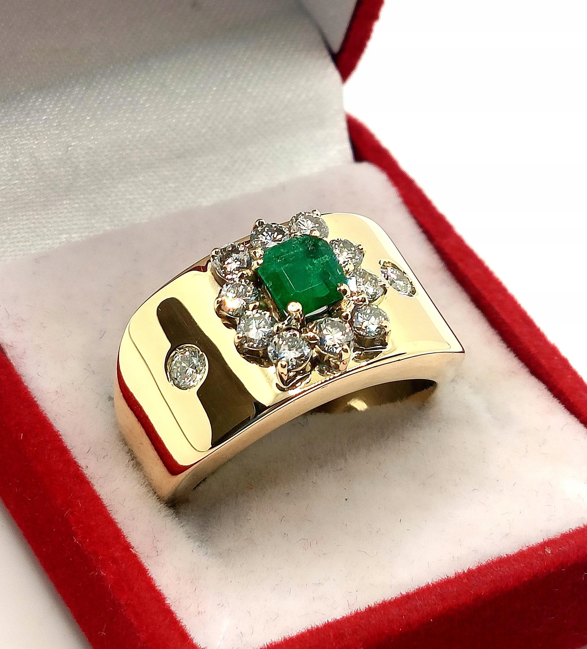 Oferujemy na sprzedaż szeroki złoty pierścionek zdobiony okazałym Szmaragdem kolumbijskim oraz Diamentami.