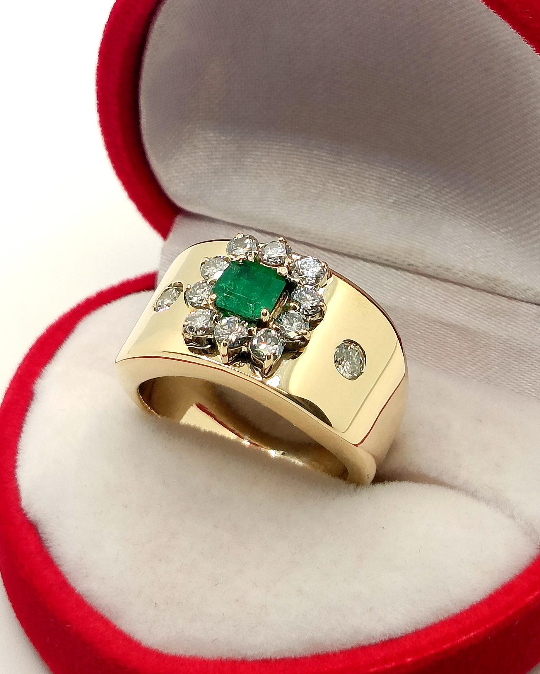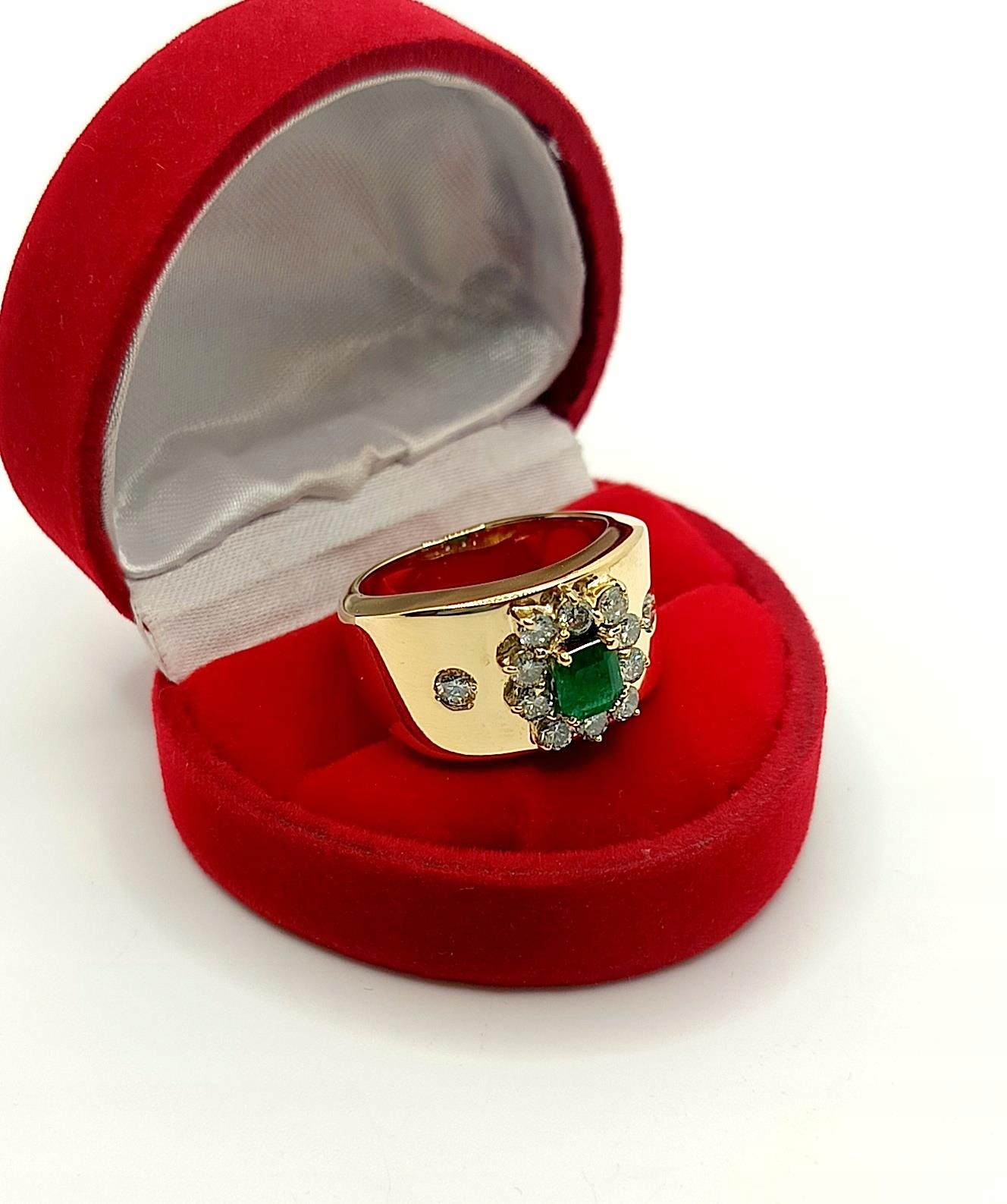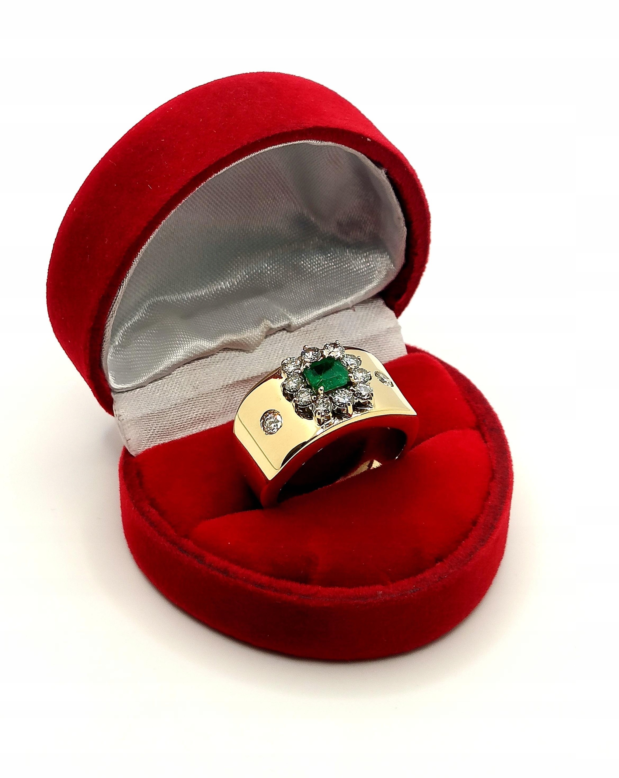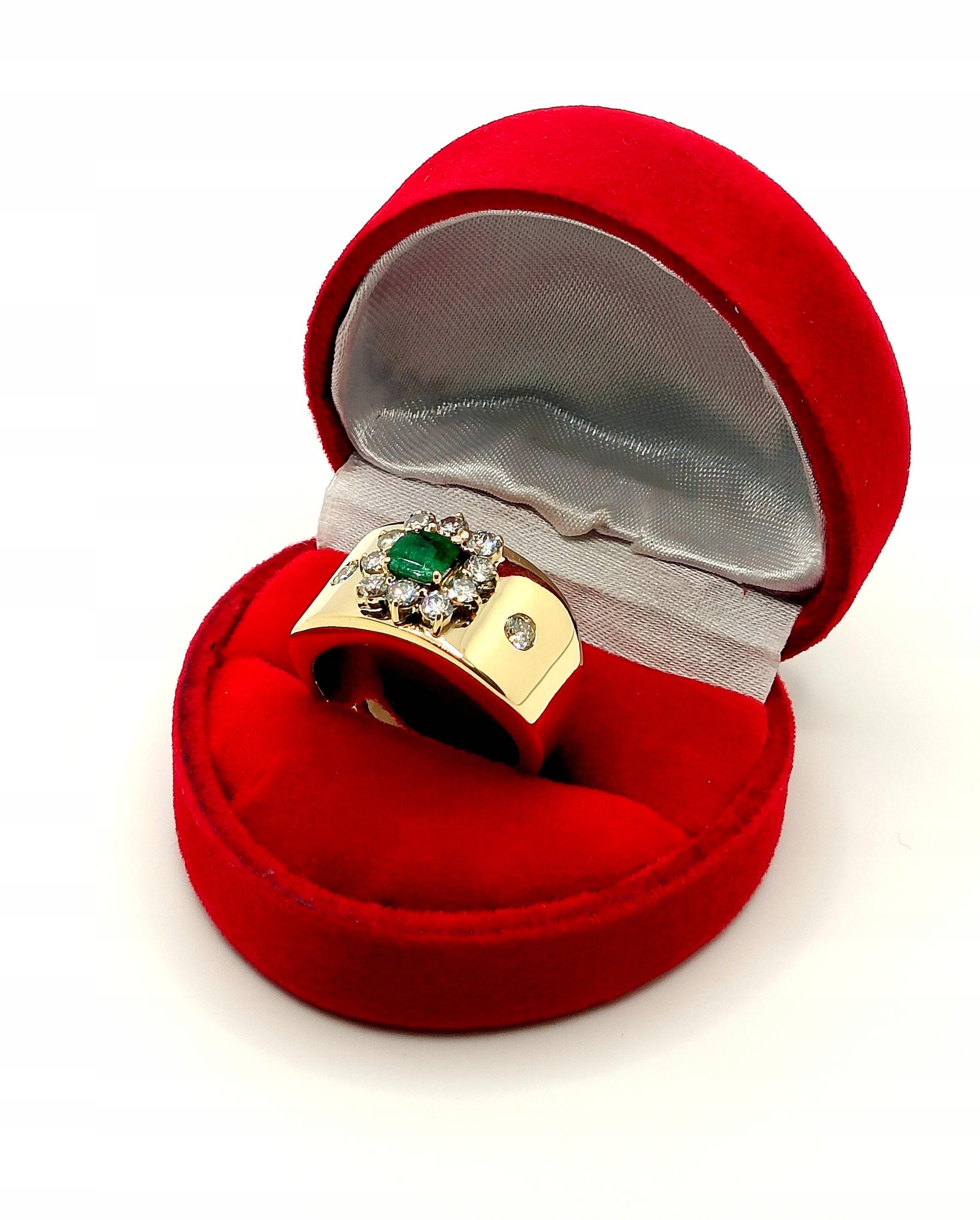 Oferujemy na sprzedaż szeroki złoty pierścionek zdobiony okazałym Szmaragdem kolumbijskim oraz Diamentami.