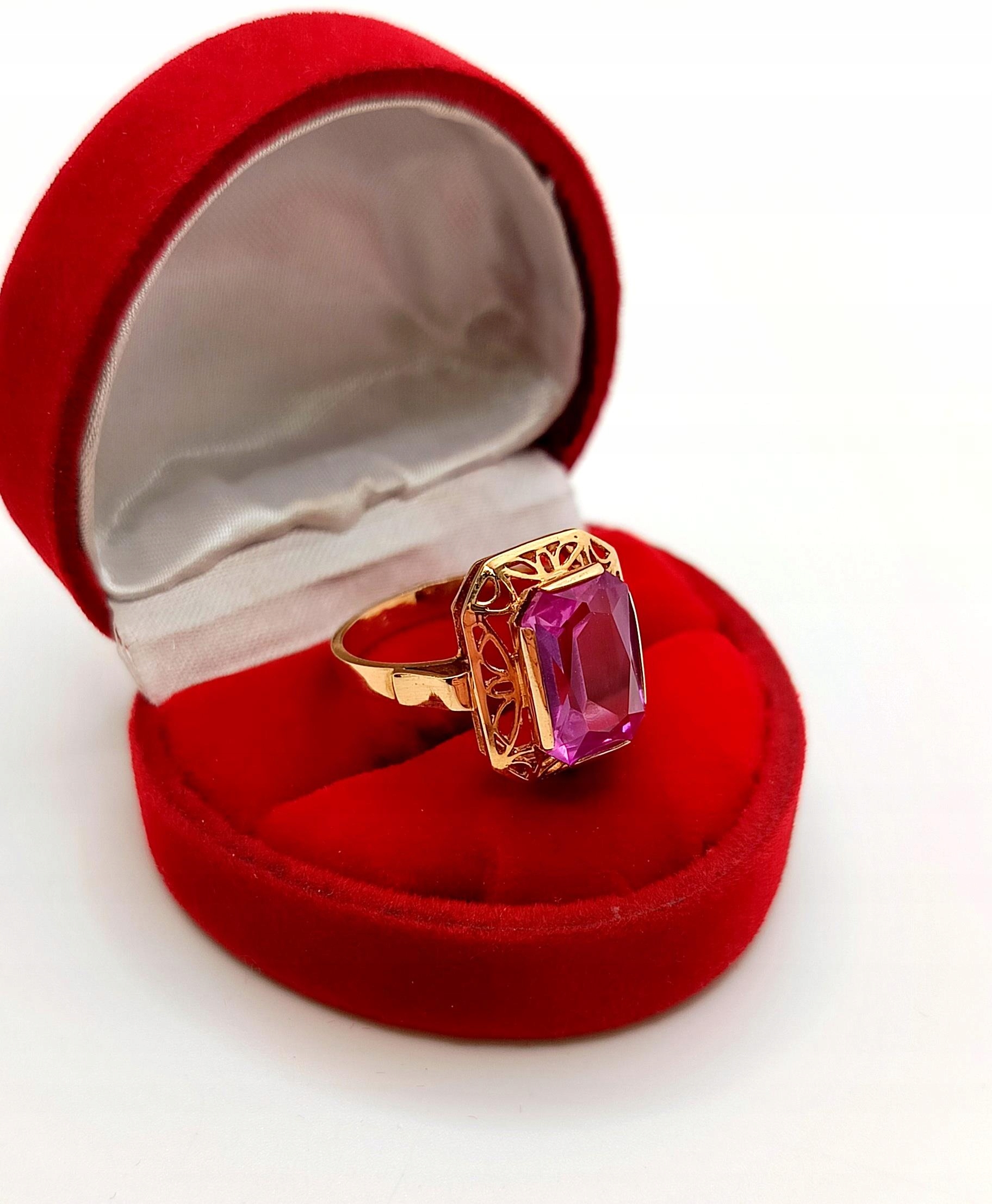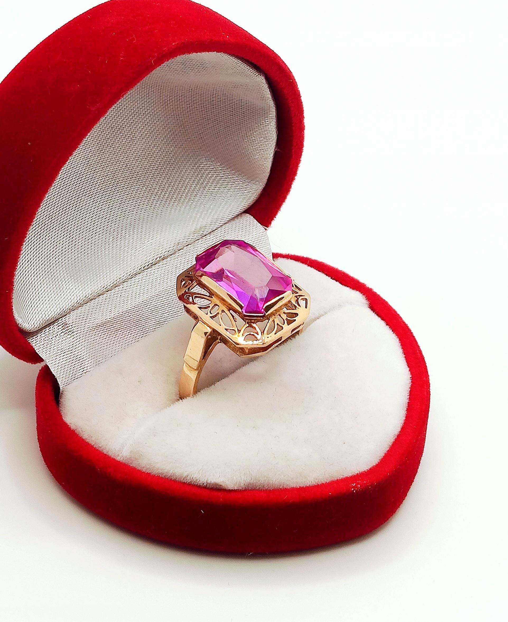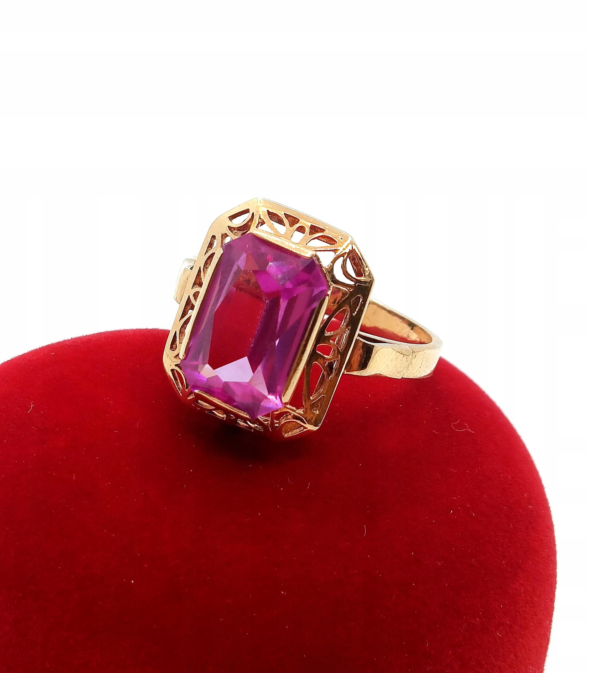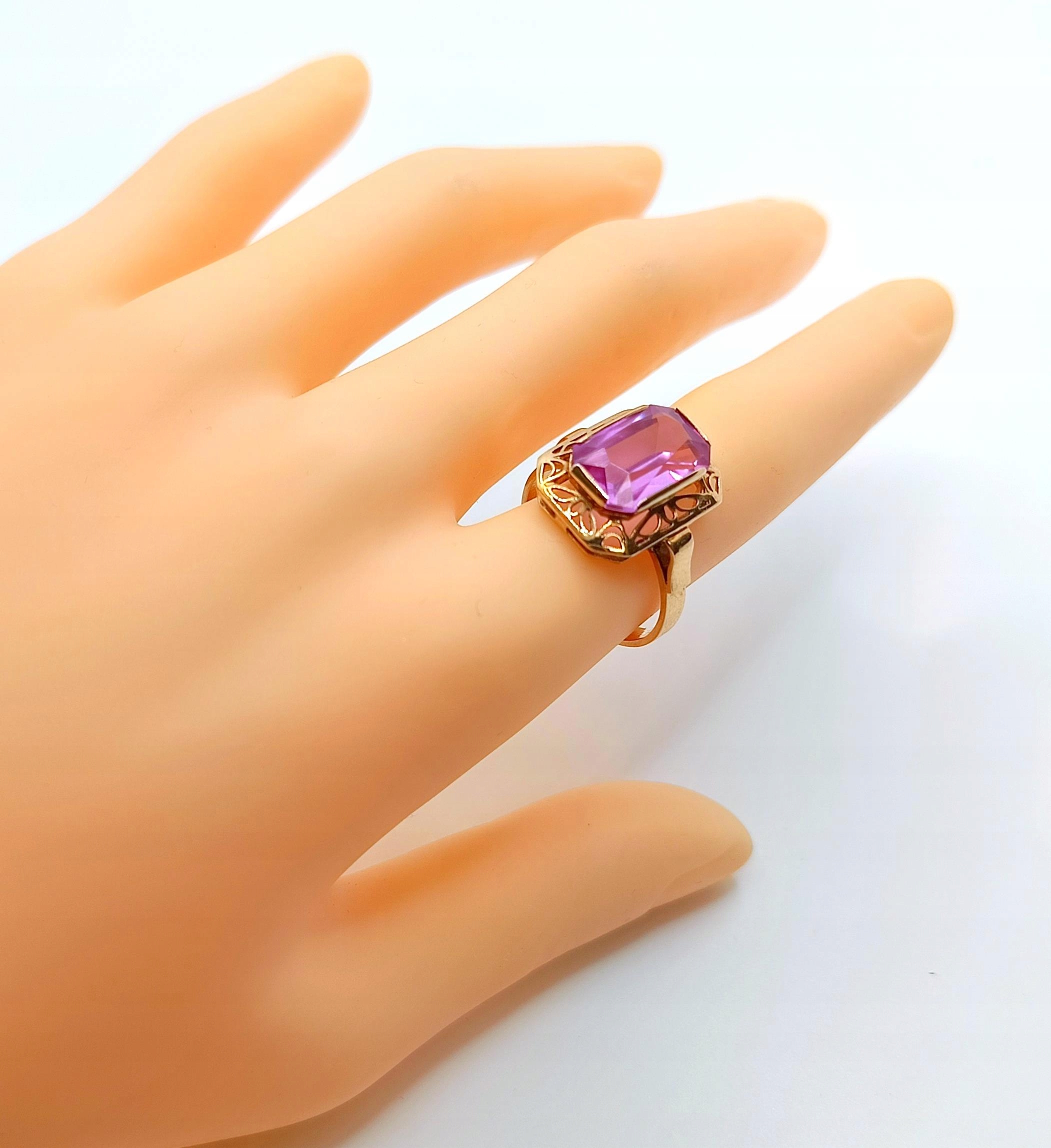 Oferujemy na sprzedaż piękny, złoty pierścionek , znanej warszawskiej manufaktury Warmet, ozdobiony syntetycznym barwionym Ametystem osadzonym w ażurowym koszyczku.
