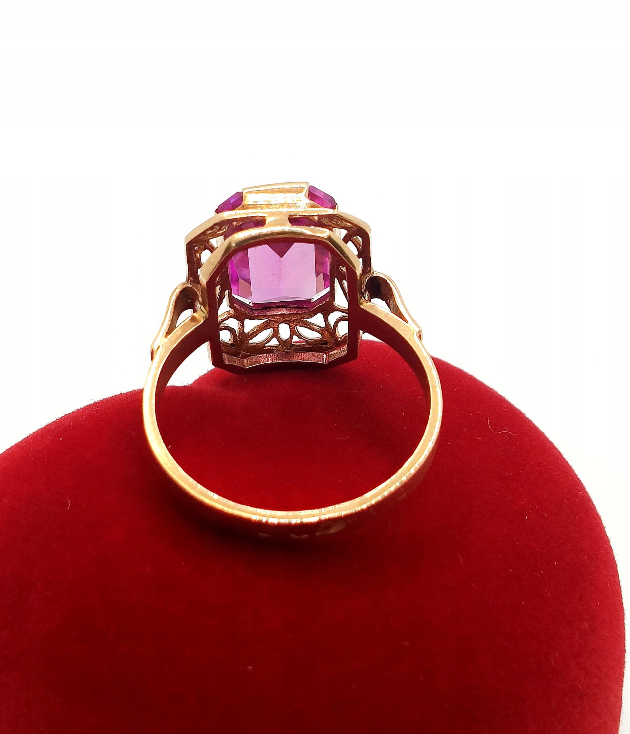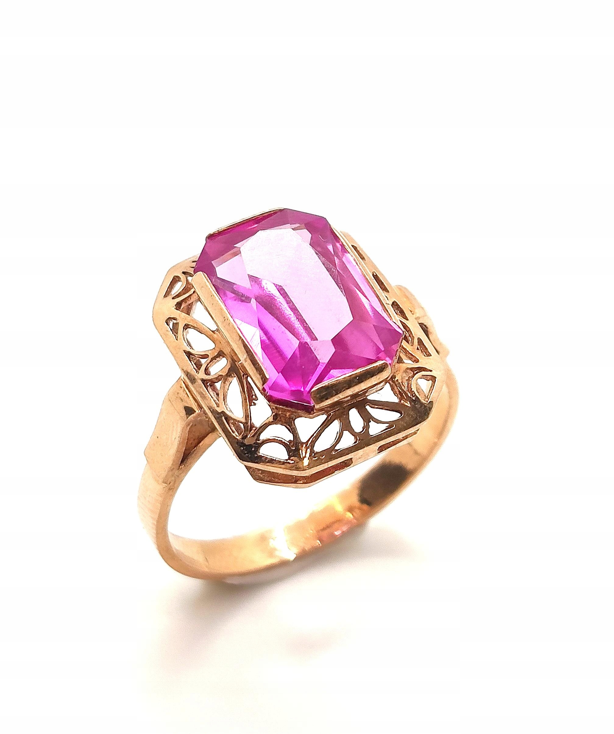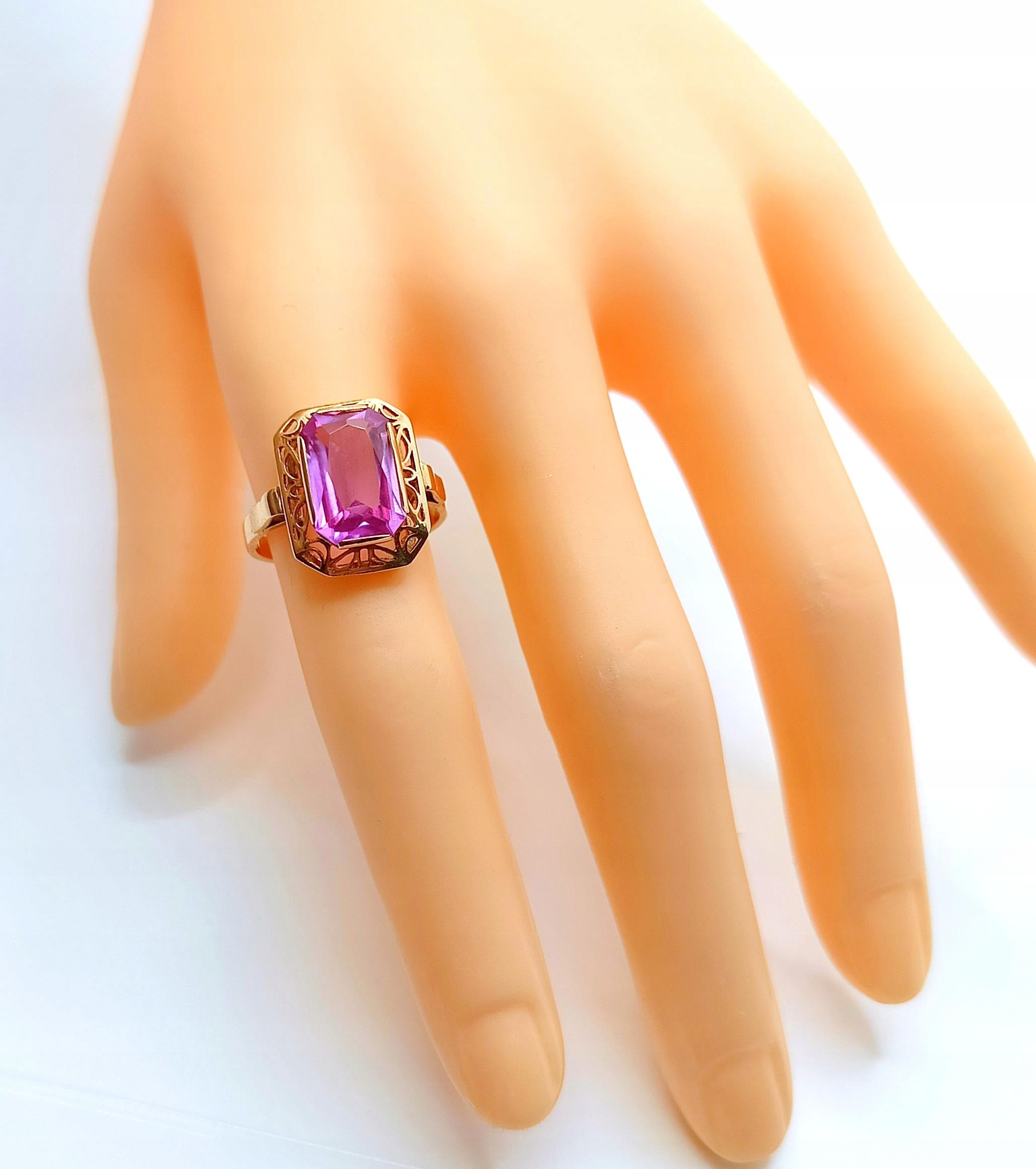 Oferujemy na sprzedaż piękny, złoty pierścionek , znanej warszawskiej manufaktury Warmet, ozdobiony syntetycznym barwionym Ametystem osadzonym w ażurowym koszyczku.