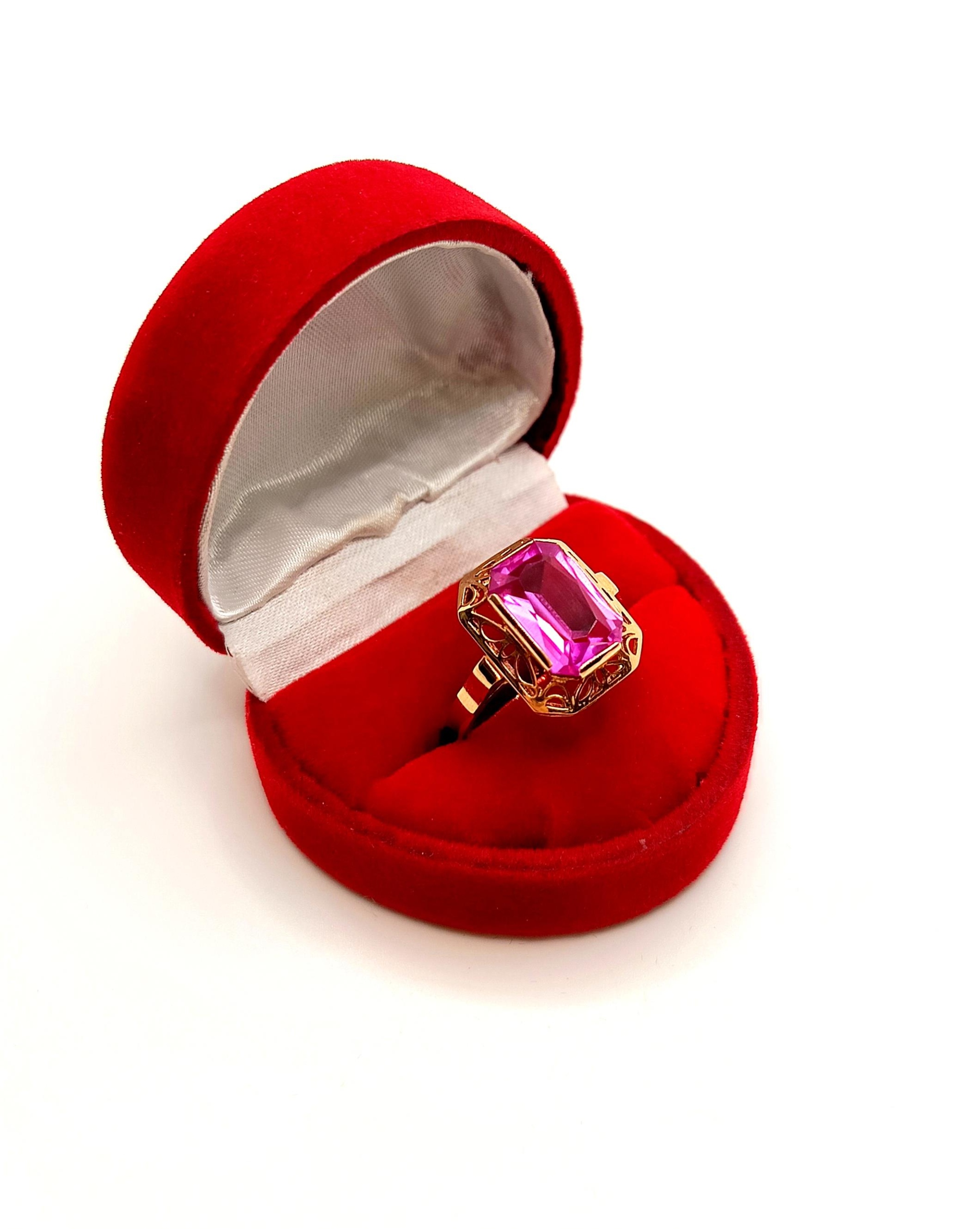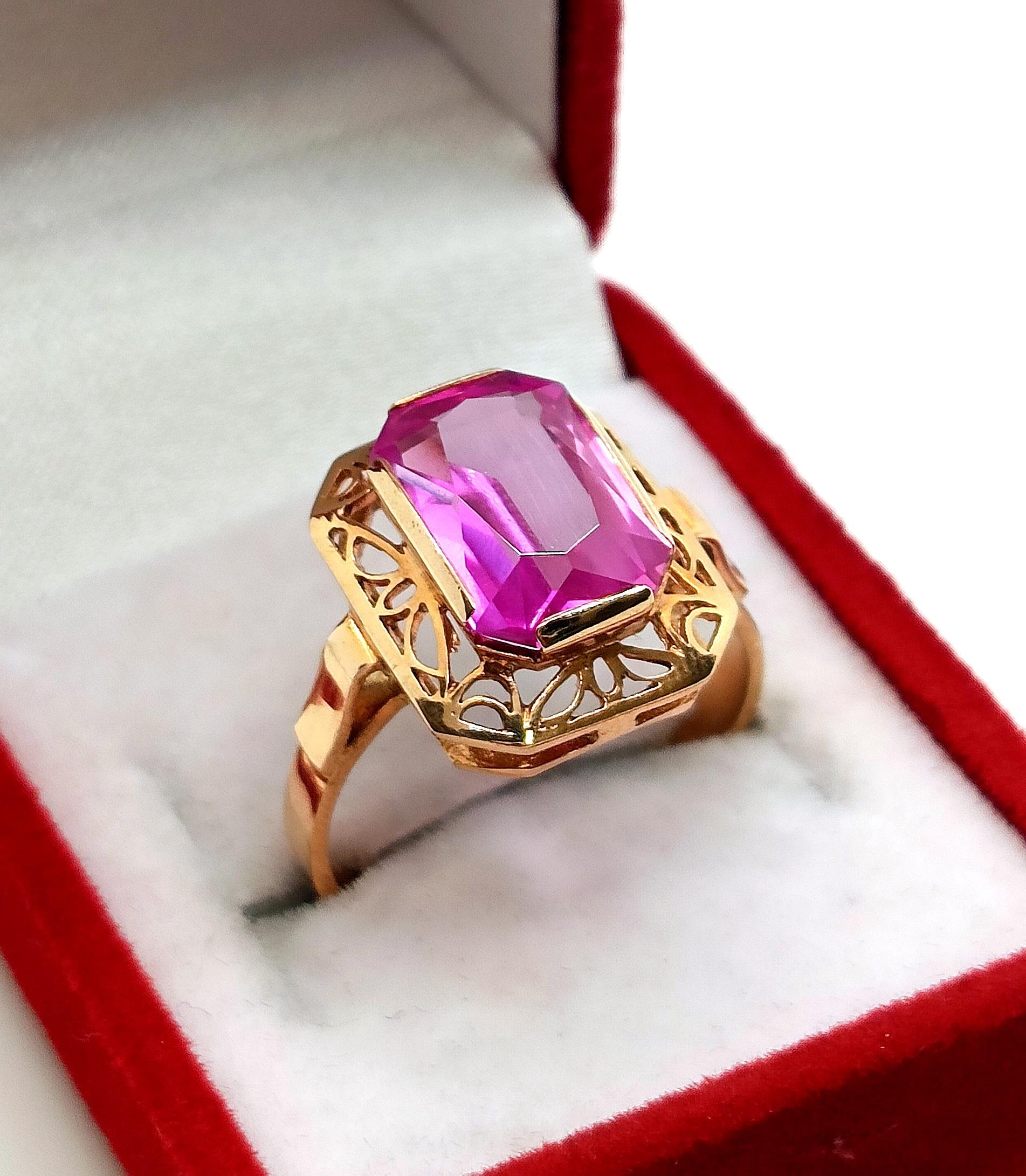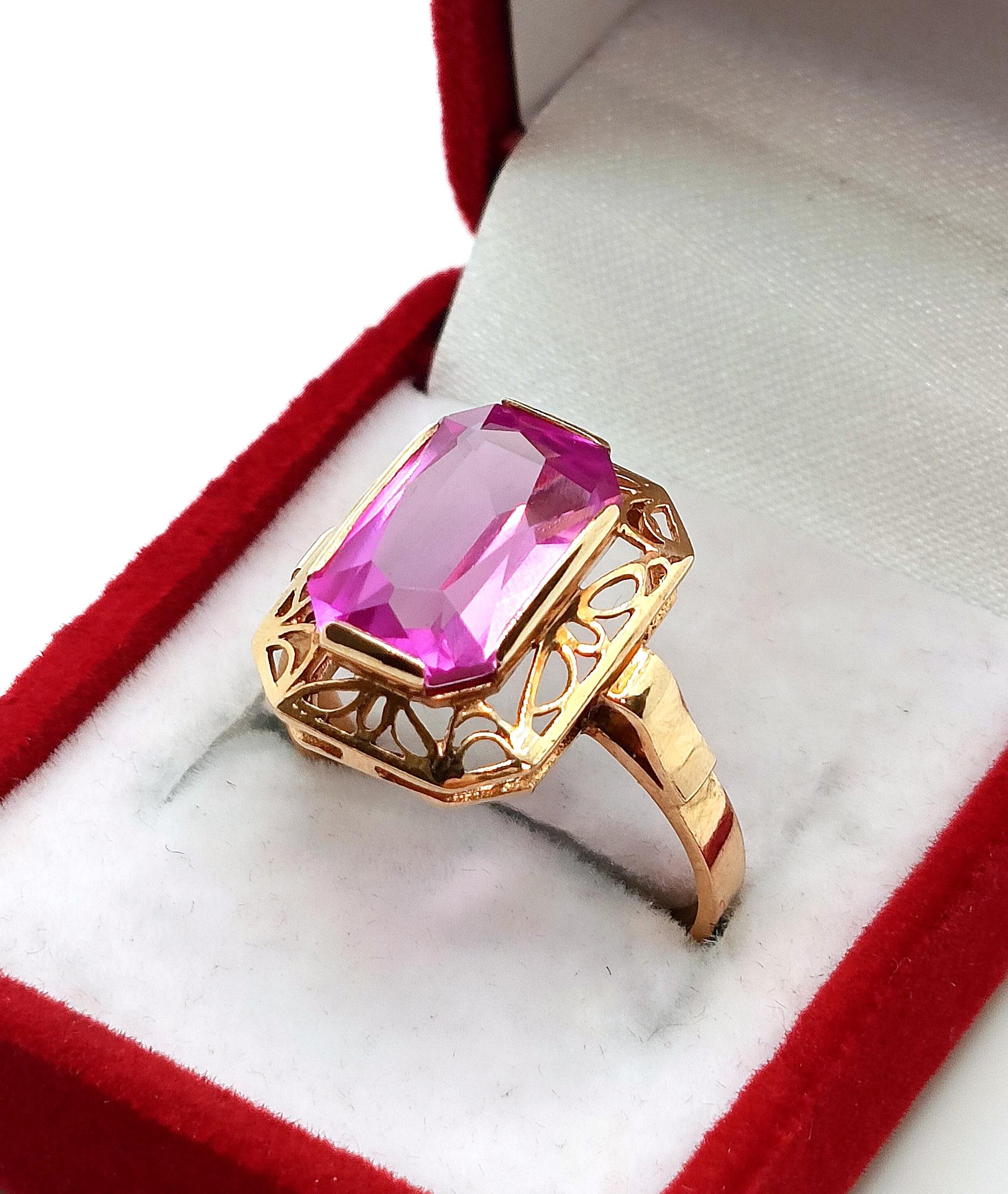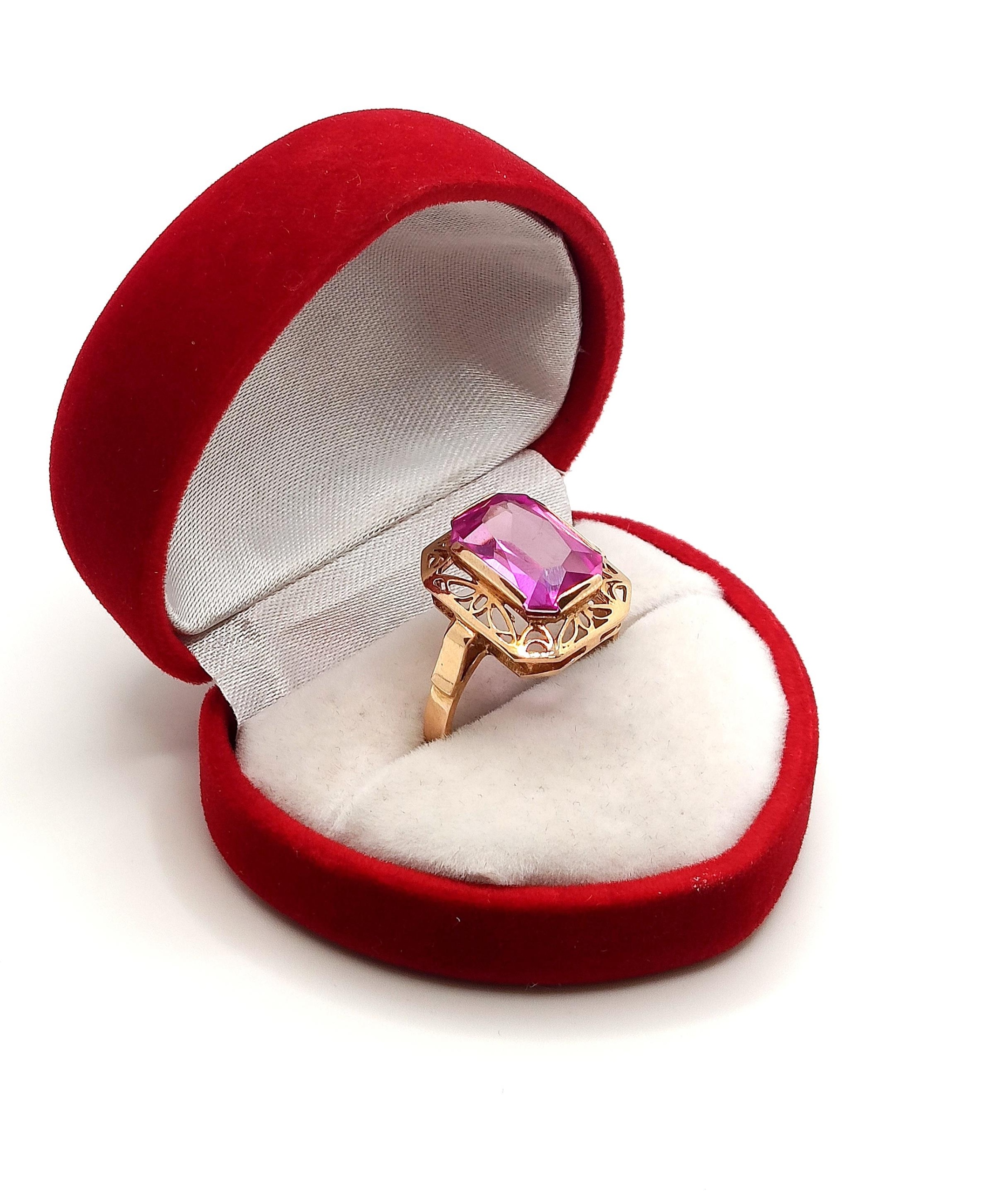 Oferujemy na sprzedaż piękny, złoty pierścionek , znanej warszawskiej manufaktury Warmet, ozdobiony syntetycznym barwionym Ametystem osadzonym w ażurowym koszyczku.