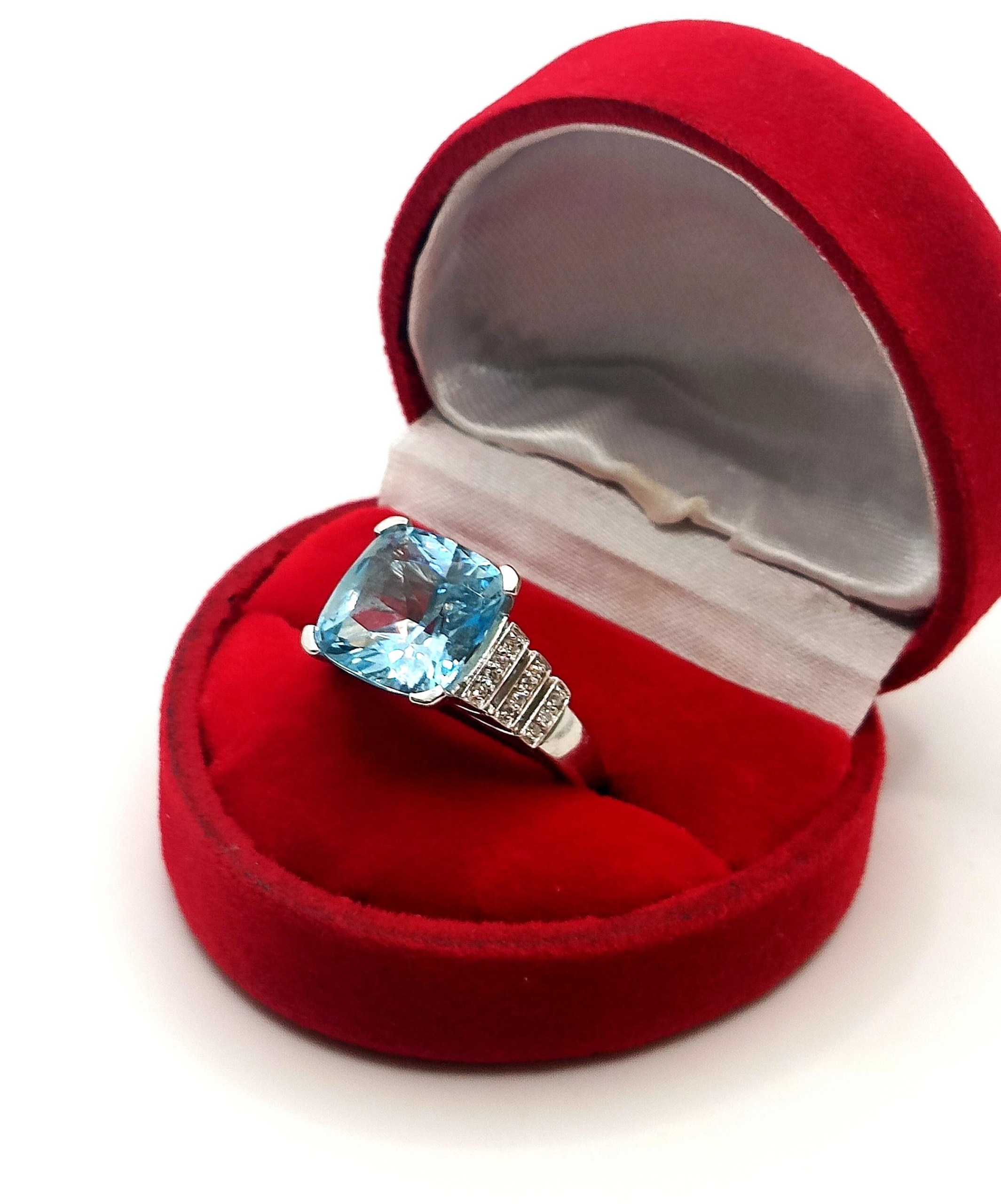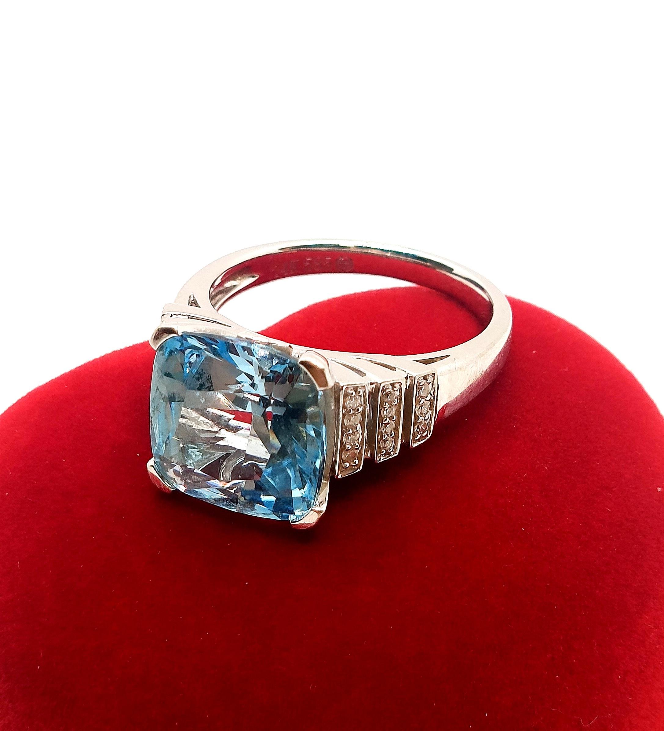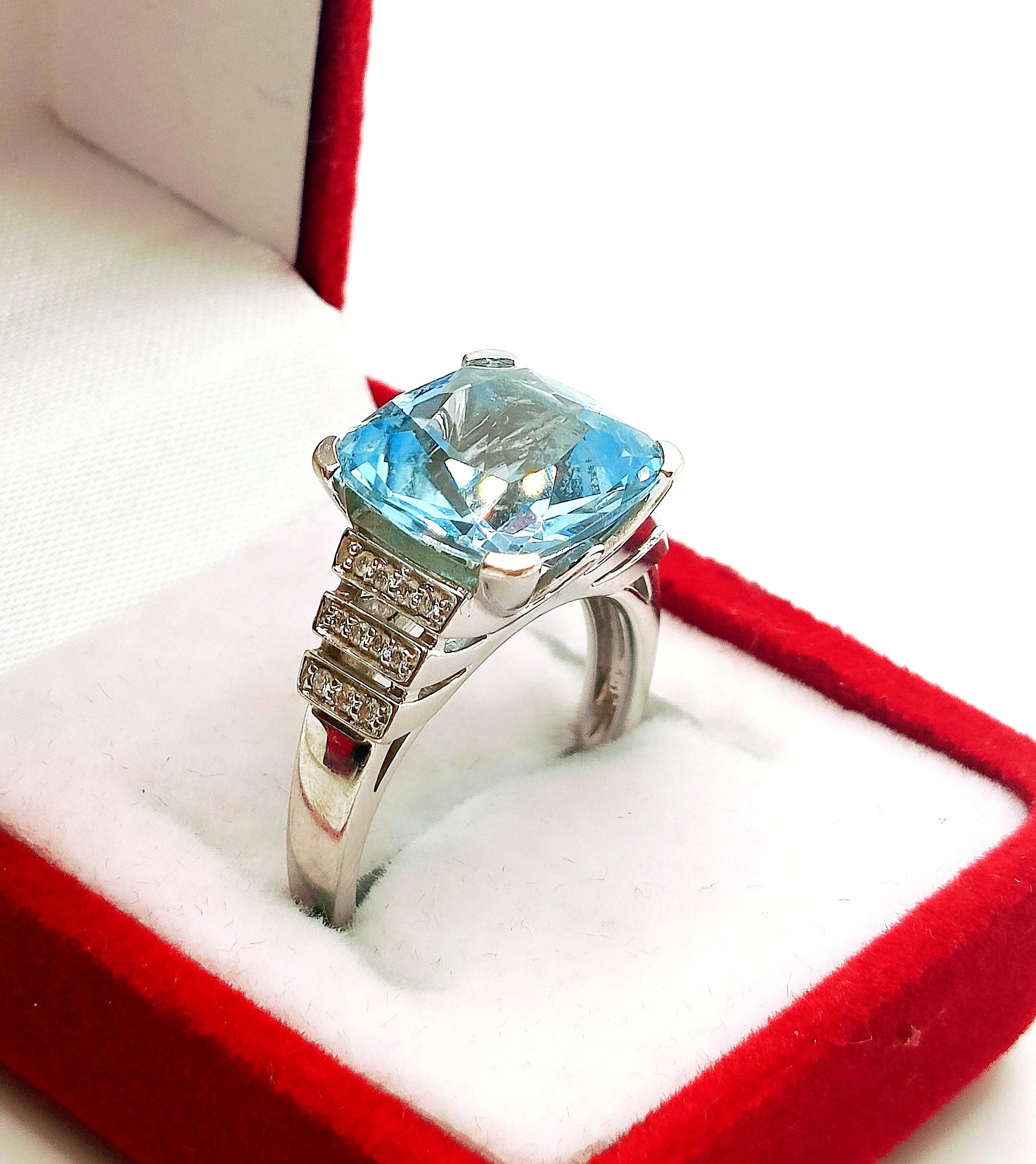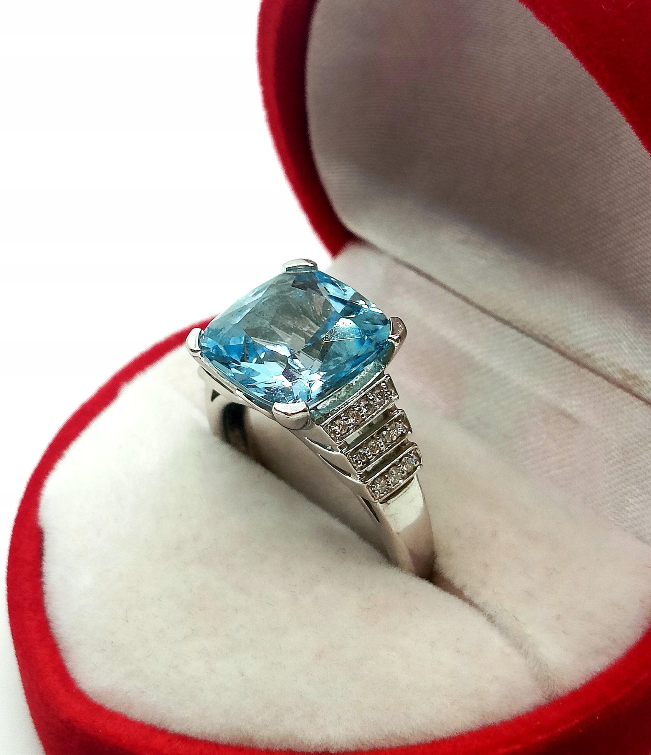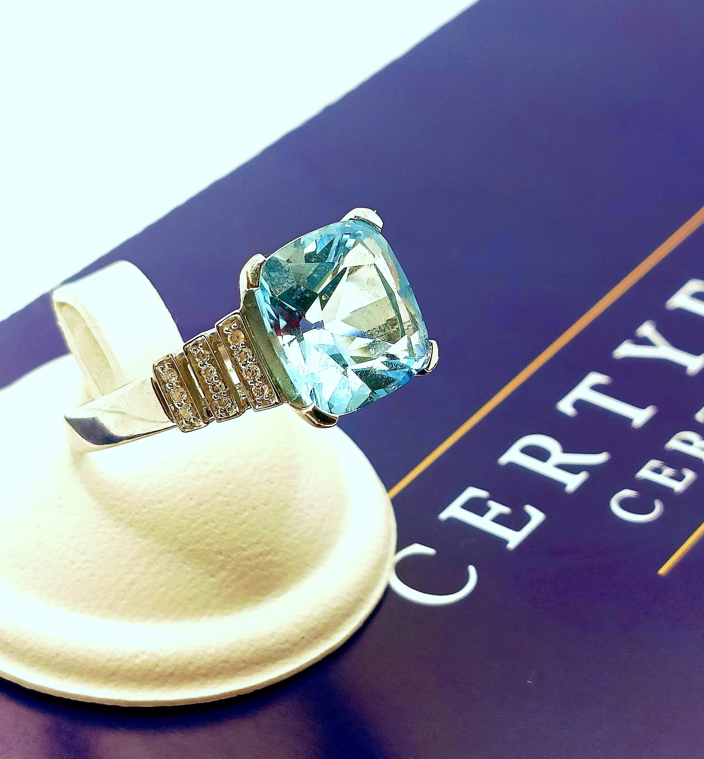 W ofercie na sprzedaż mamy dla Państwa piękny, złoty pierścionek ozdobiony okazałym Akwamarynem oraz diamentami.